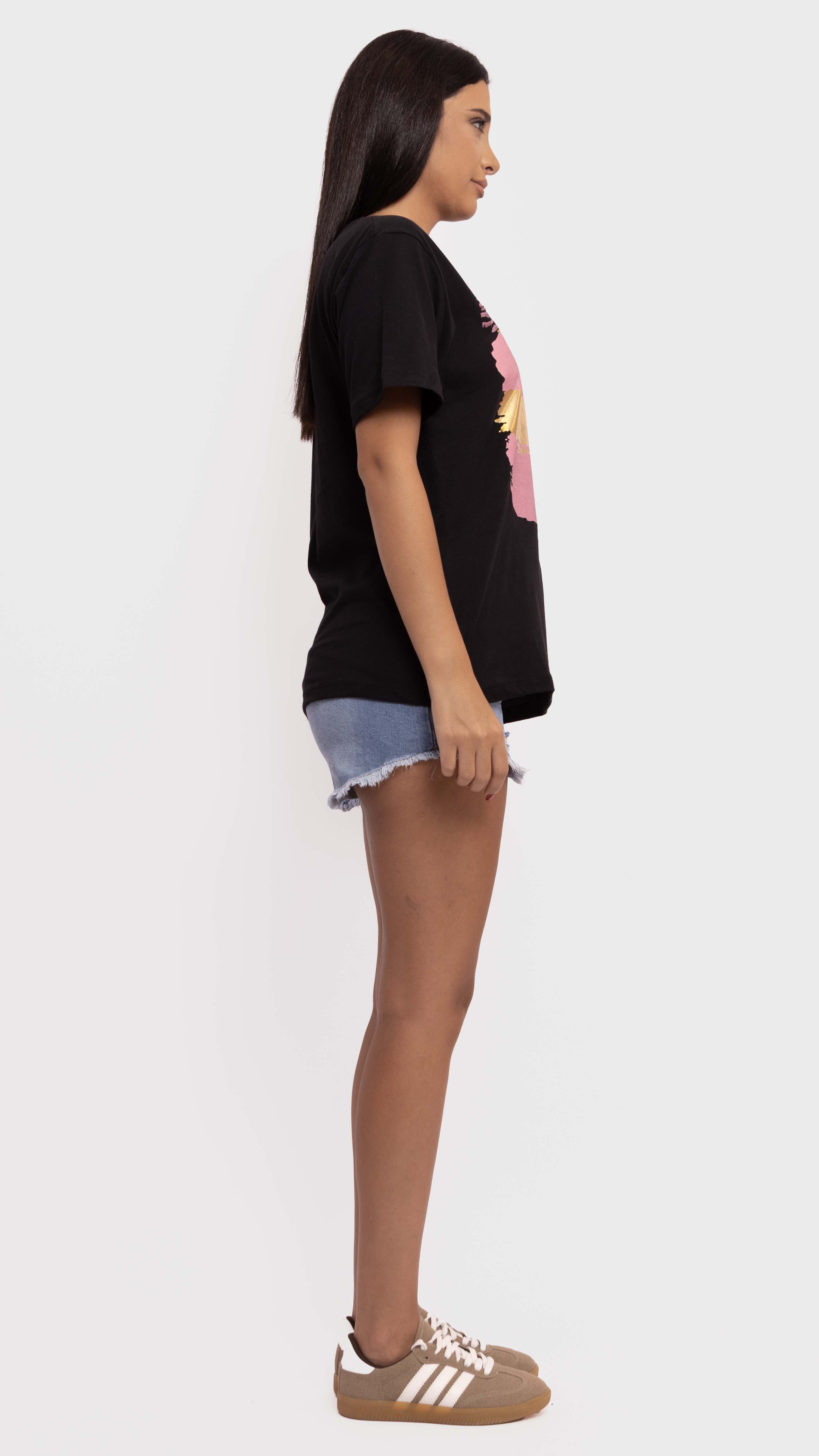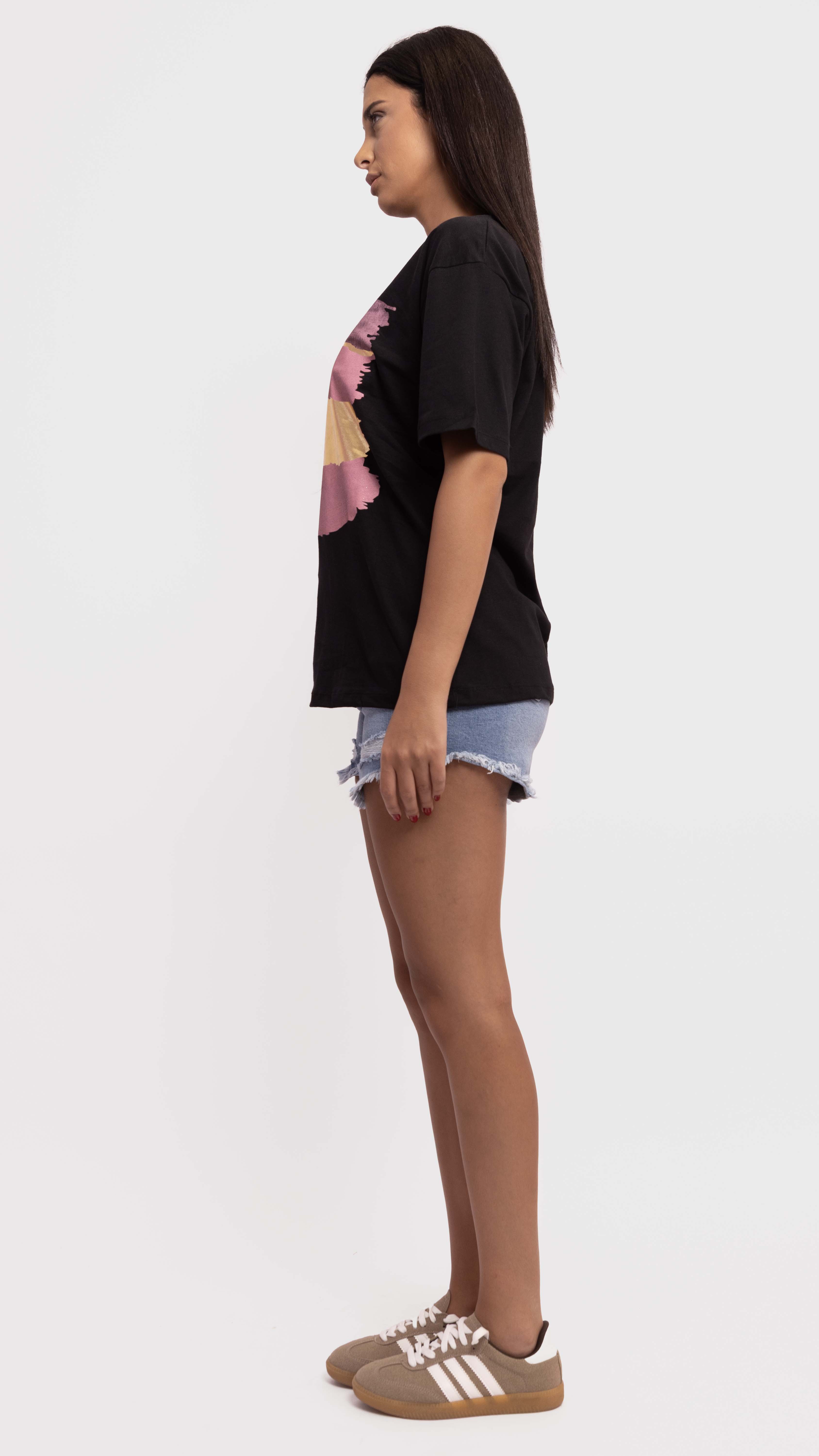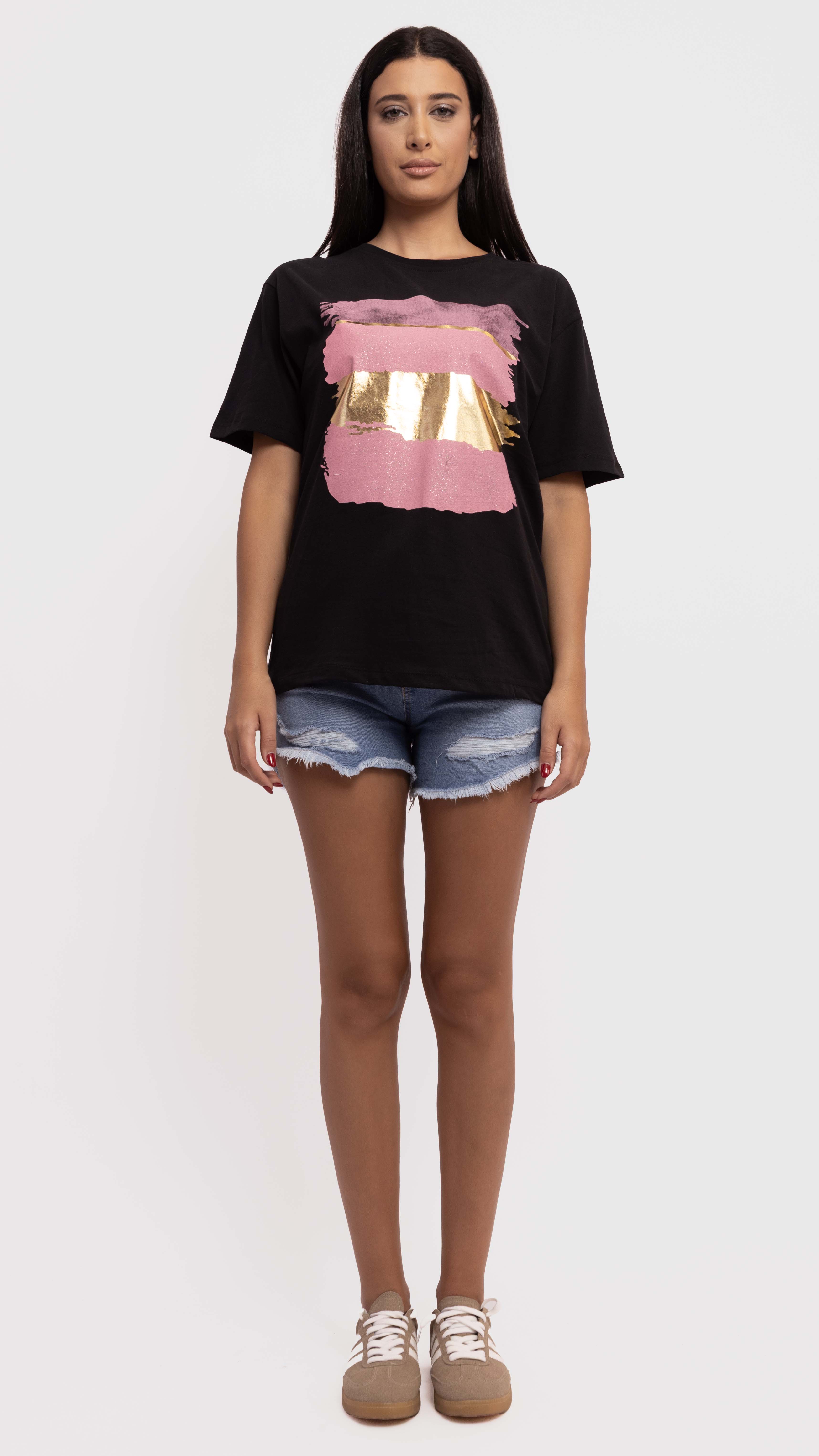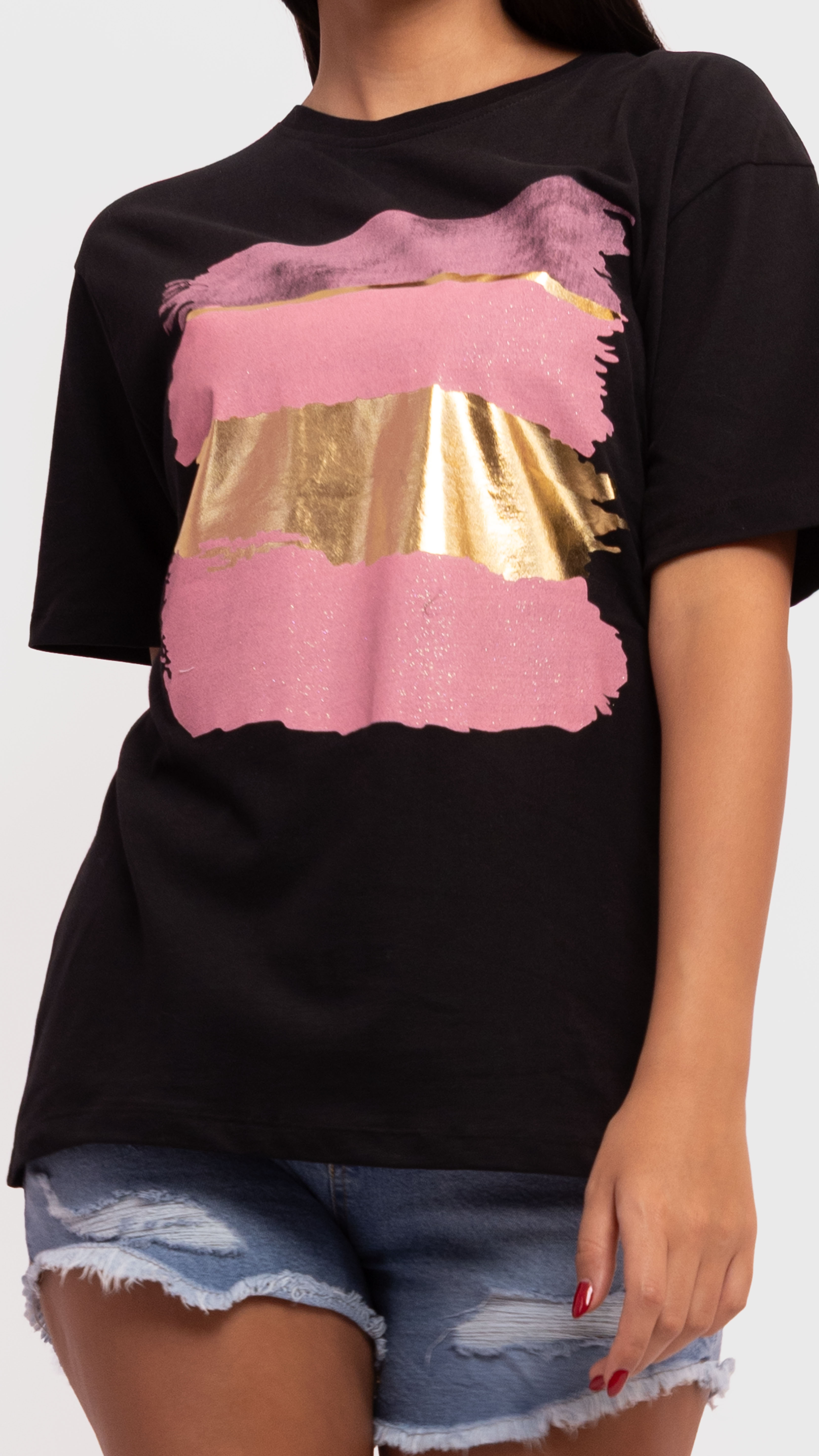 Add an artsy edge to your casual looks with this black graphic tee, featuring bold pink and gold brushstroke prints.