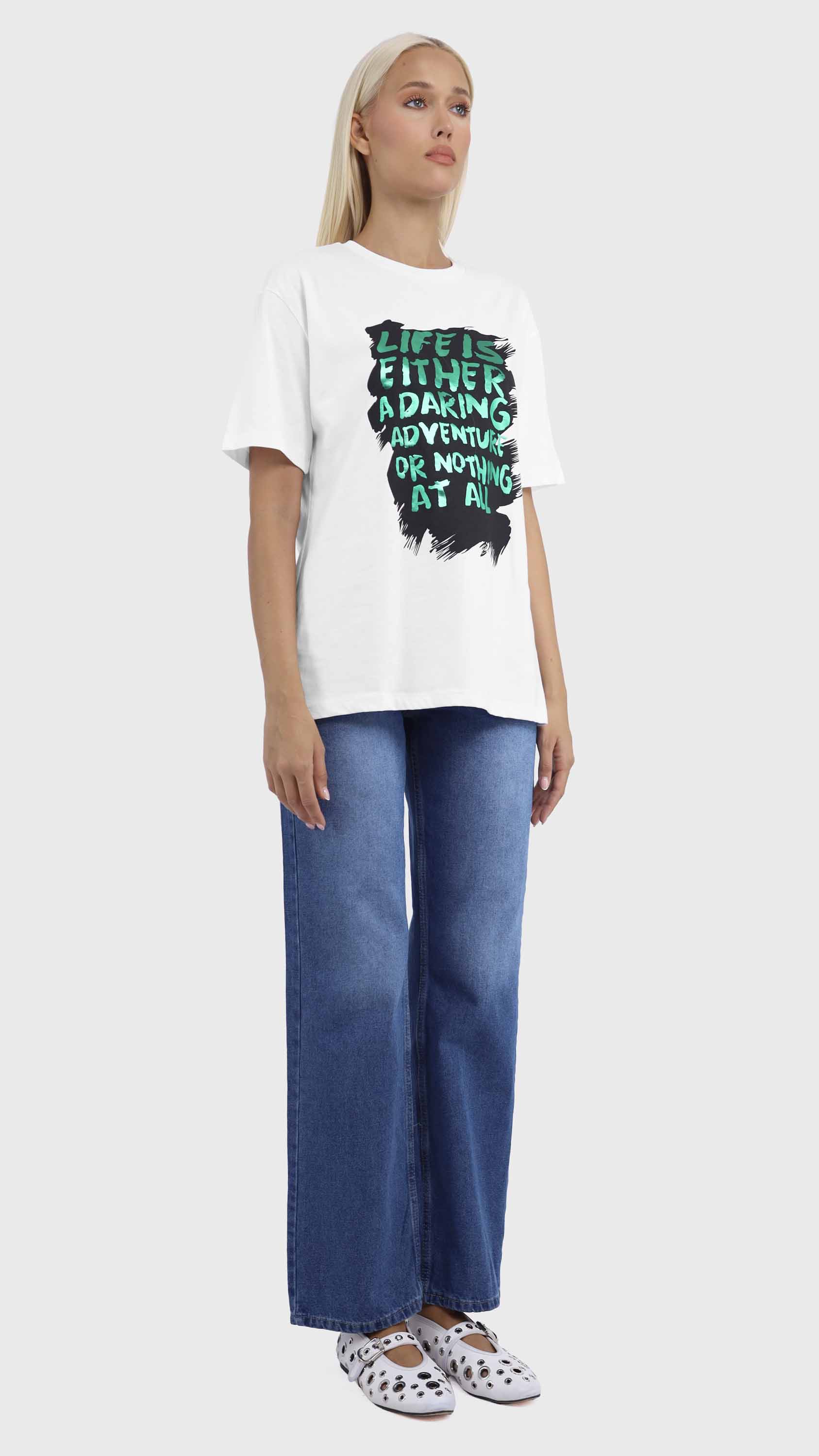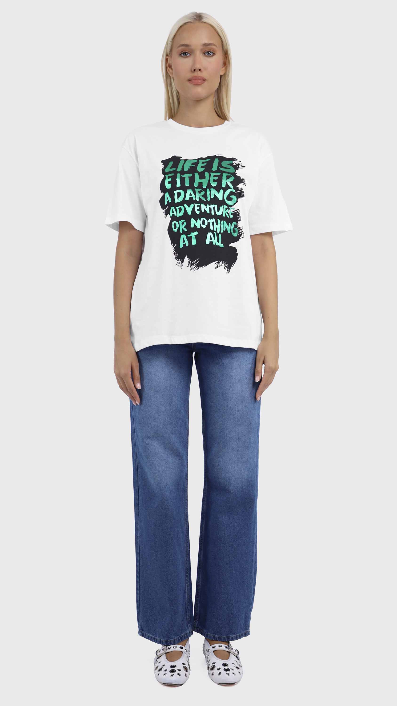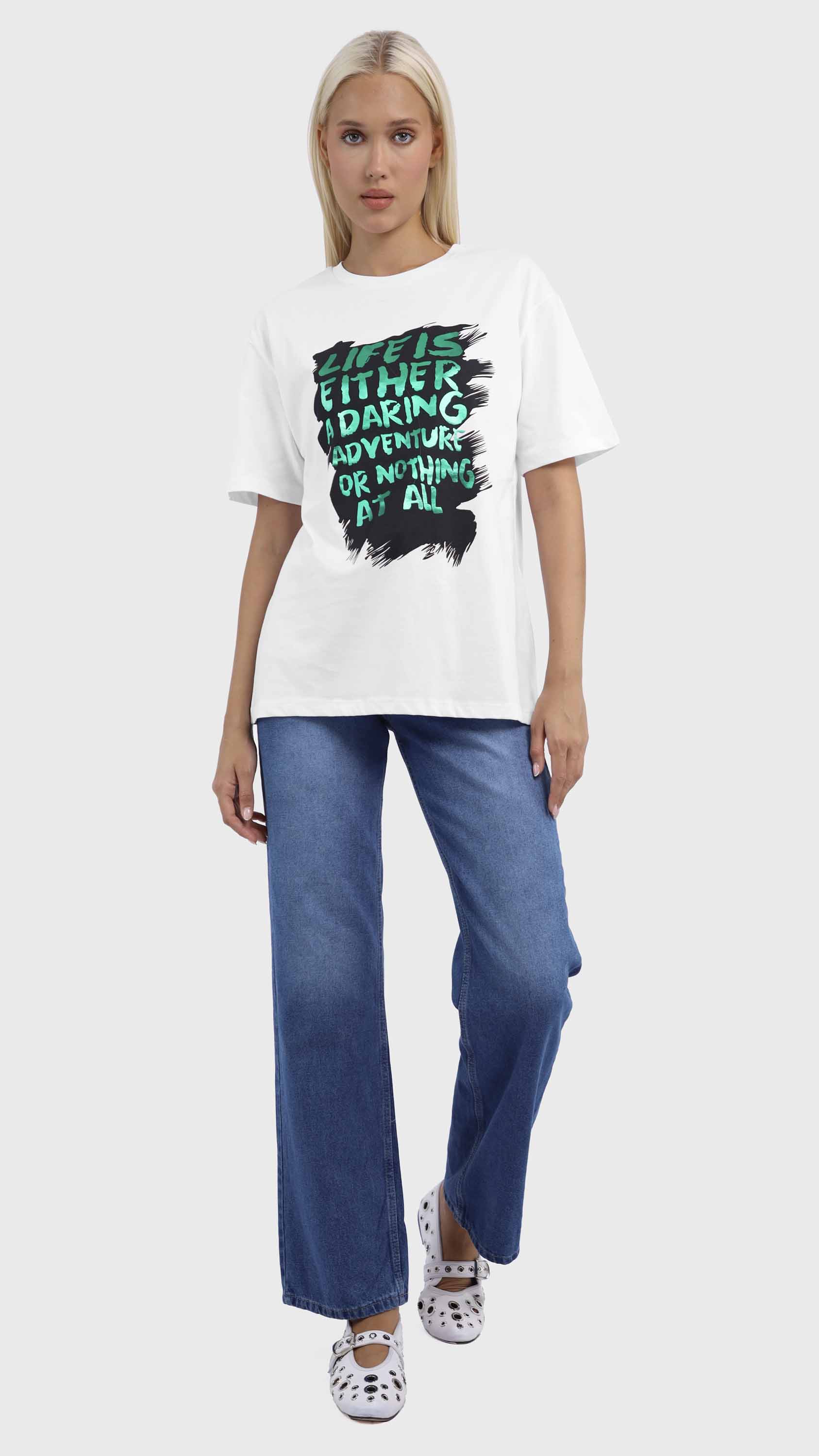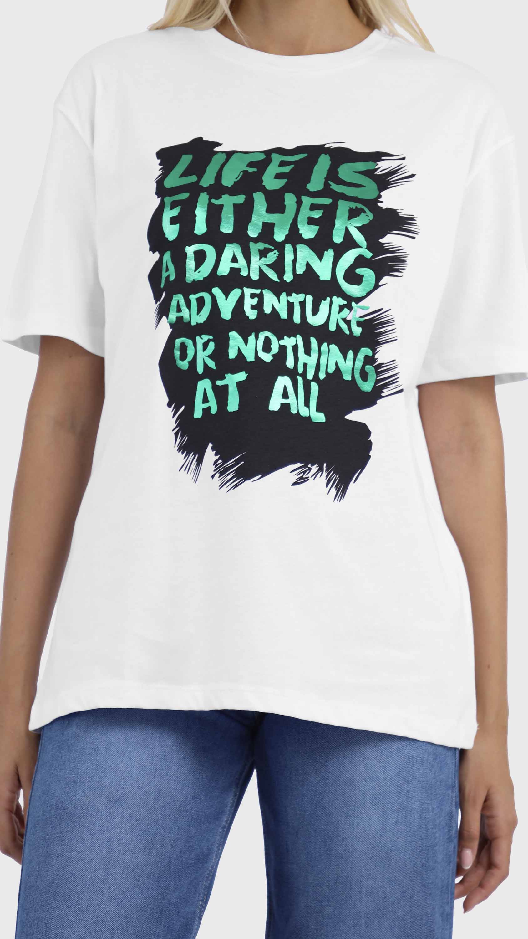 Bring motivation and style together with this Graphic Slogan Tee. Crafted from soft cotton fabric, it features a relaxed fit, classic crew neckline, and short sleeves. The bold green graphic print highlights the inspiring message “Life is either a daring adventure or nothing at all,” making it a perfect choice for confident, everyday looks.