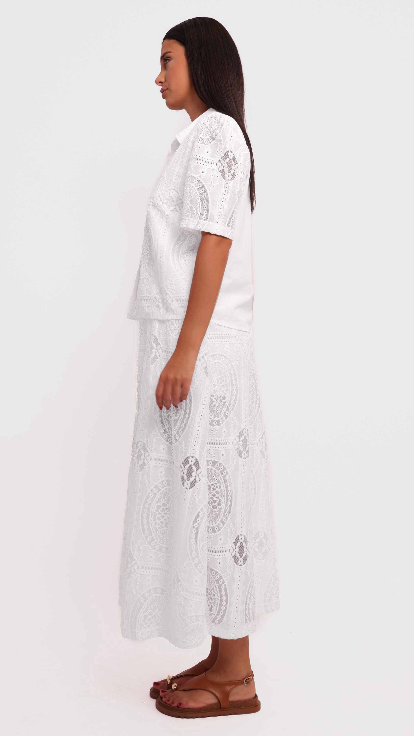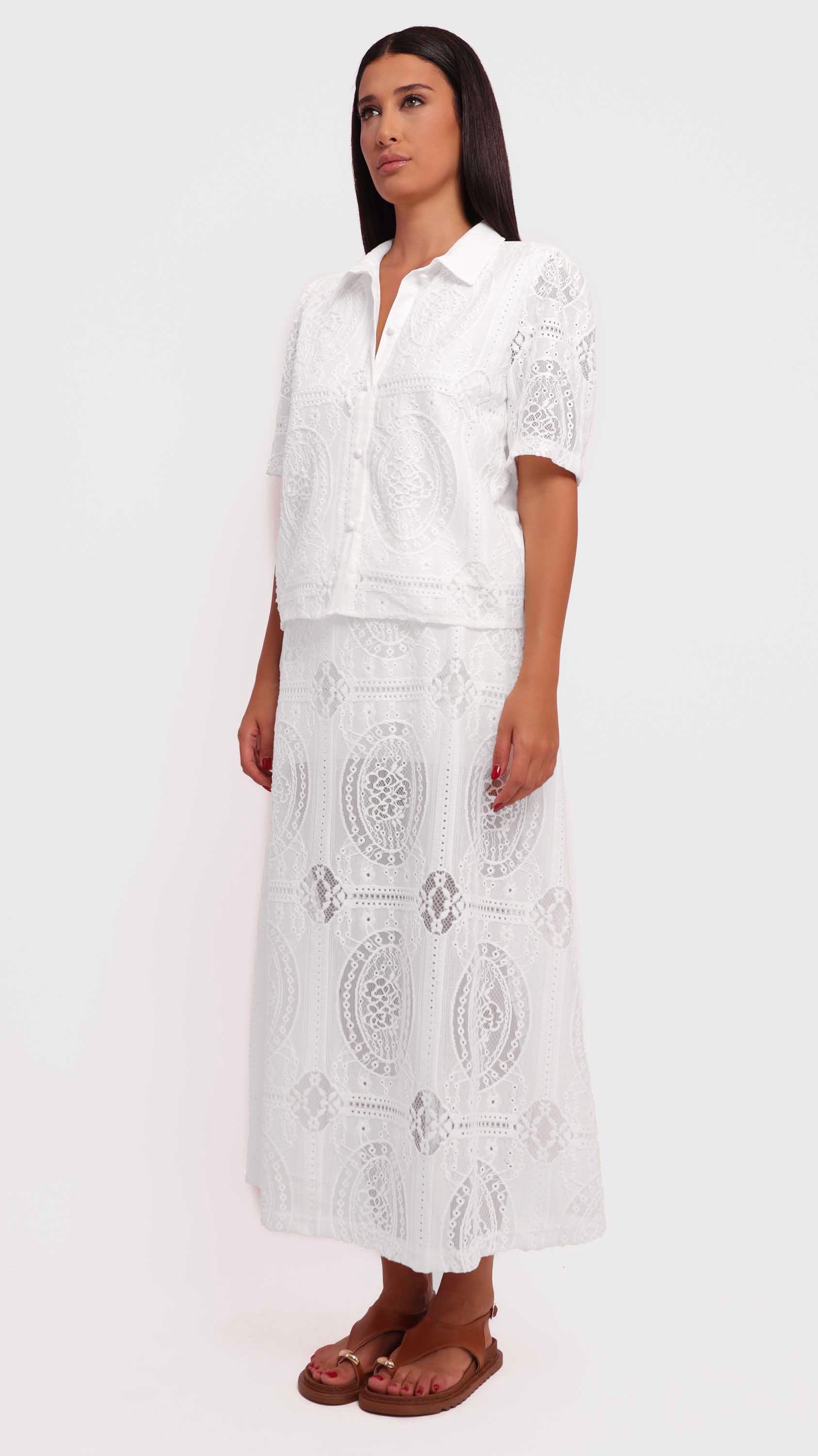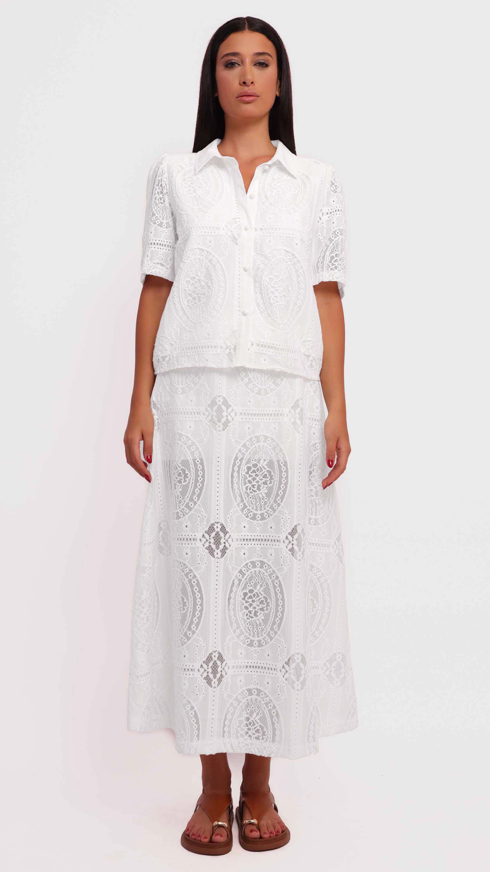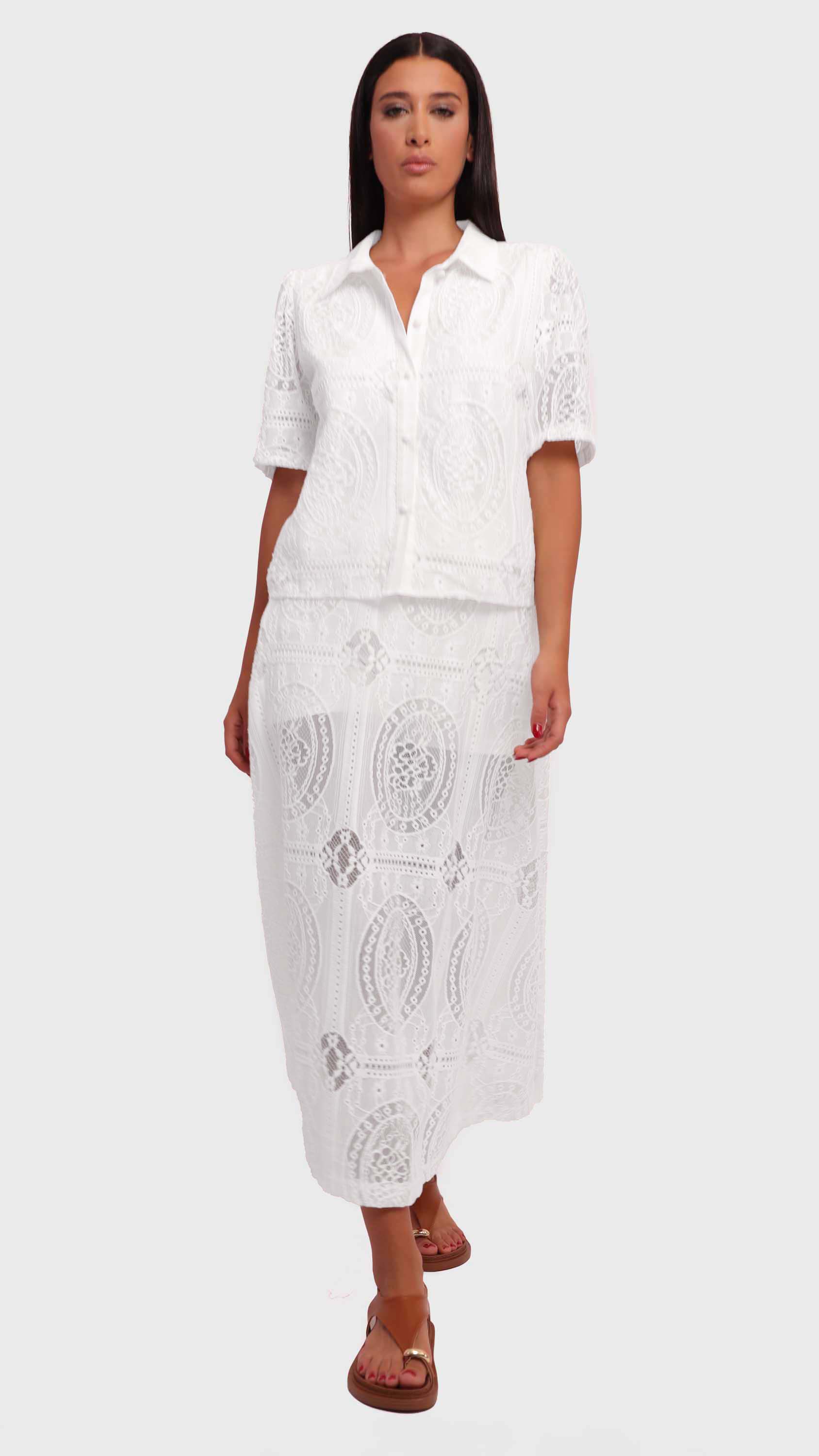 This elegant two-piece set features a short-sleeve button-up shirt and a matching long skirt, both crafted from delicate white lace with intricate embroidery. The shirt has a classic collar and a relaxed fit, complemented by the high-waisted skirt that flows gracefully for a feminine silhouette. Perfect for summer occasions or casual chic outings.