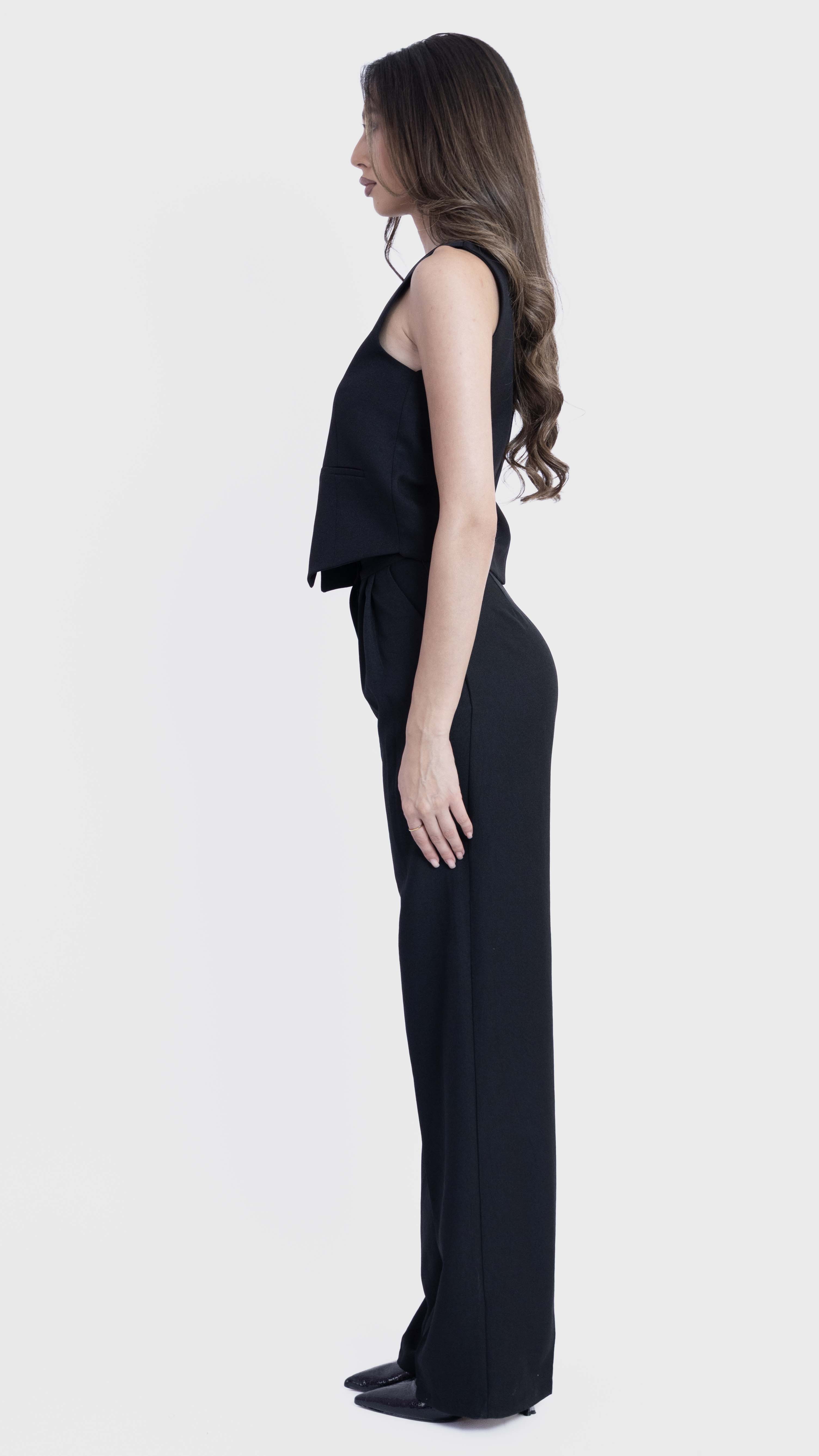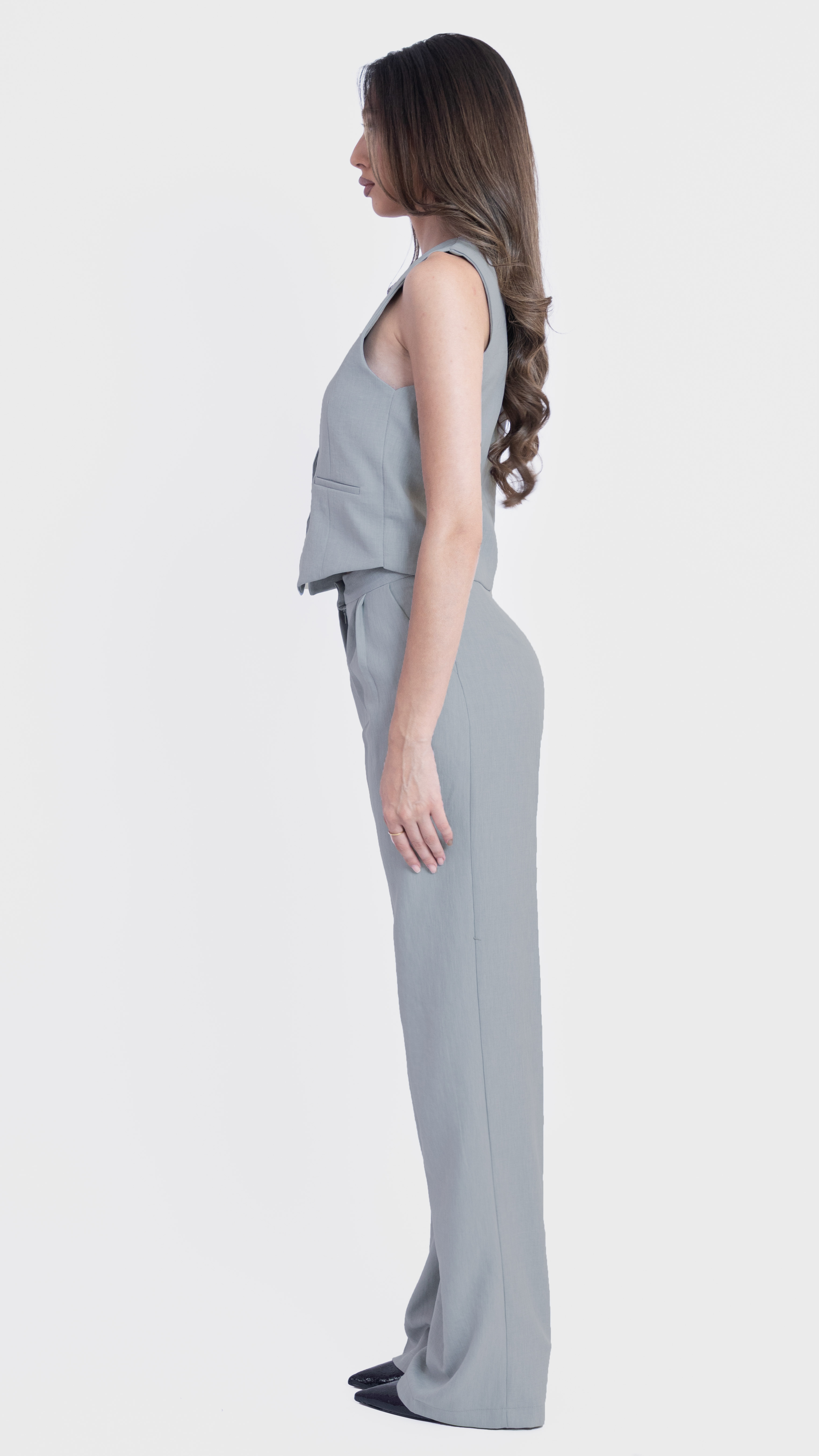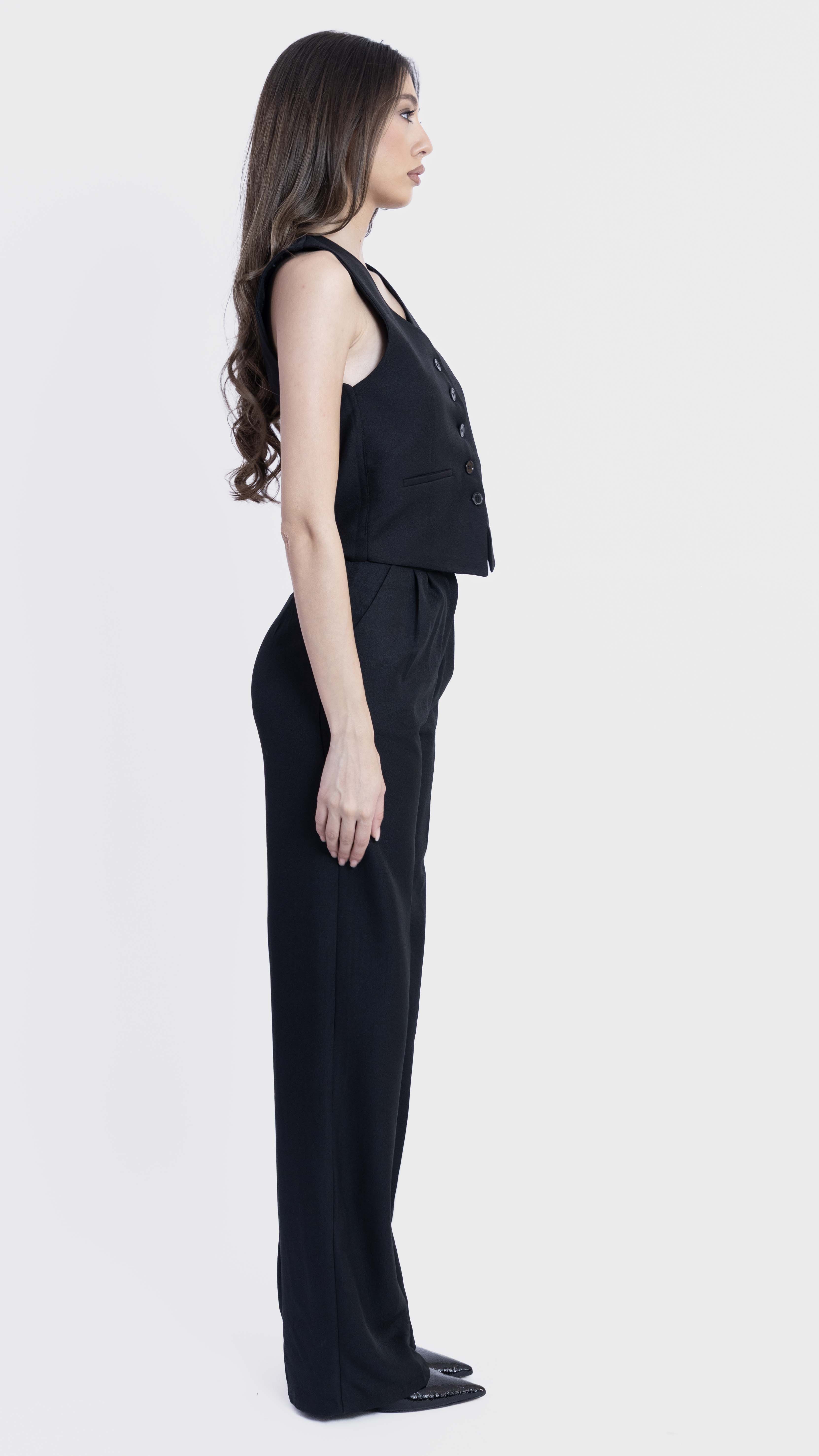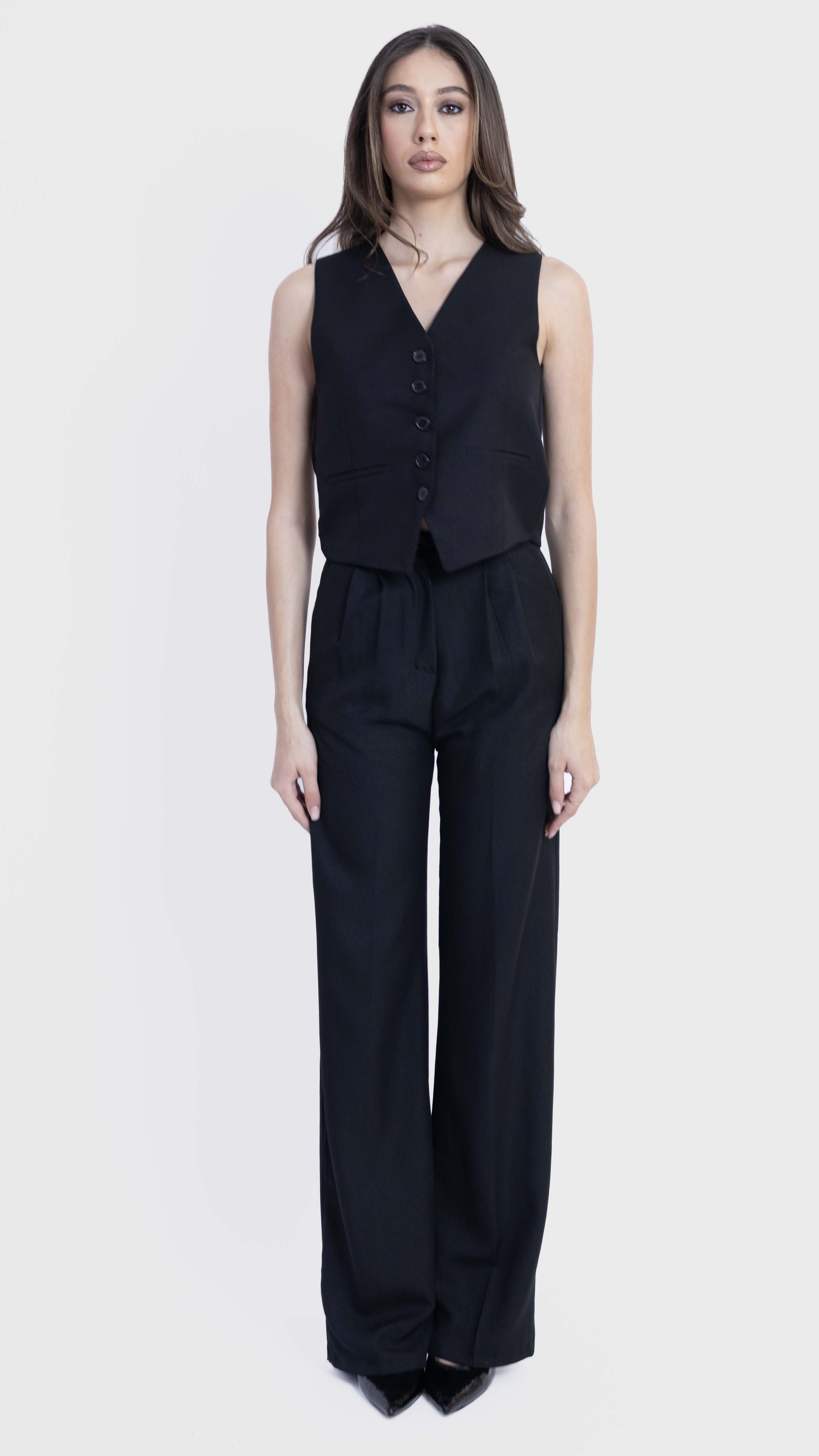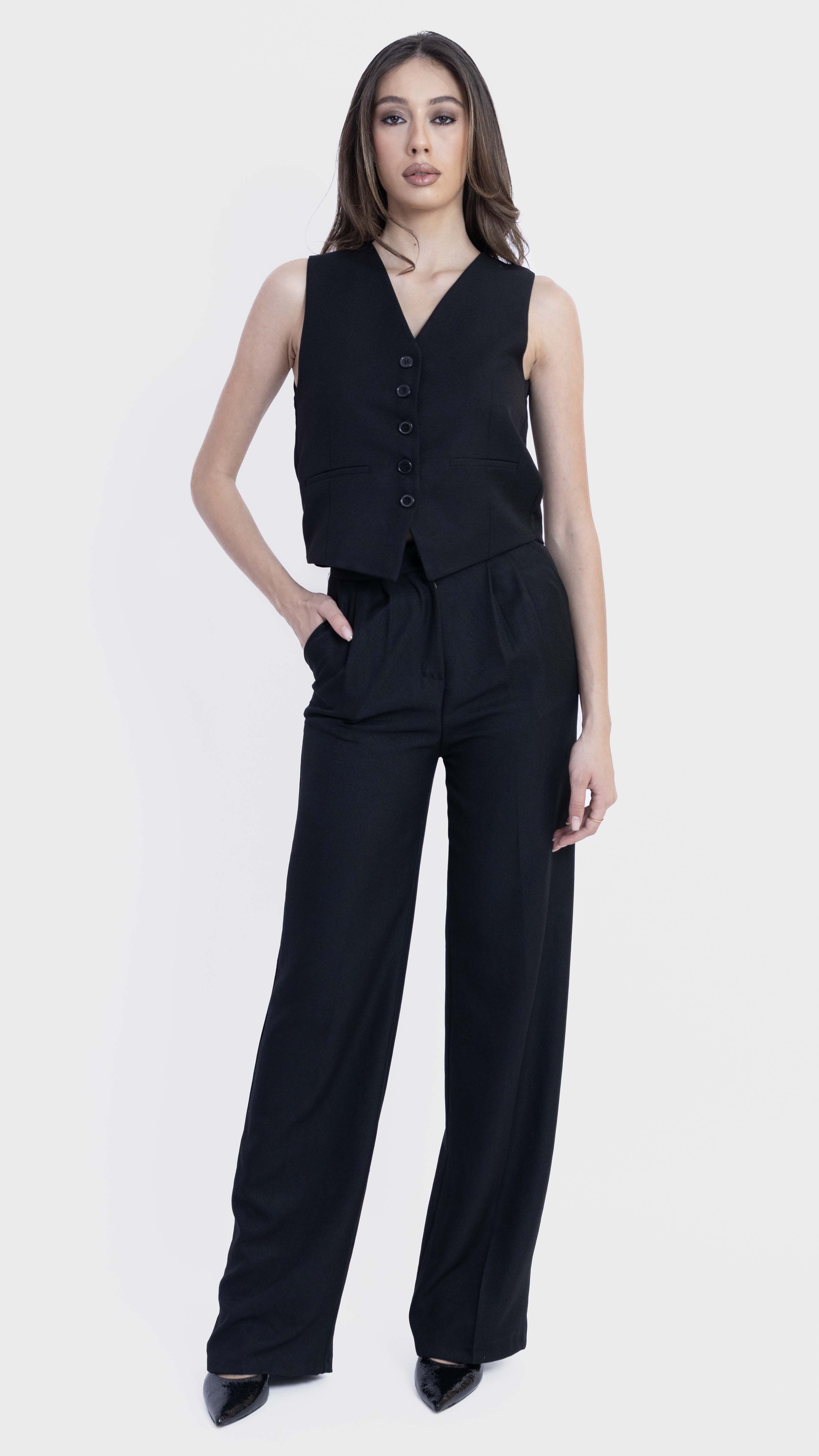 Sleek and sophisticated, this Sleeveless Vest & Wide-Leg Trousers Co-Ord Set is the perfect blend of tailored polish and modern elegance. The vest features a V-neckline, button-down front, and front darts that shape the silhouette, while faux welt pockets add a touch of detail. The matching high-waisted trousers have soft front pleats and a wide-leg cut for graceful movement. Crafted from lightweight suiting fabric with a smooth finish, this set is ideal for both smart-casual and business occasions.
