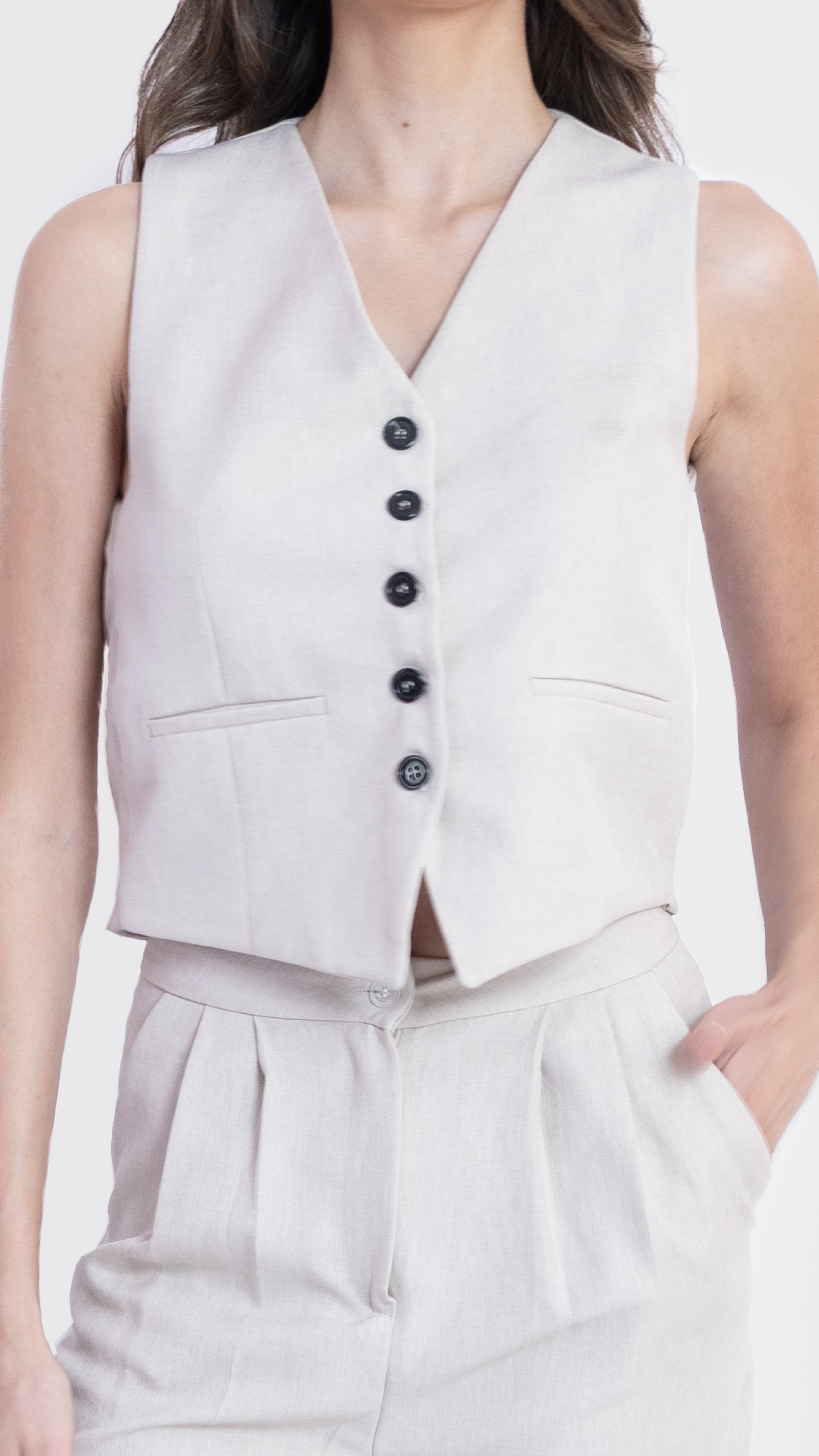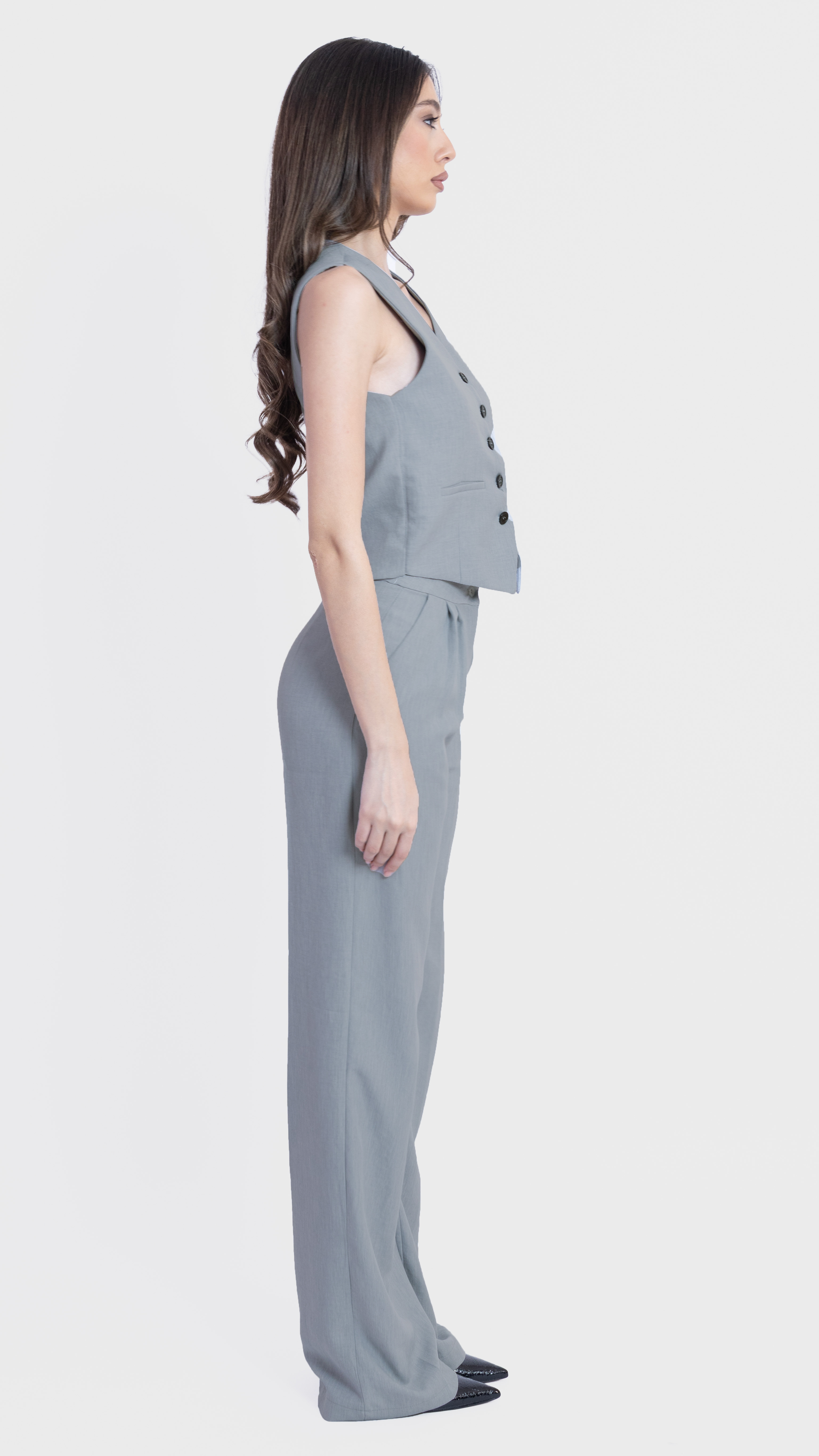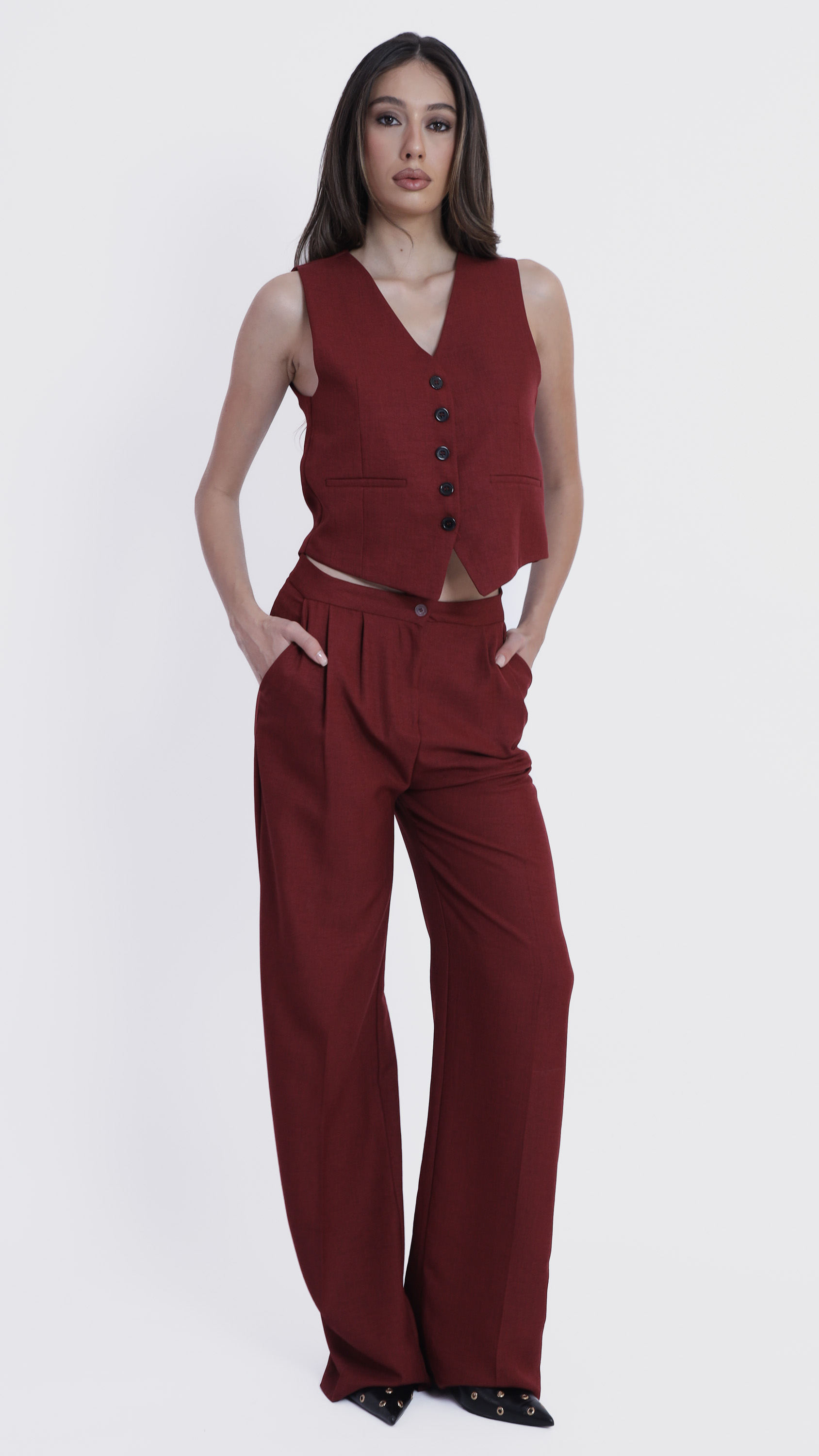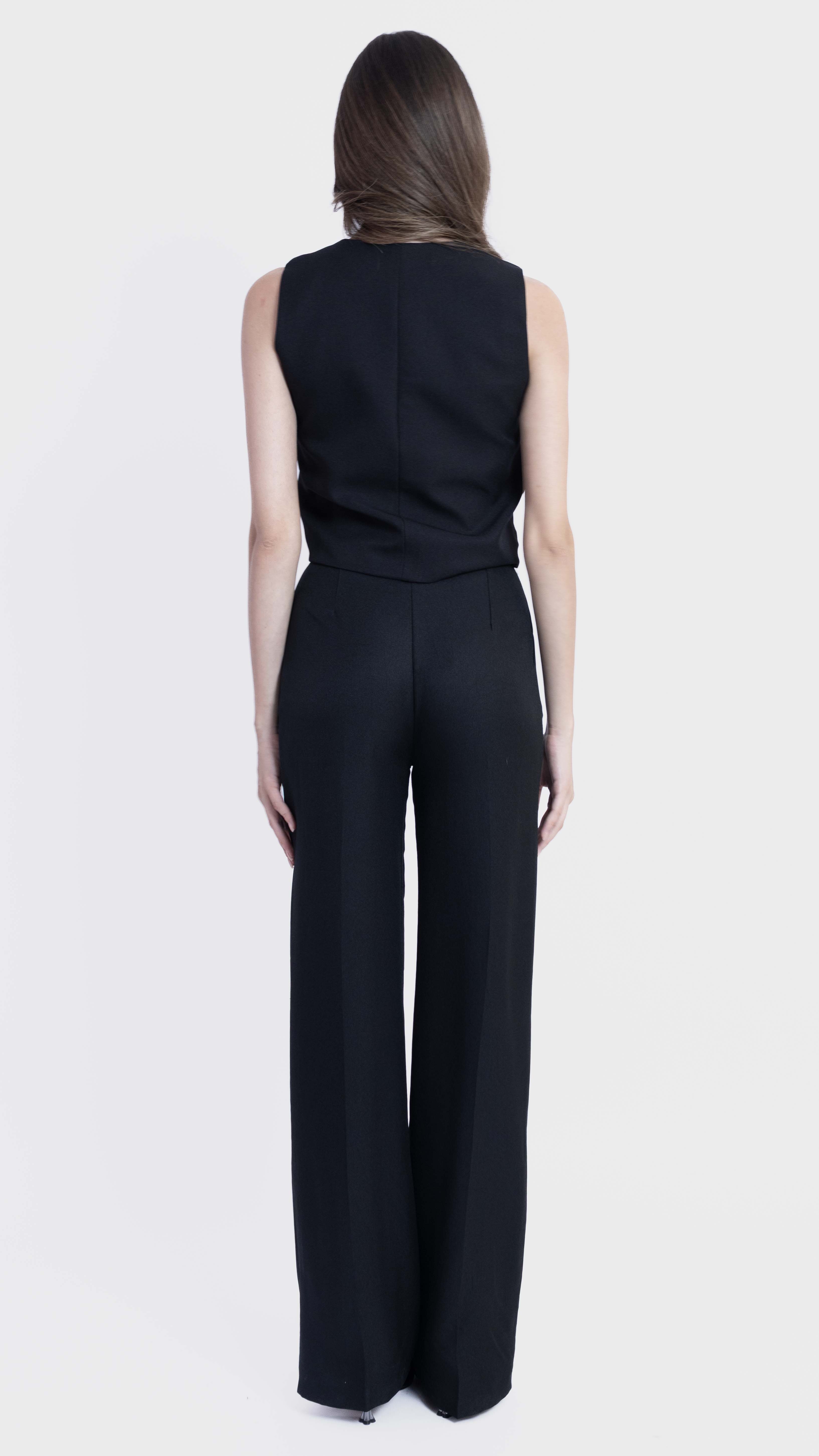 Sleek and sophisticated, this Sleeveless Vest & Wide-Leg Trousers Co-Ord Set is the perfect blend of tailored polish and modern elegance. The vest features a V-neckline, button-down front, and front darts that shape the silhouette, while faux welt pockets add a touch of detail. The matching high-waisted trousers have soft front pleats and a wide-leg cut for graceful movement. Crafted from lightweight suiting fabric with a smooth finish, this set is ideal for both smart-casual and business occasions.