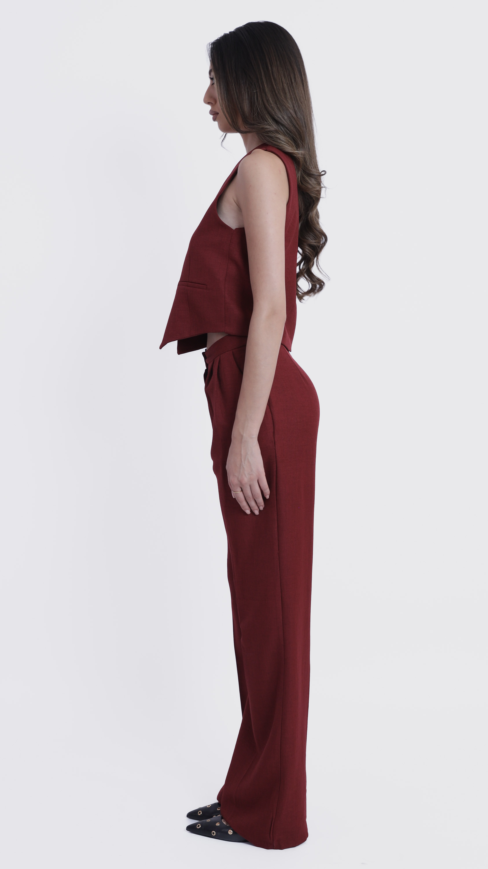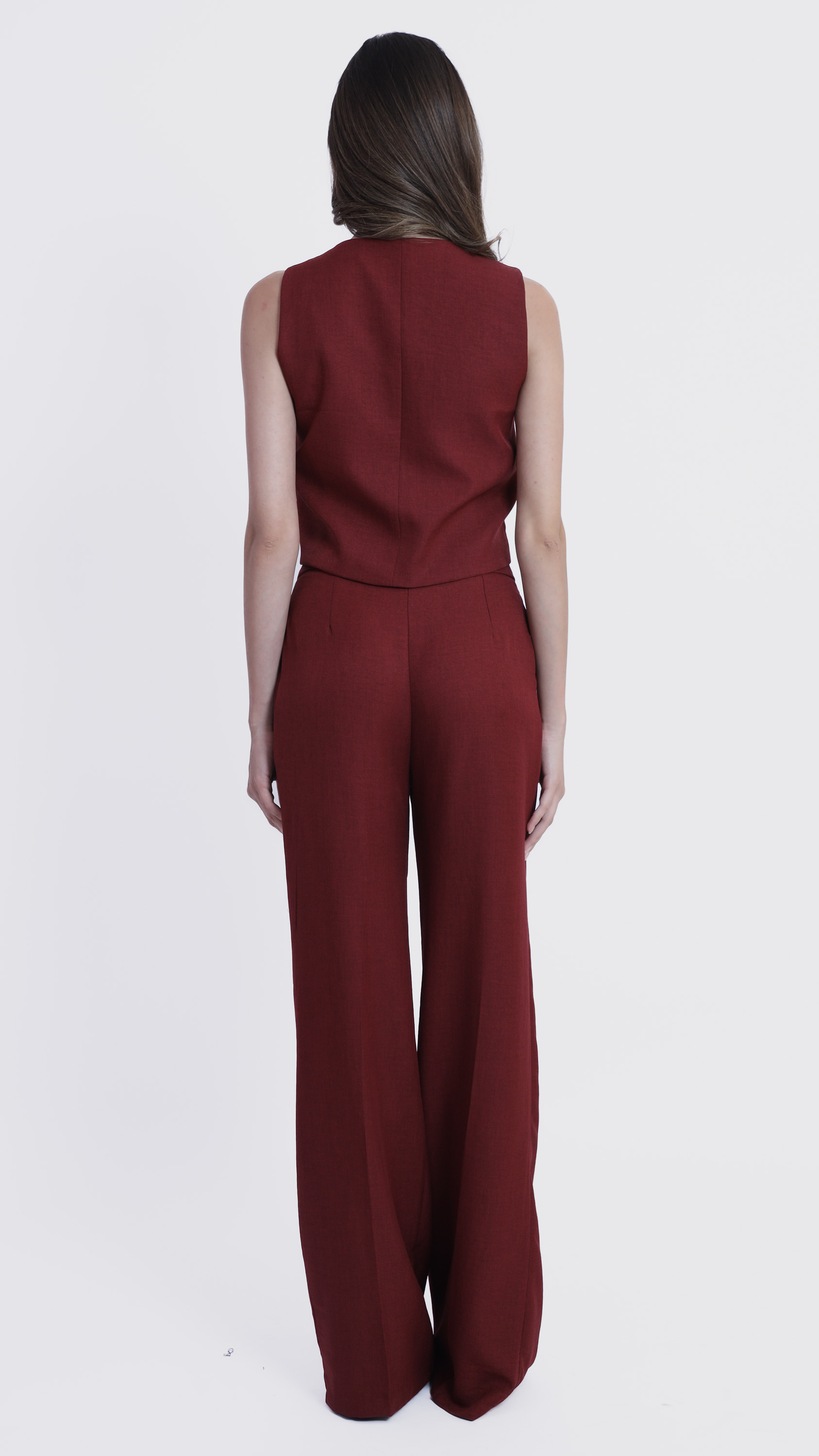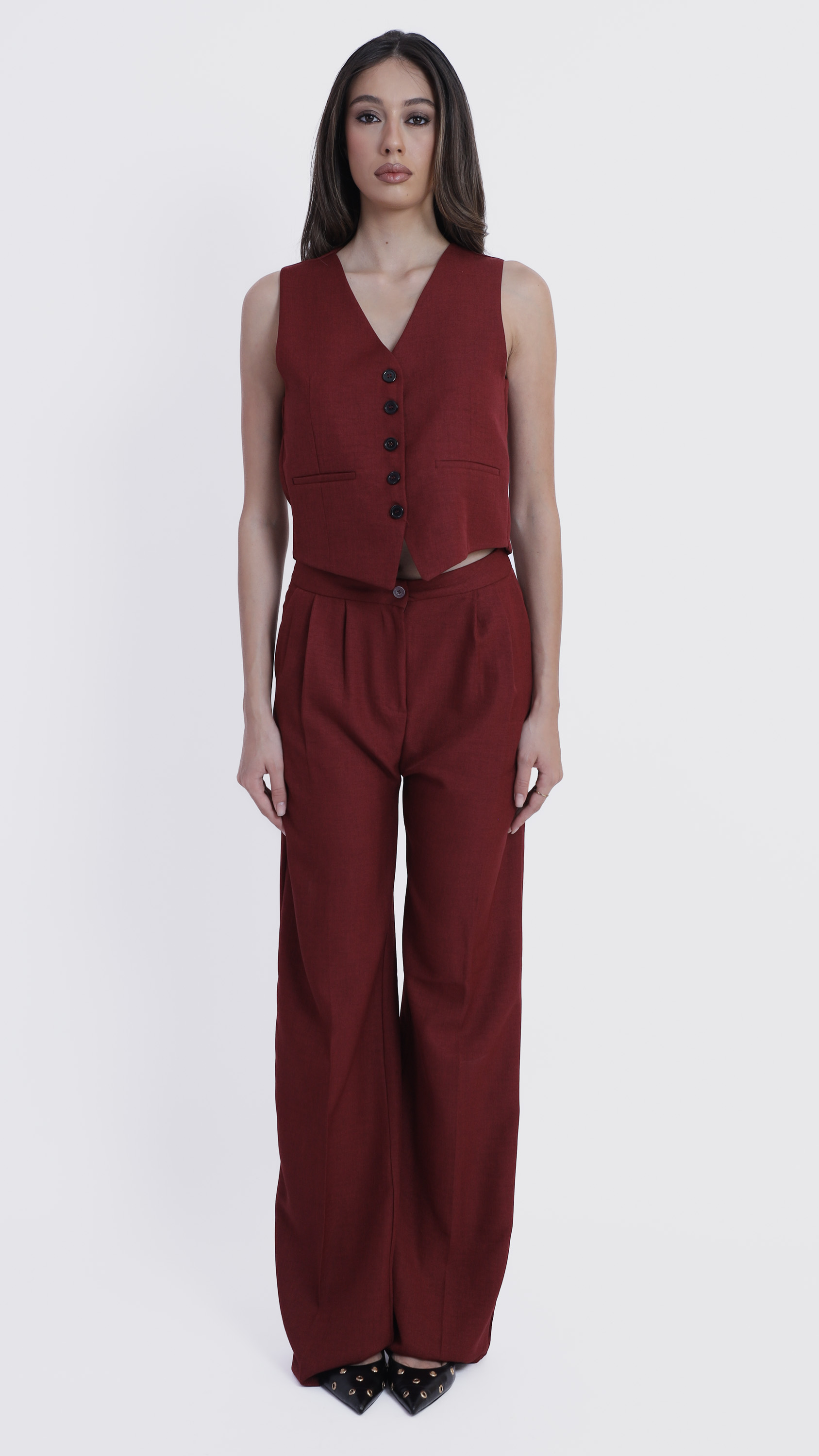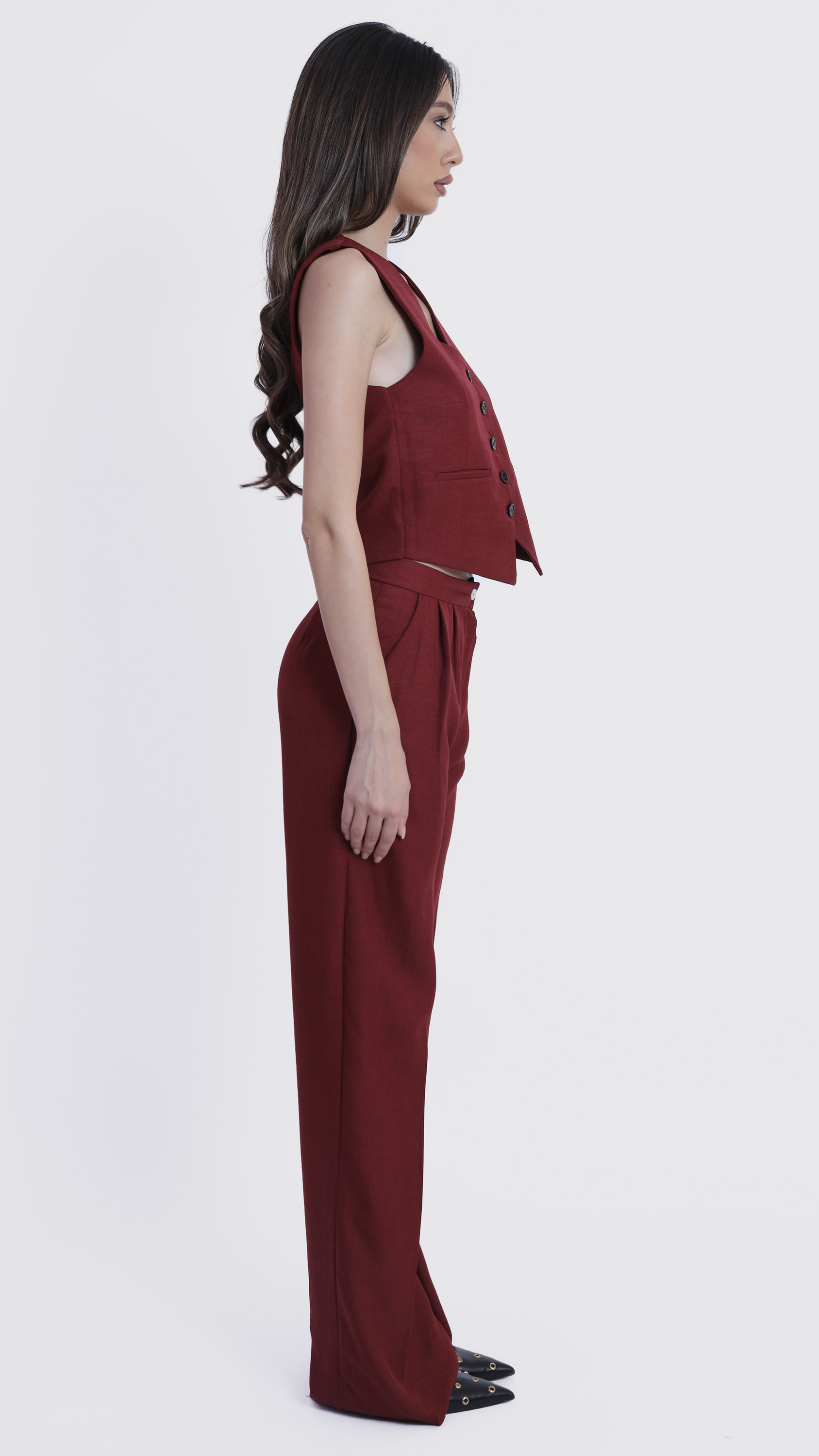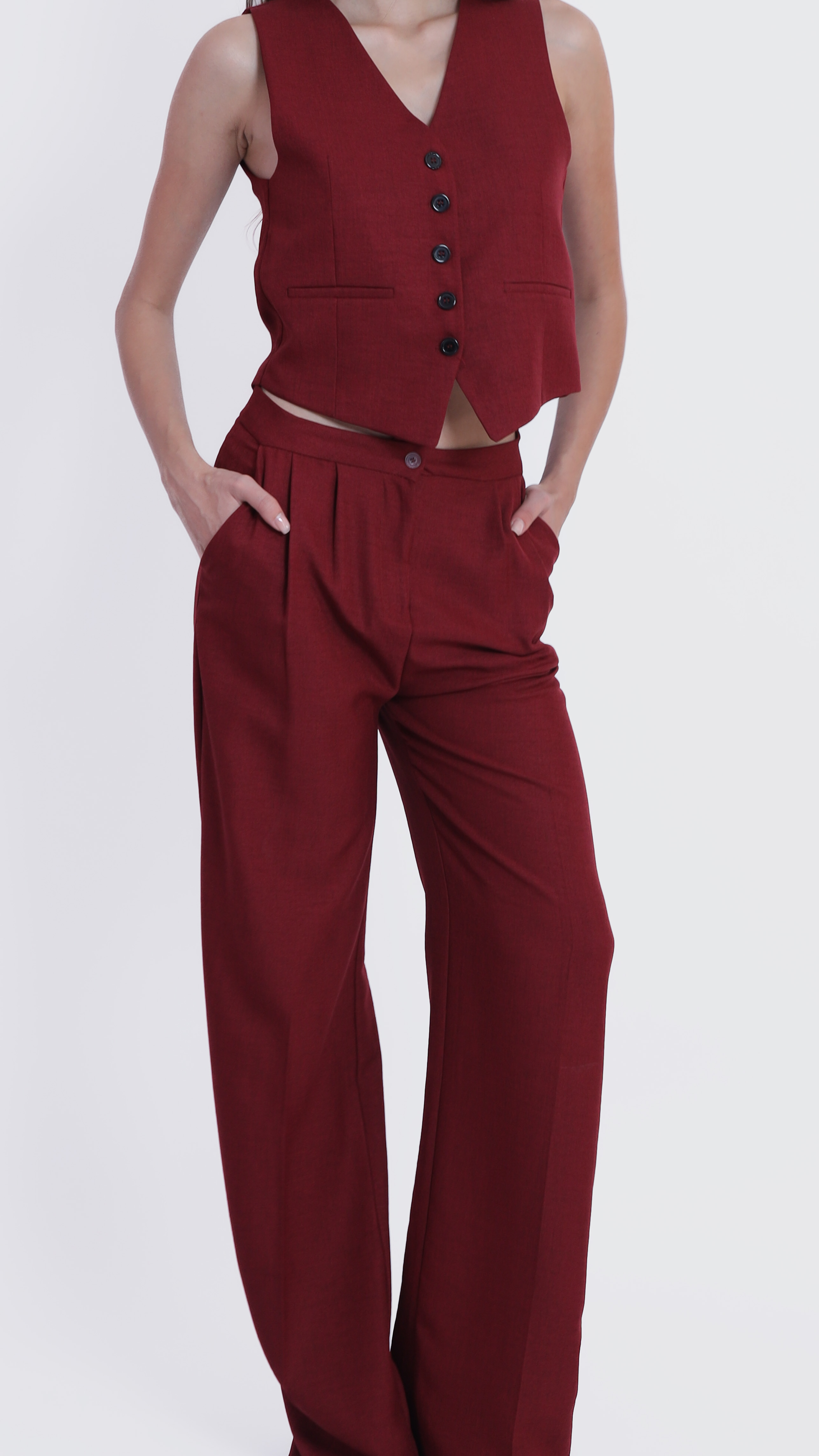 Sleek and sophisticated, this Sleeveless Vest & Wide-Leg Trousers Co-Ord Set is the perfect blend of tailored polish and modern elegance. The vest features a V-neckline, button-down front, and front darts that shape the silhouette, while faux welt pockets add a touch of detail. The matching high-waisted trousers have soft front pleats and a wide-leg cut for graceful movement. Crafted from lightweight suiting fabric with a smooth finish, this set is ideal for both smart-casual and business occasions.