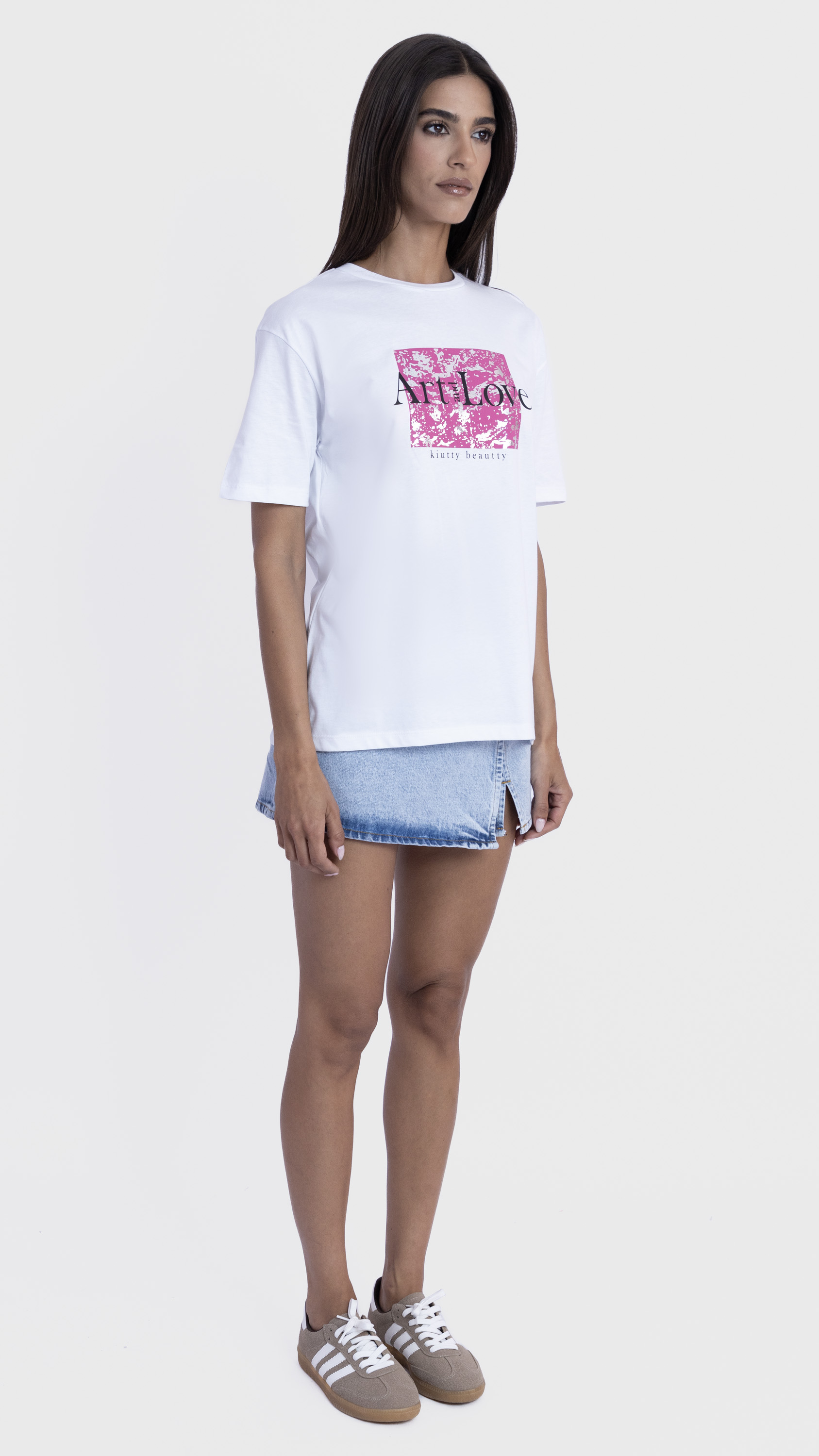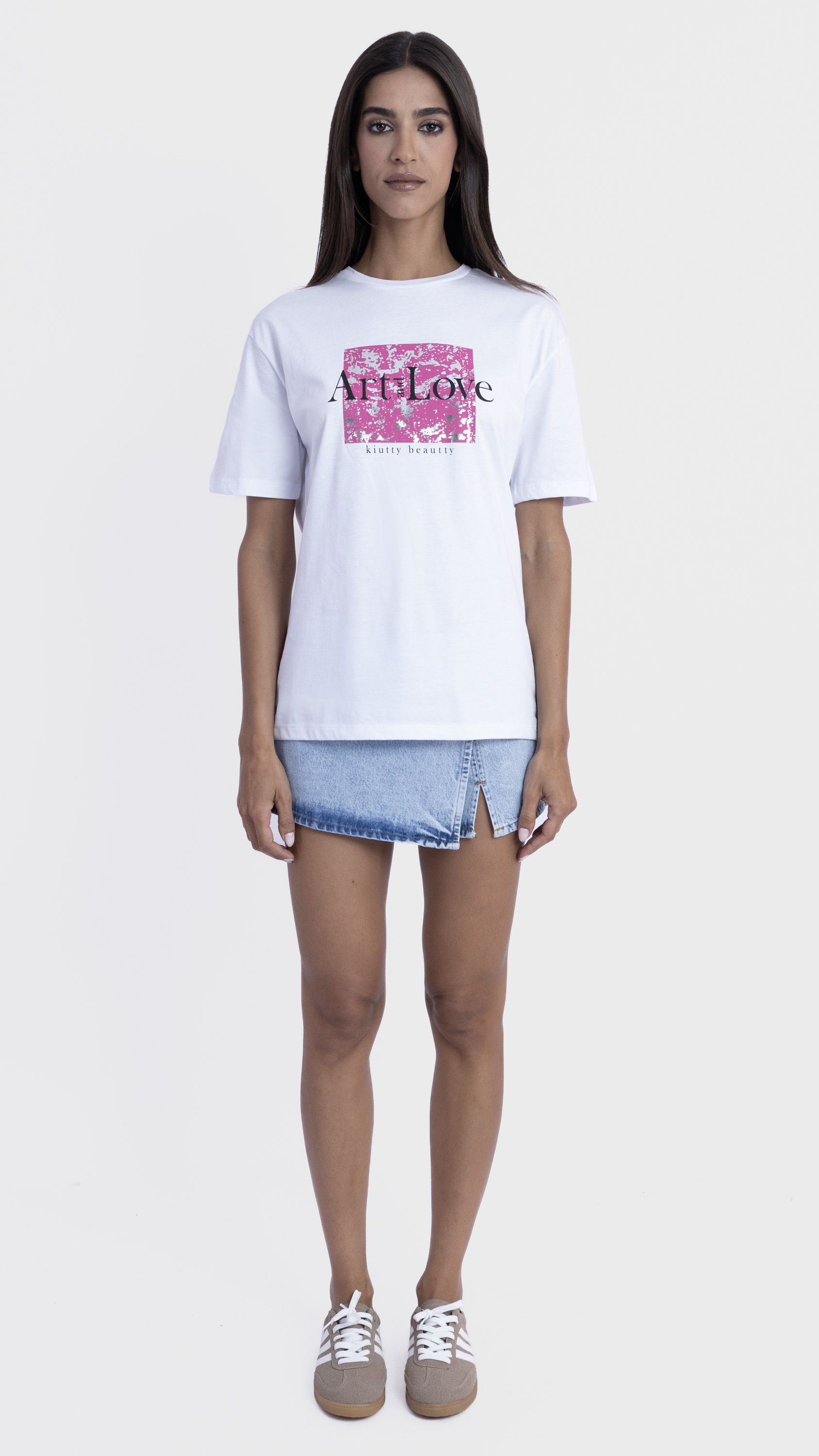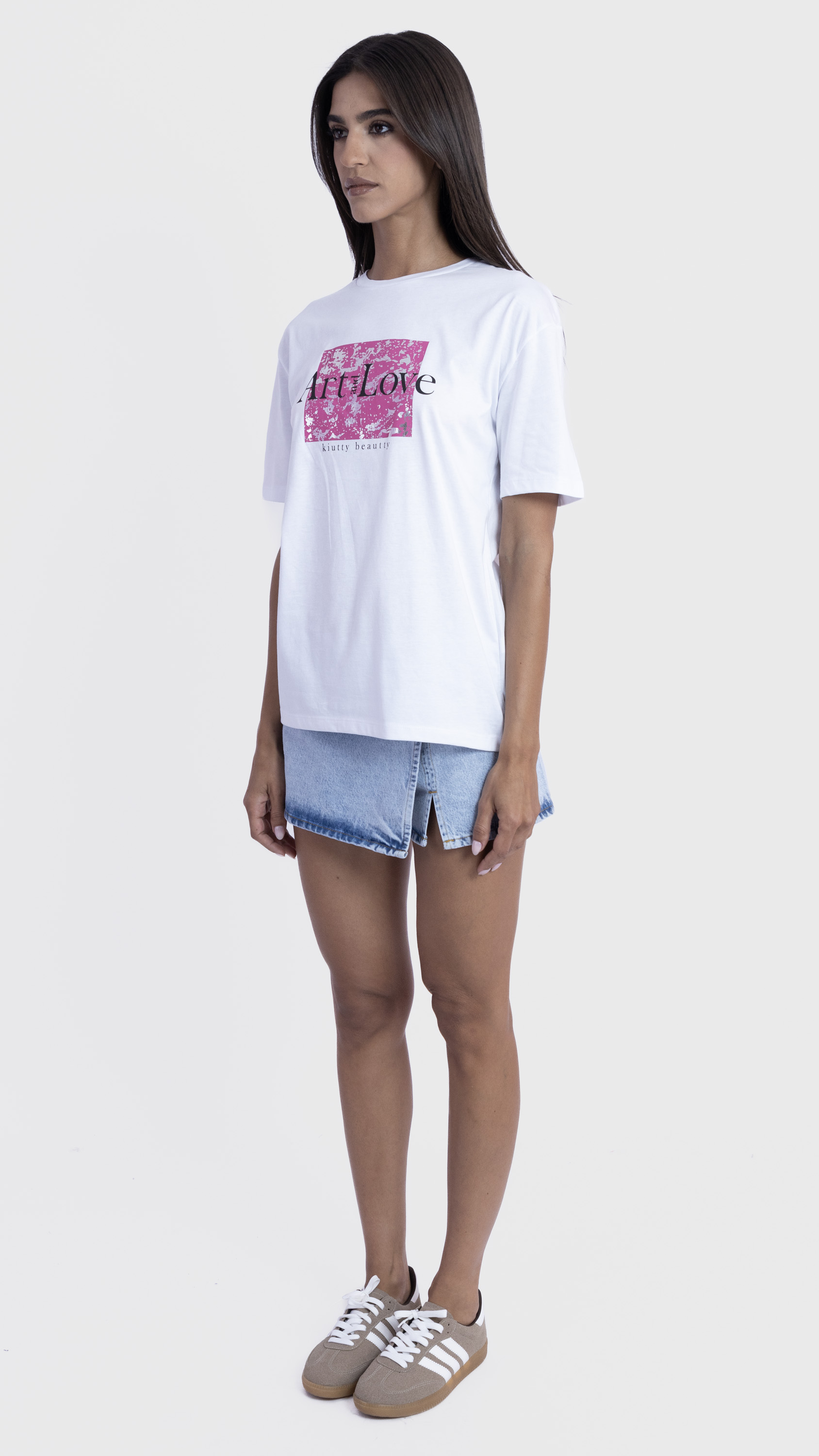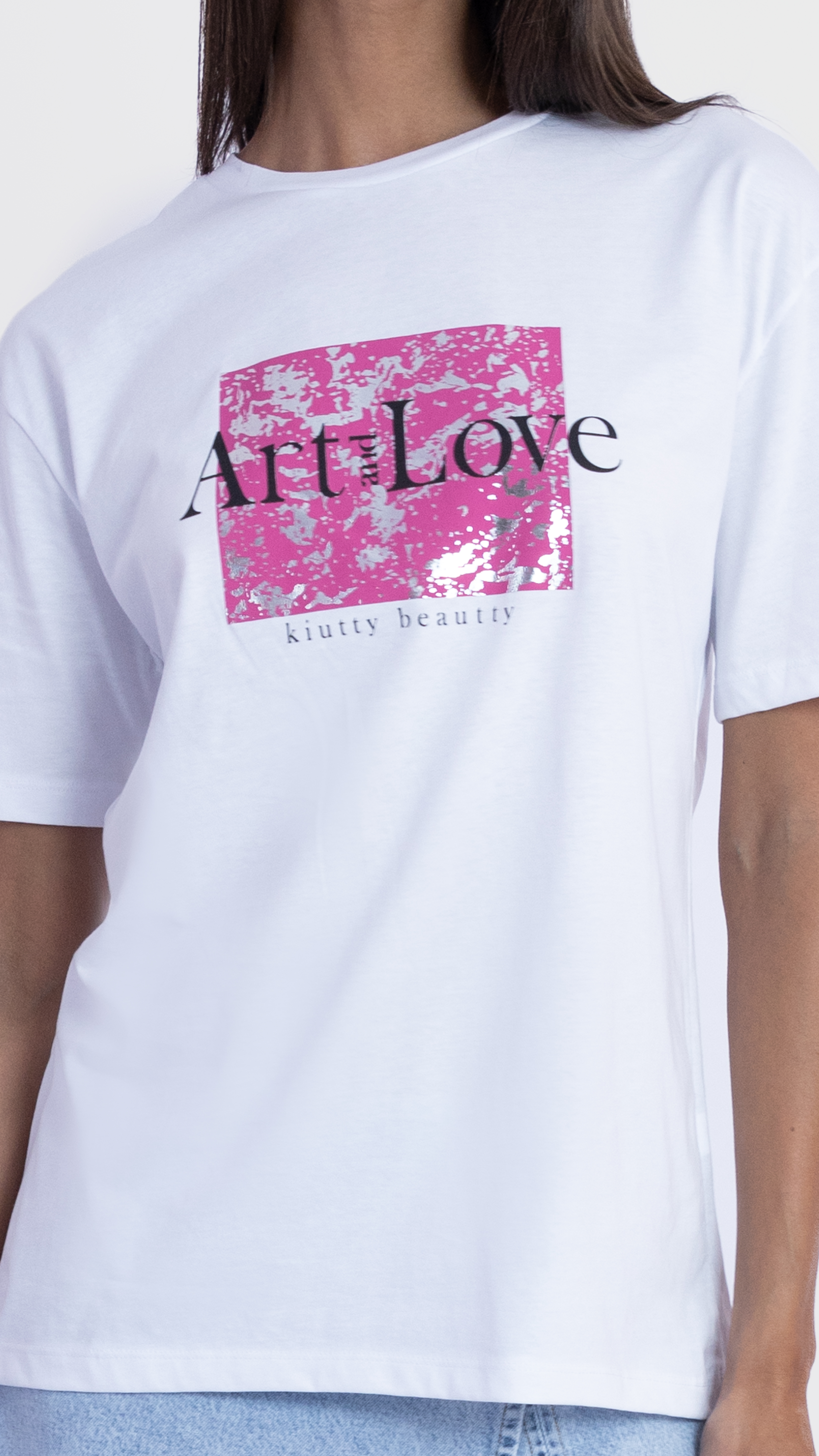 Express your creativity in this Graphic Print Tee featuring an abstract pink artwork with the bold statement “Art Love.”