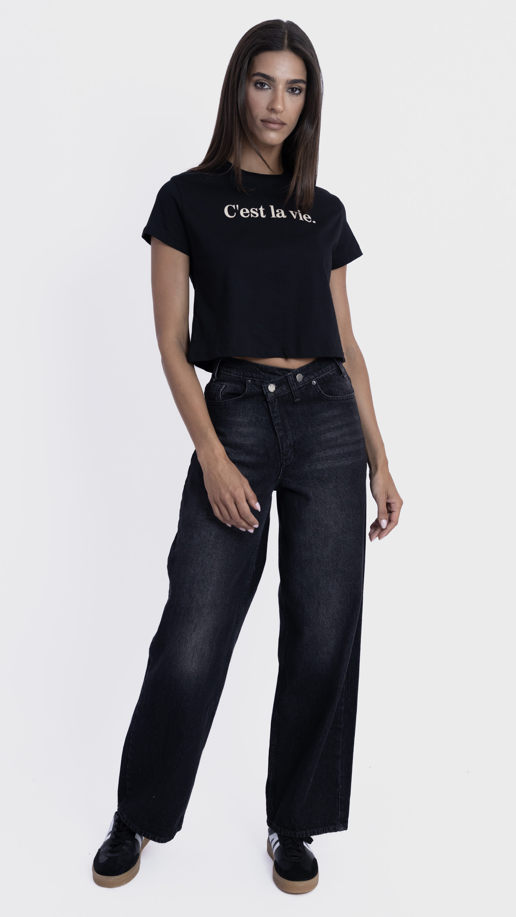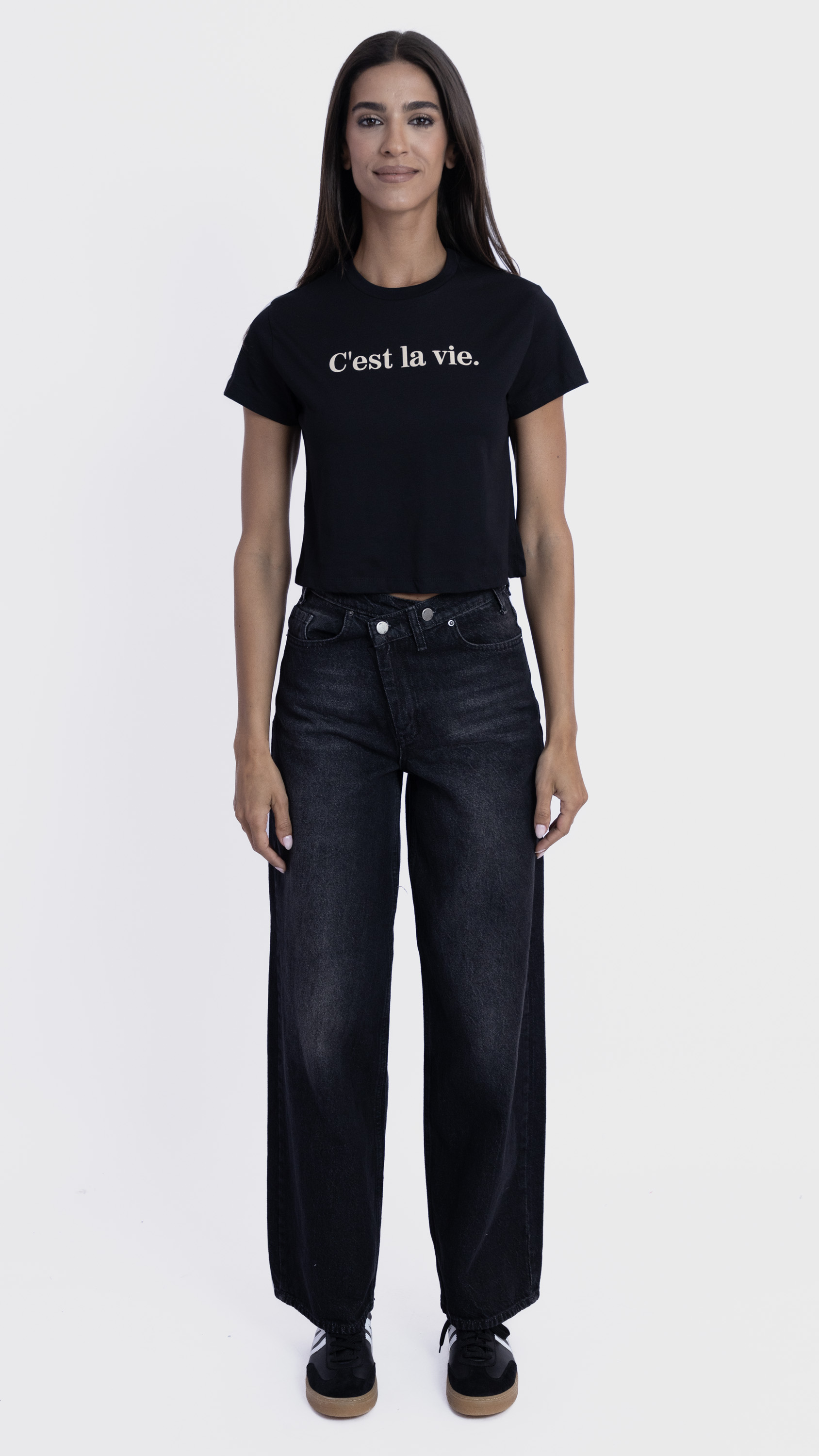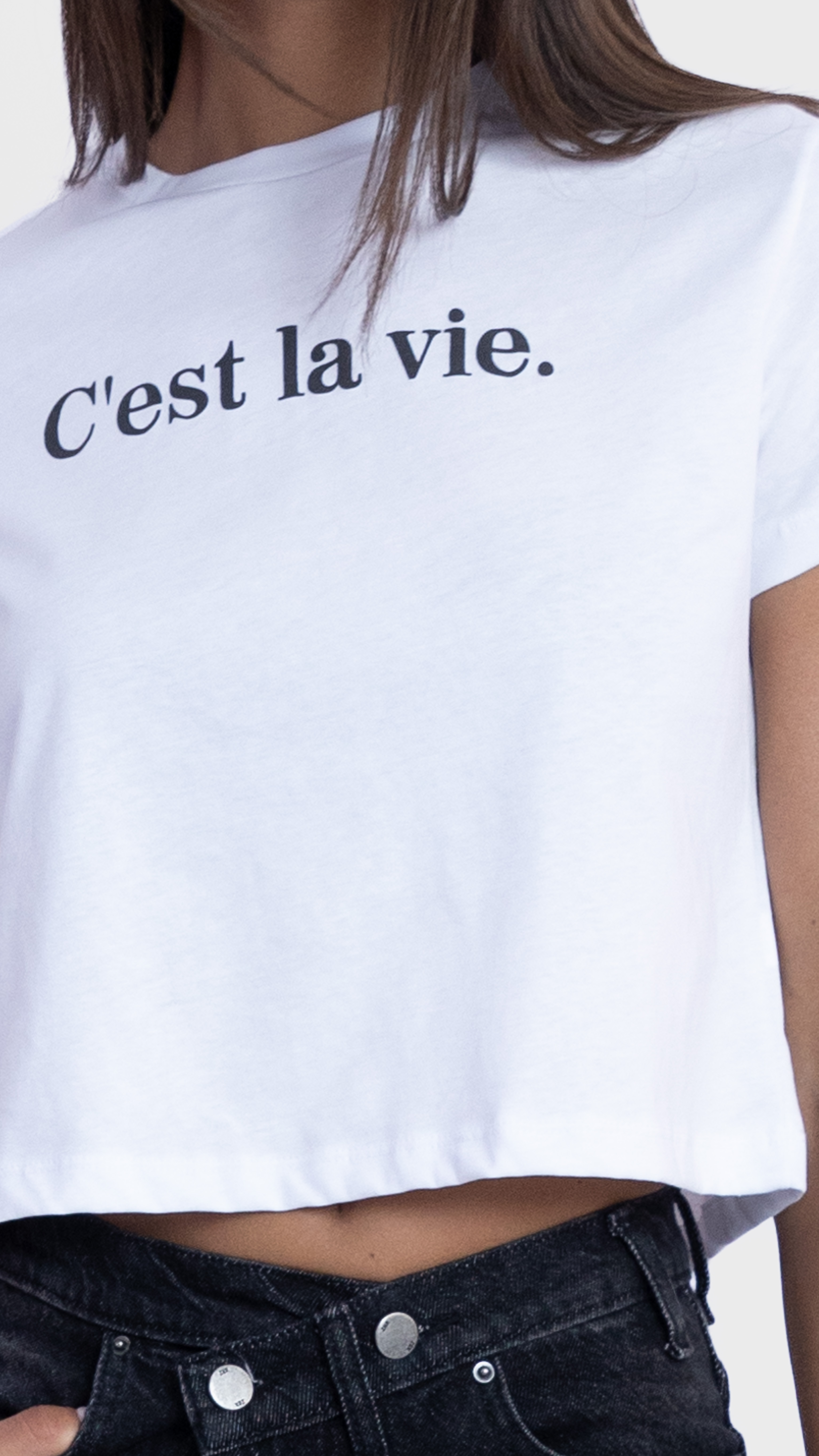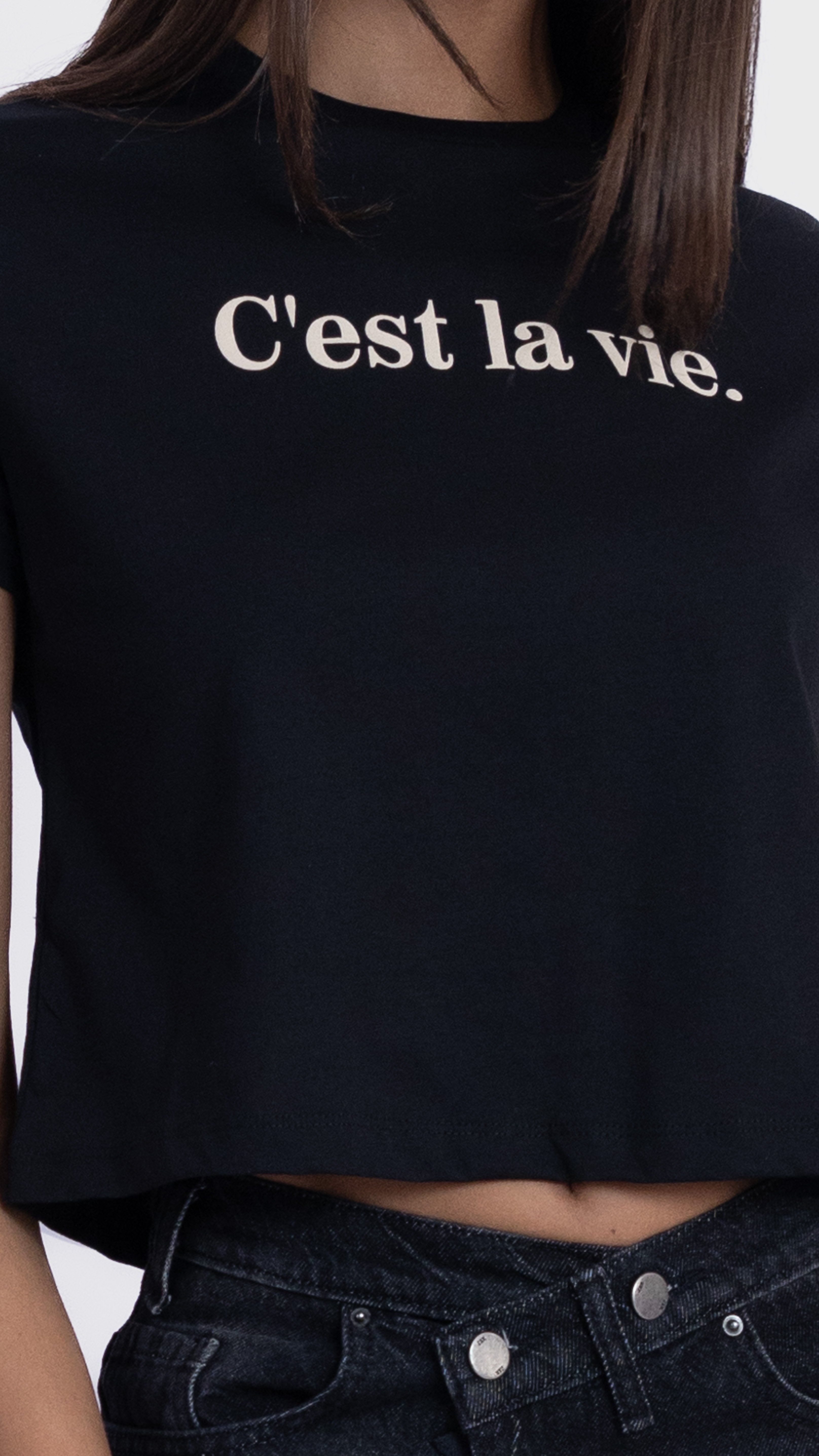 Make a statement with this black cropped tee featuring the iconic “C’est la vie.” slogan — a sleek and modern essential for your casual collection.