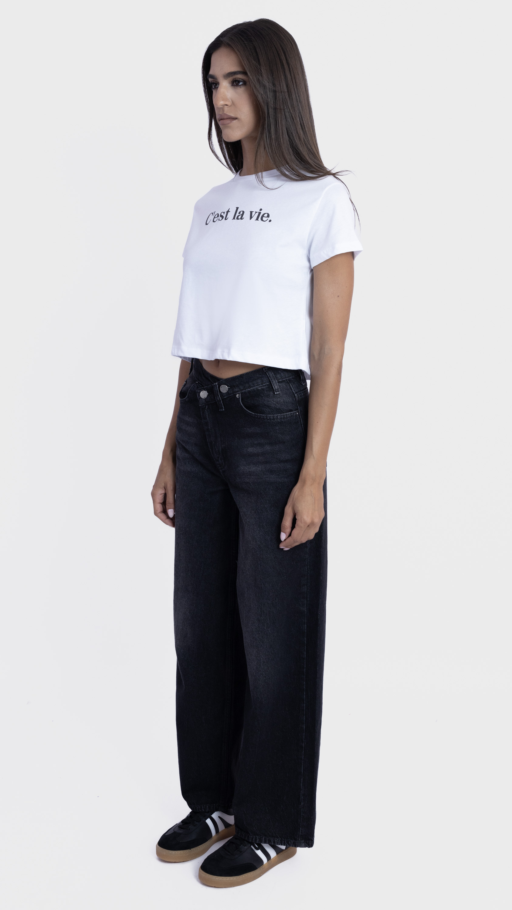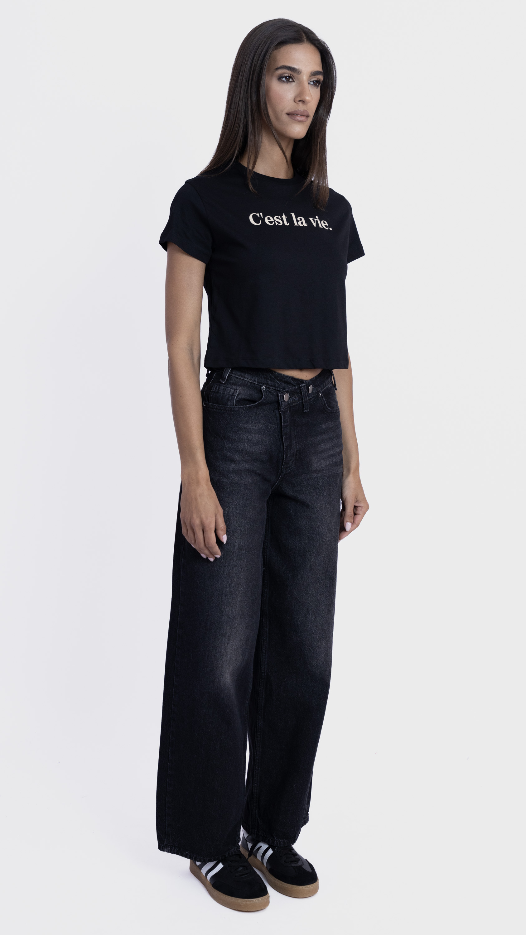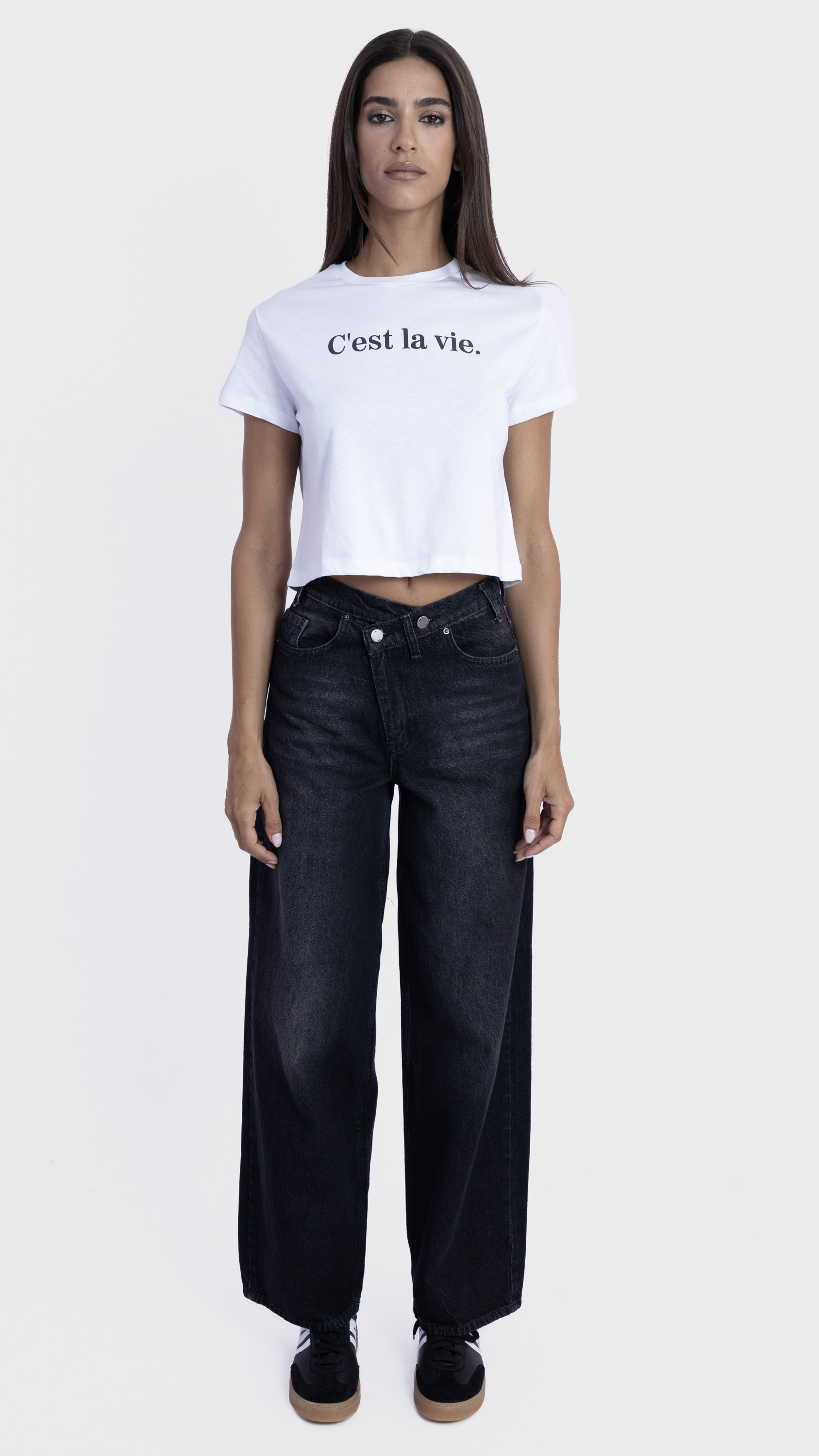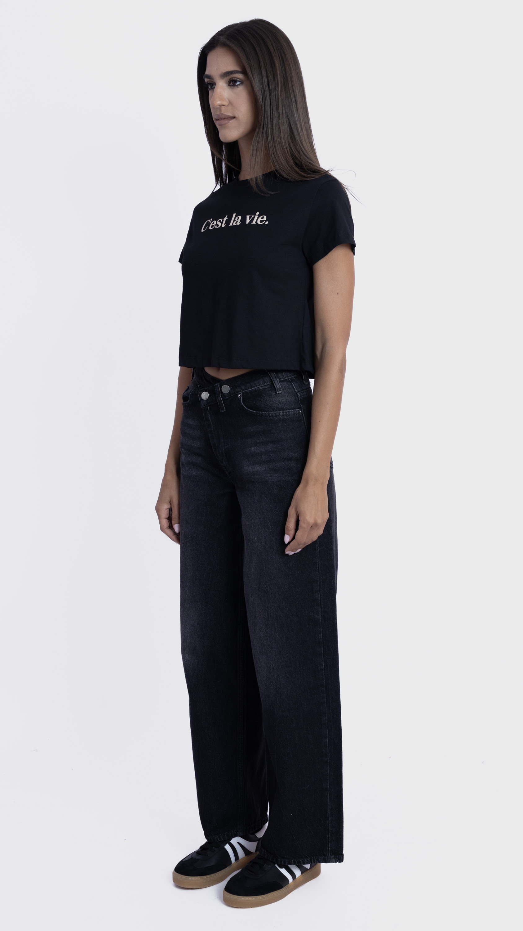 Make a statement with this black cropped tee featuring the iconic “C’est la vie.” slogan — a sleek and modern essential for your casual collection.