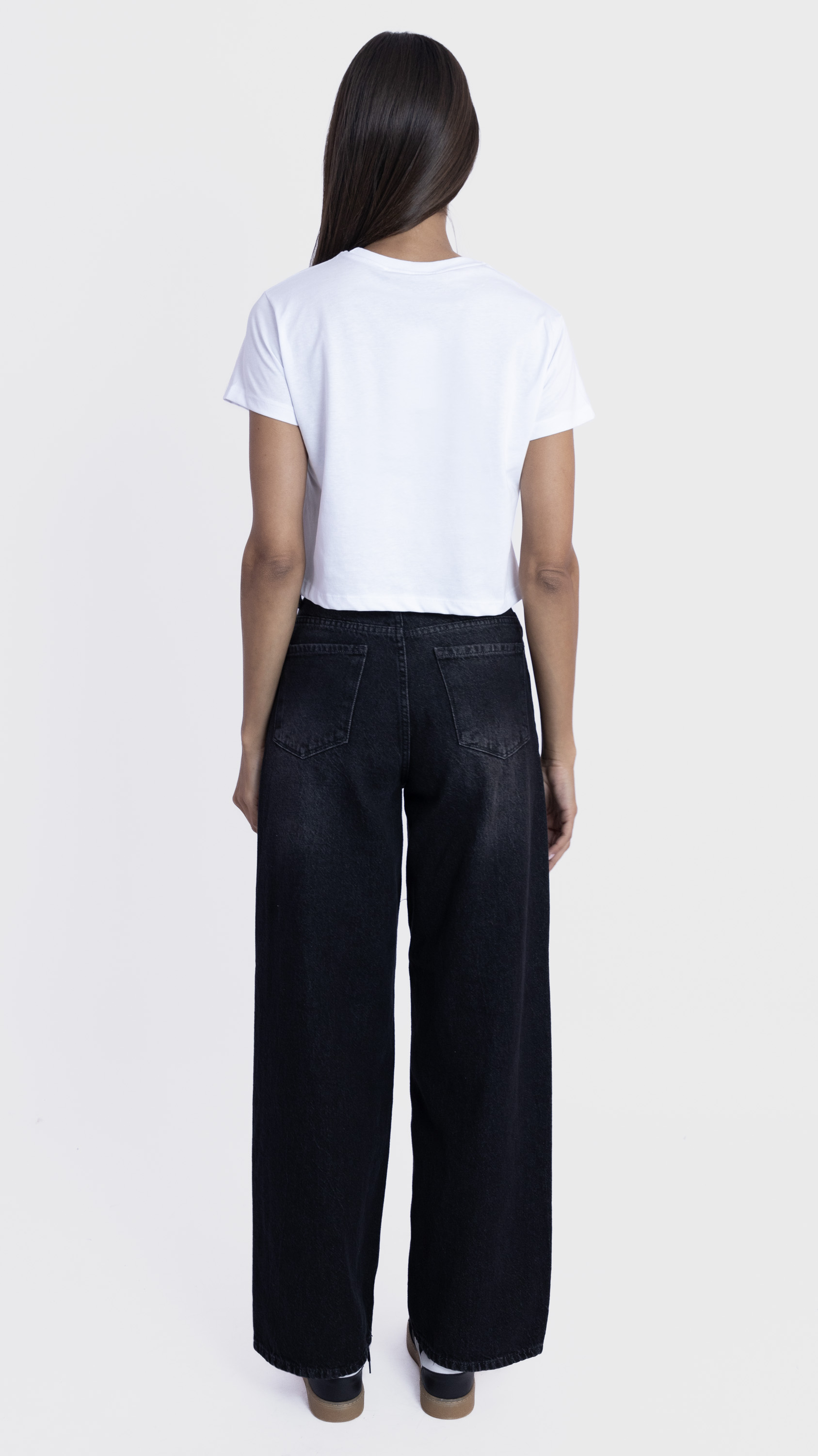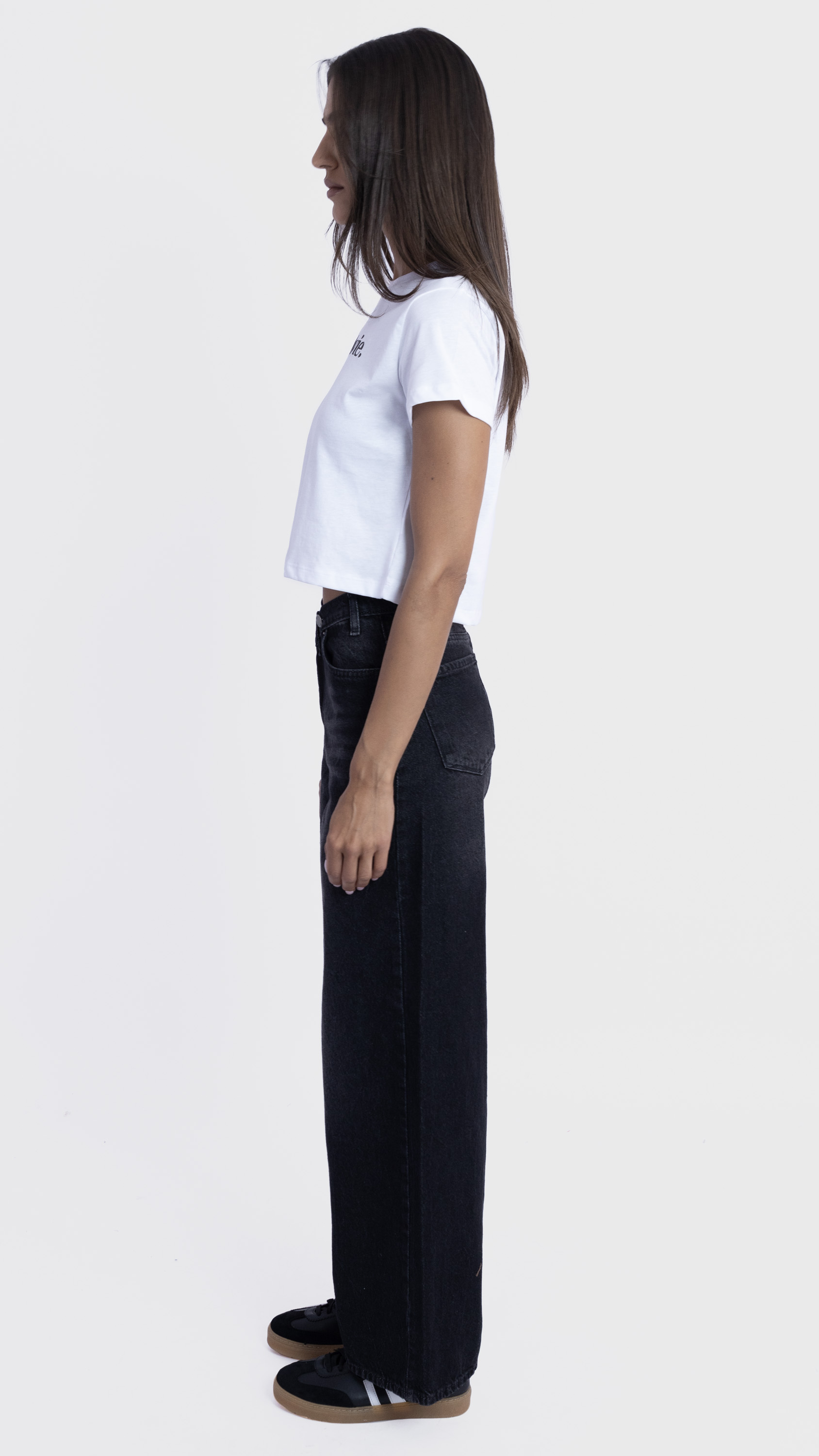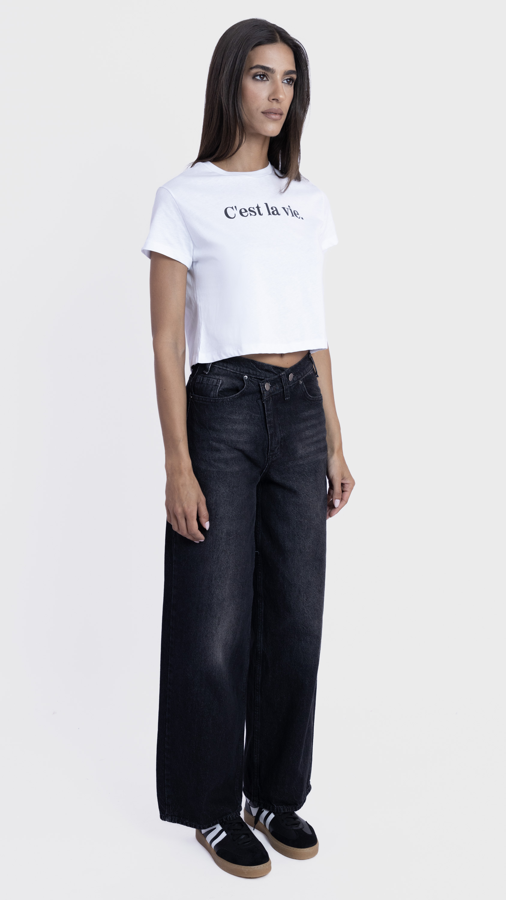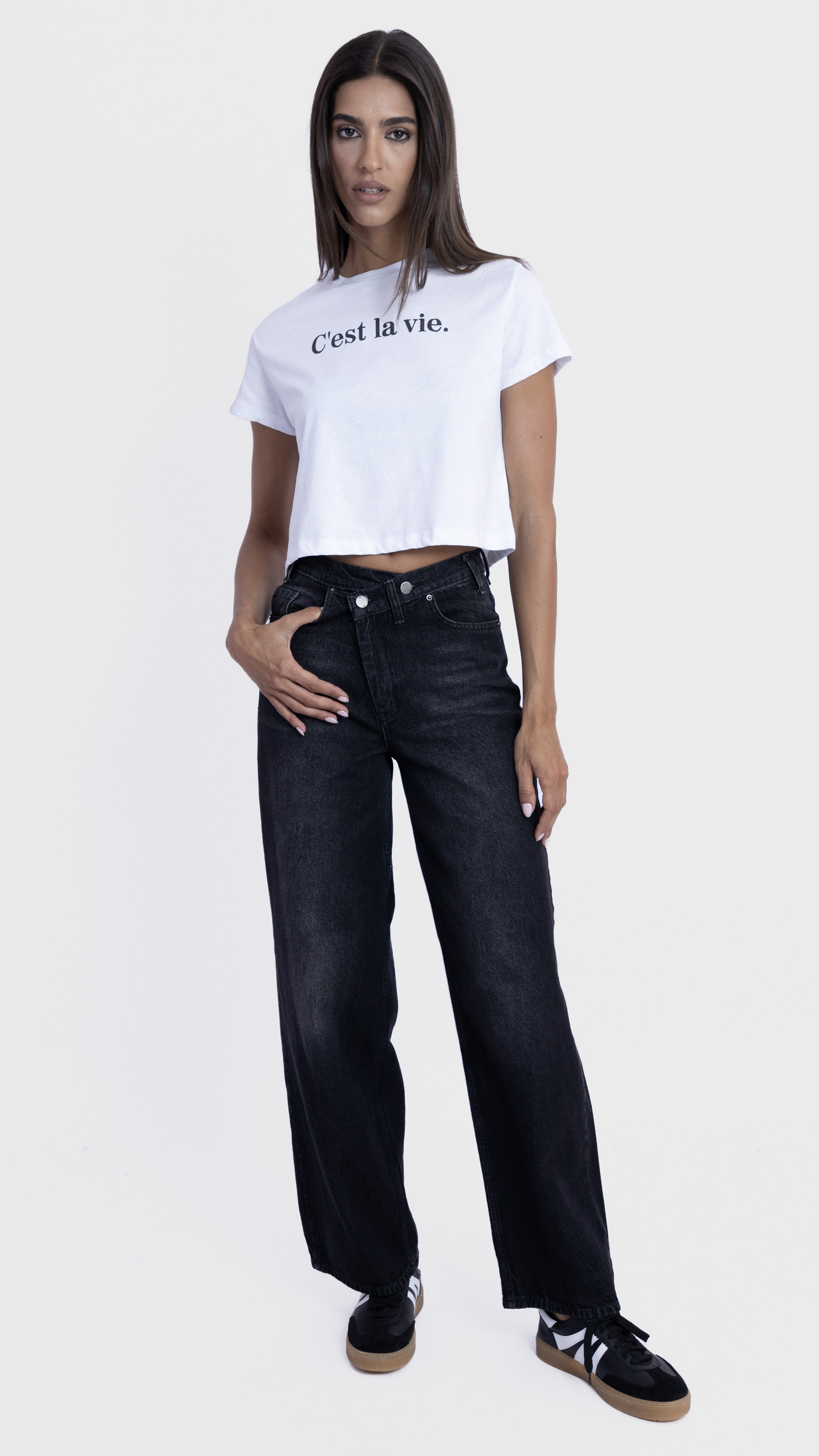 Make a statement with this black cropped tee featuring the iconic “C’est la vie.” slogan — a sleek and modern essential for your casual collection.