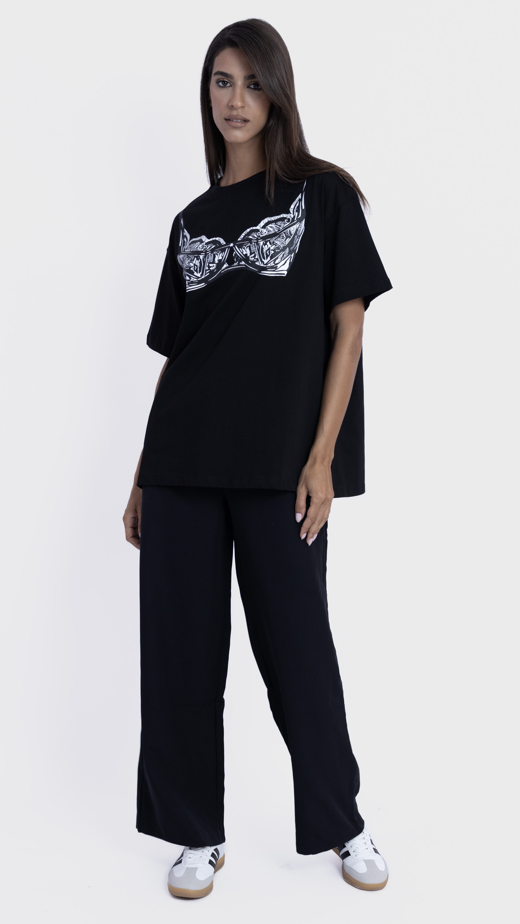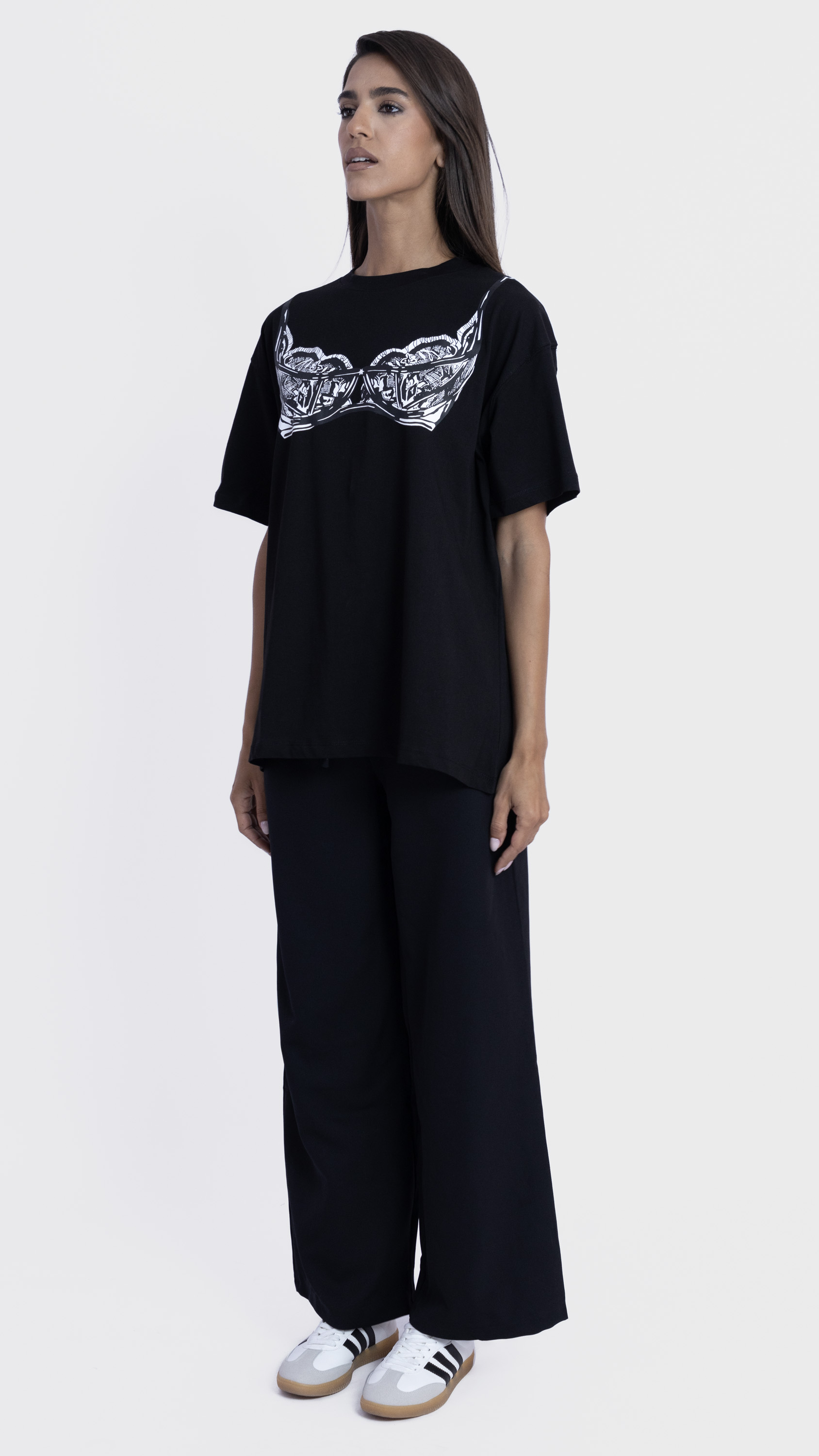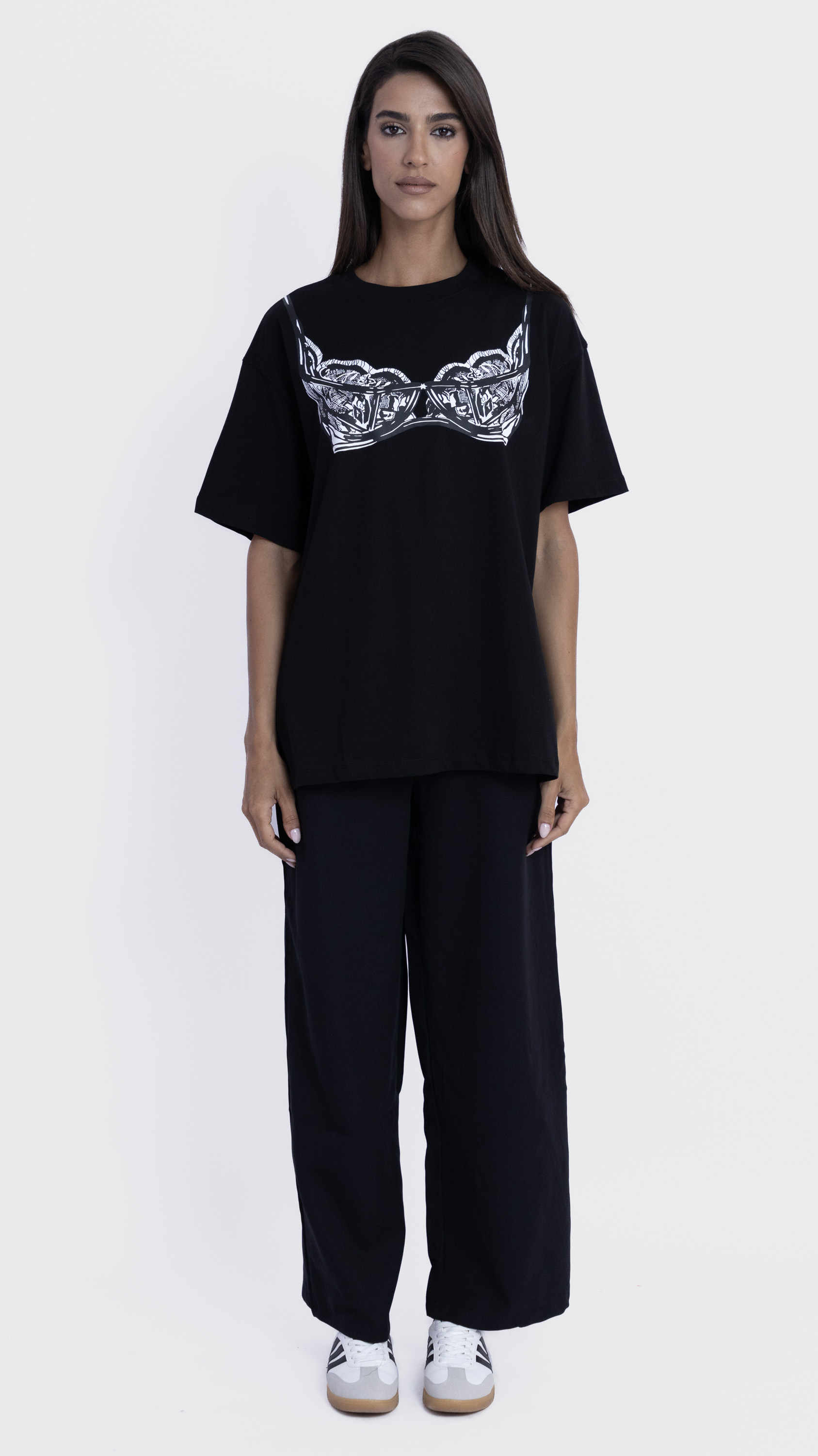 Break the rules of casual fashion with this bold oversized tee featuring an optical illusion bra graphic — a confident mix of humor and edge.
