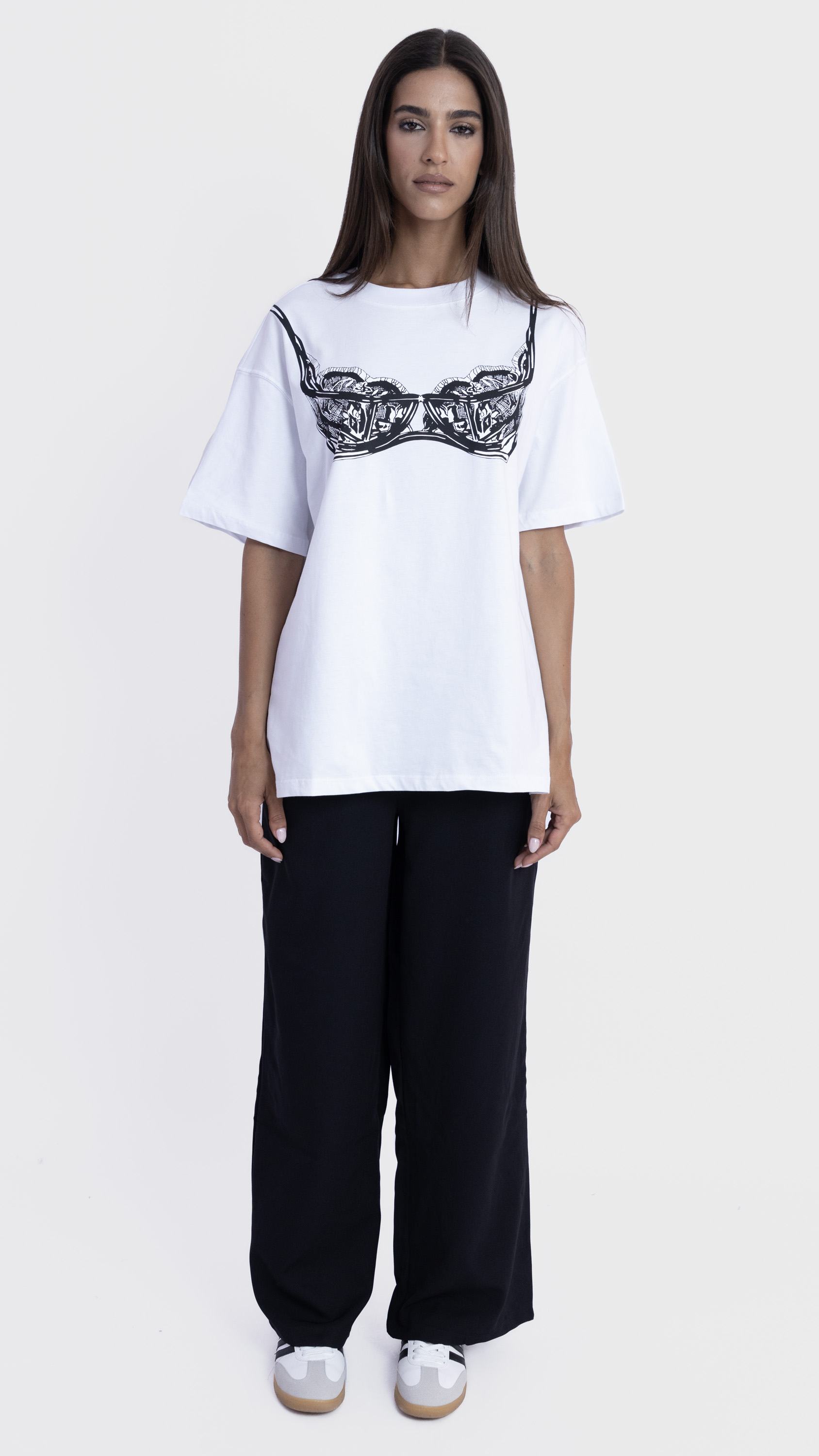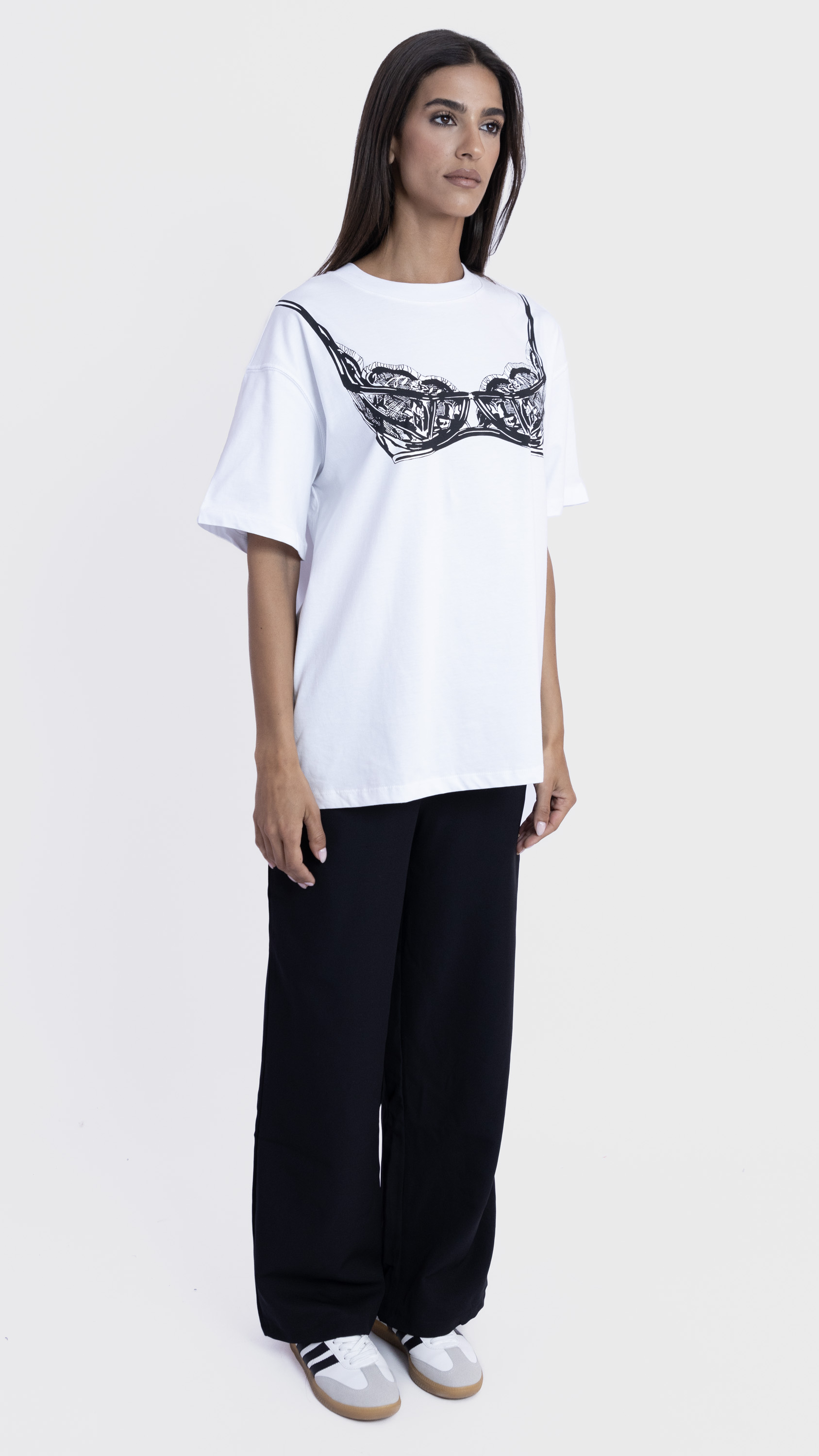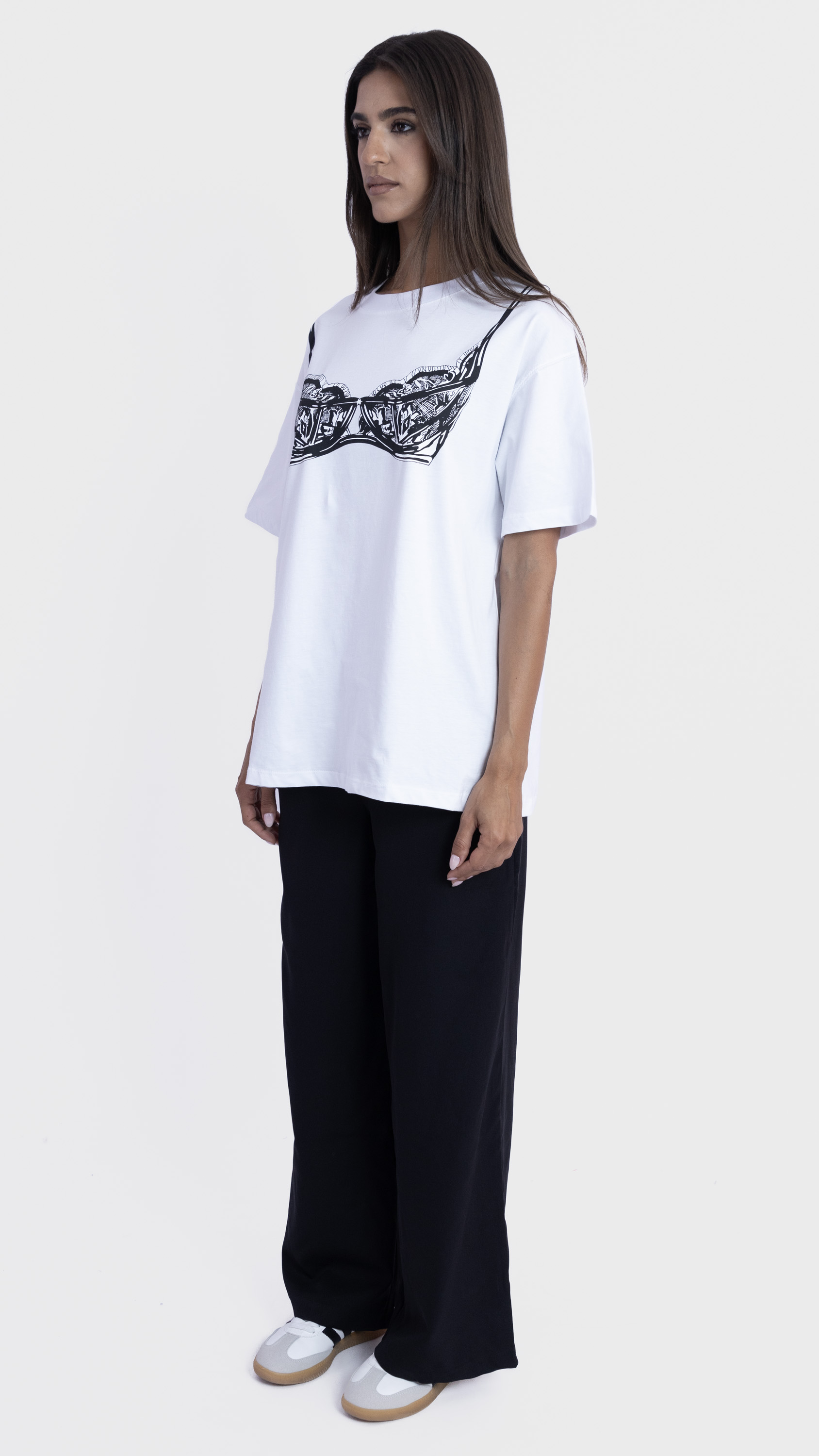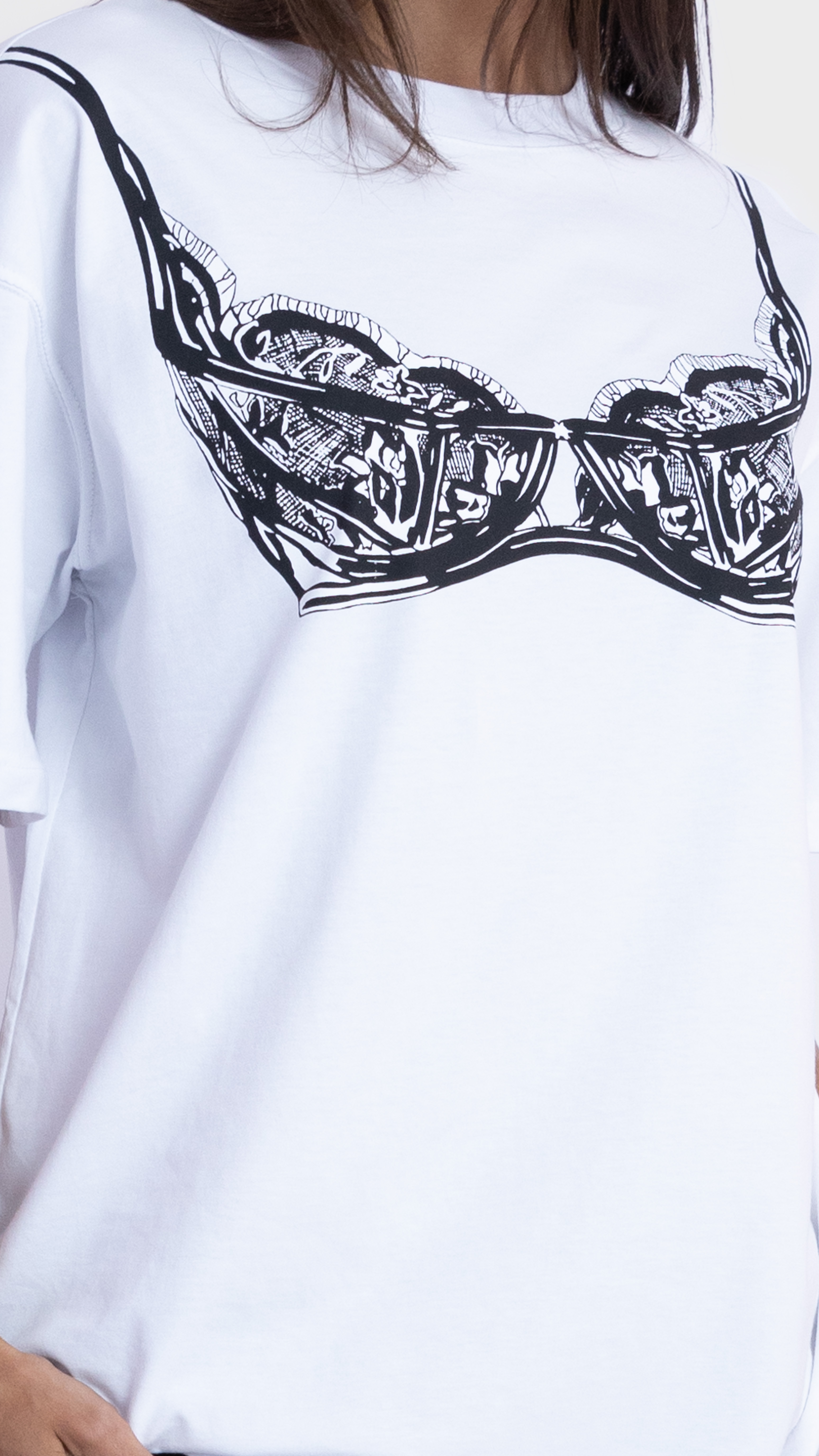 Bold and fashion-forward, this oversized white tee features a playful front print that mimics the outline of a detailed bra. The black graphic creates a trompe-l’œil effect, adding a touch of cheeky attitude to a relaxed, streetwear-inspired silhouette. Made from soft, breathable cotton, this statement piece is perfect for trendsetters who love to stand out with confidence and humor.