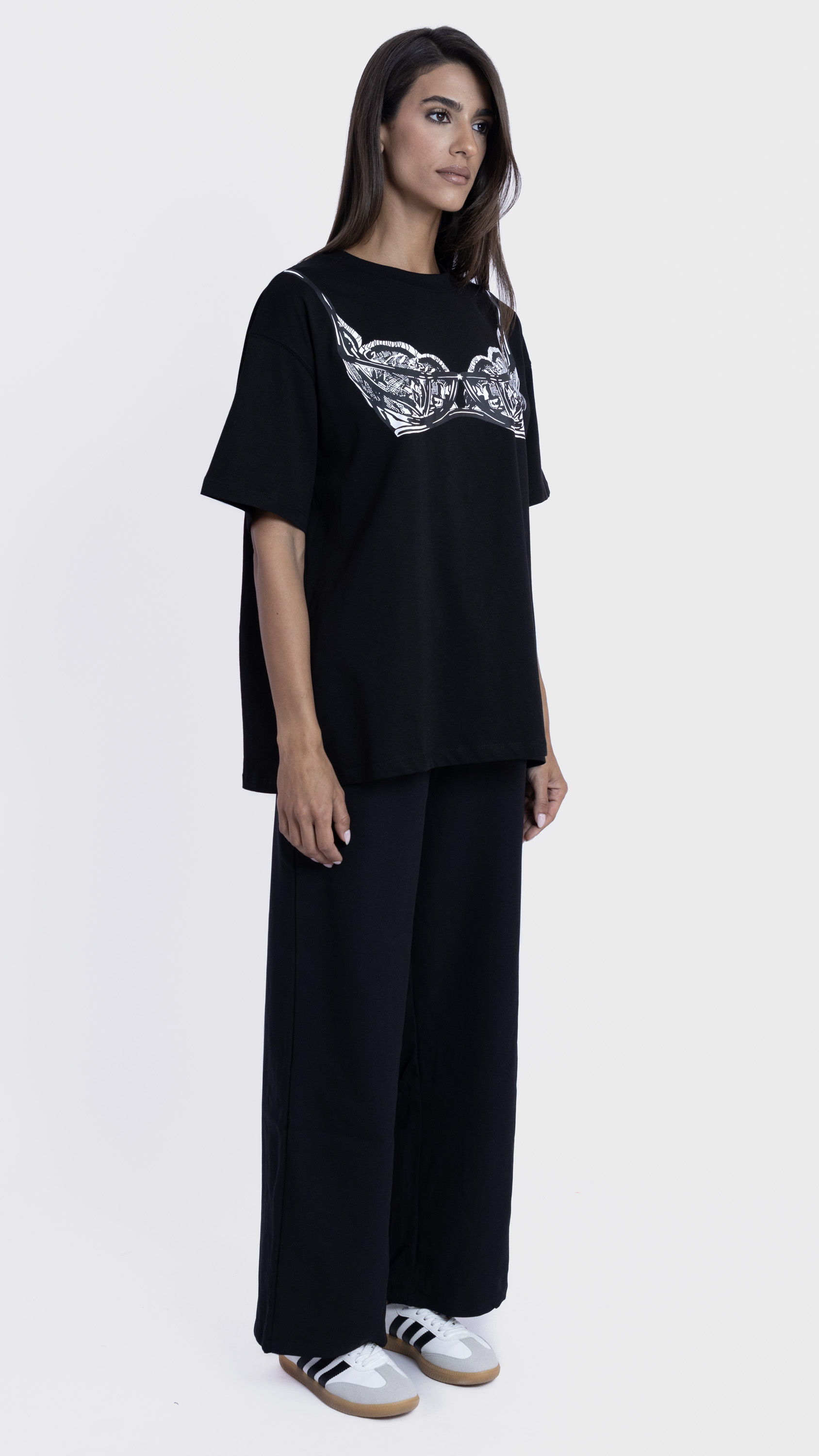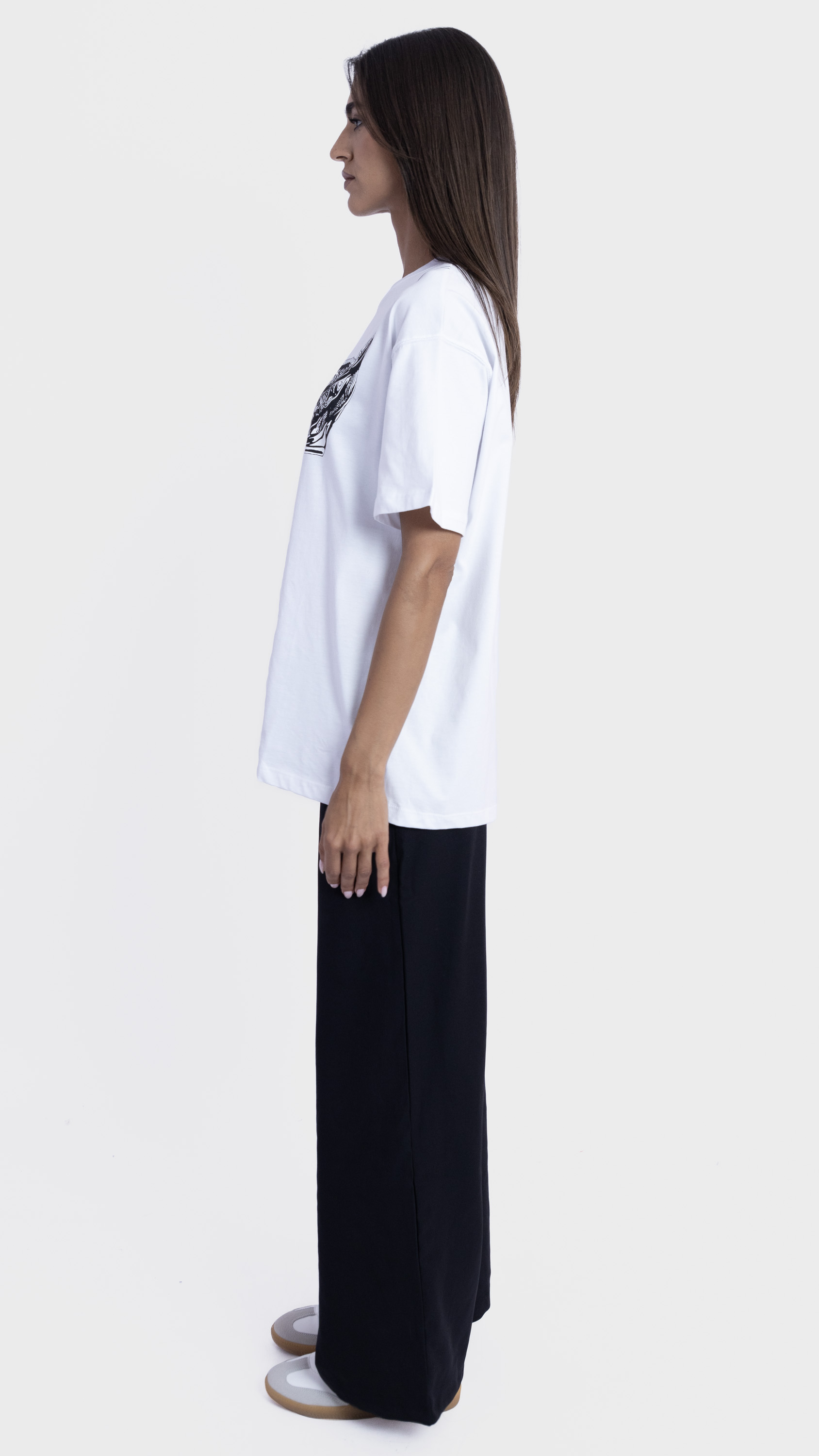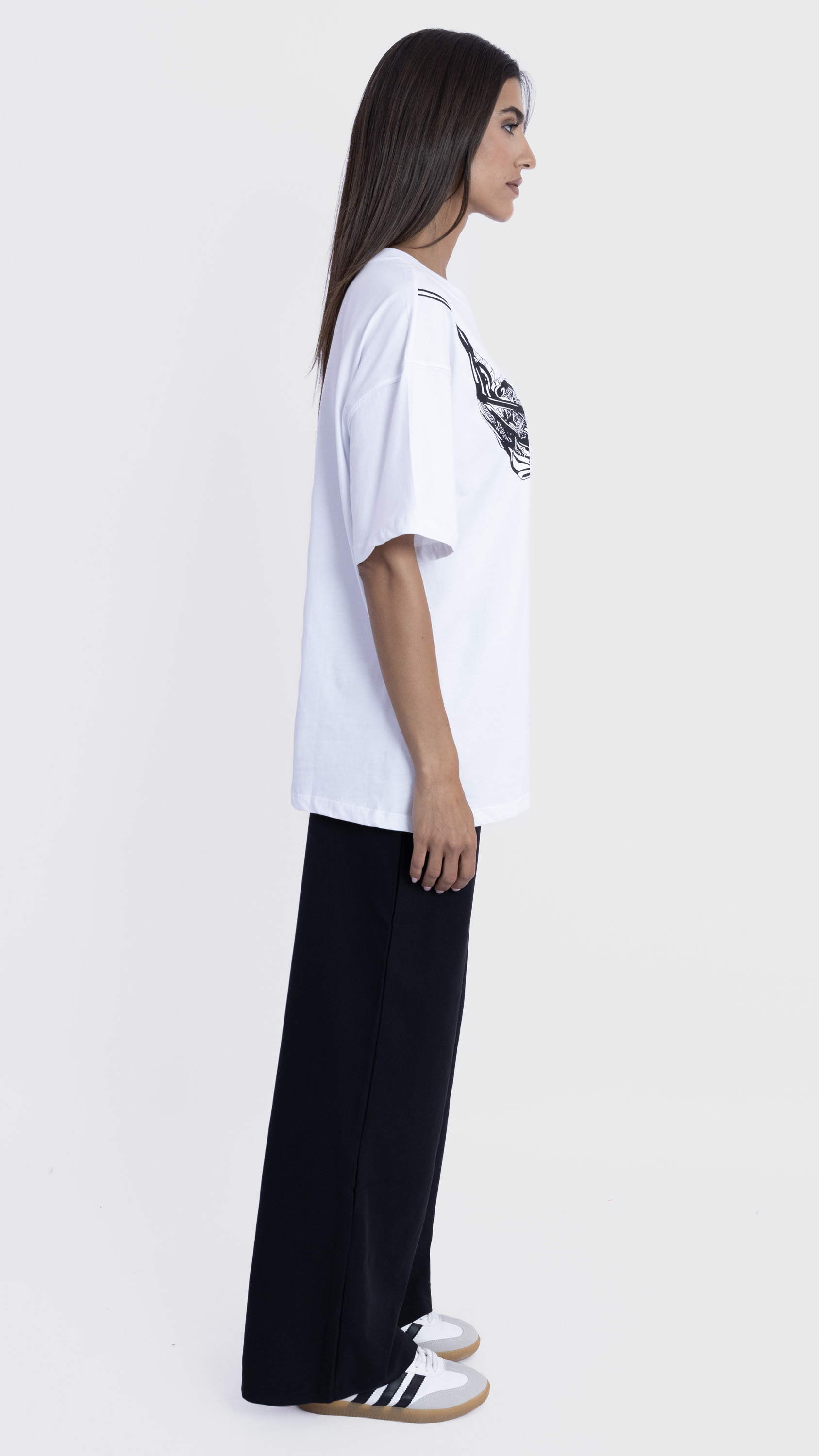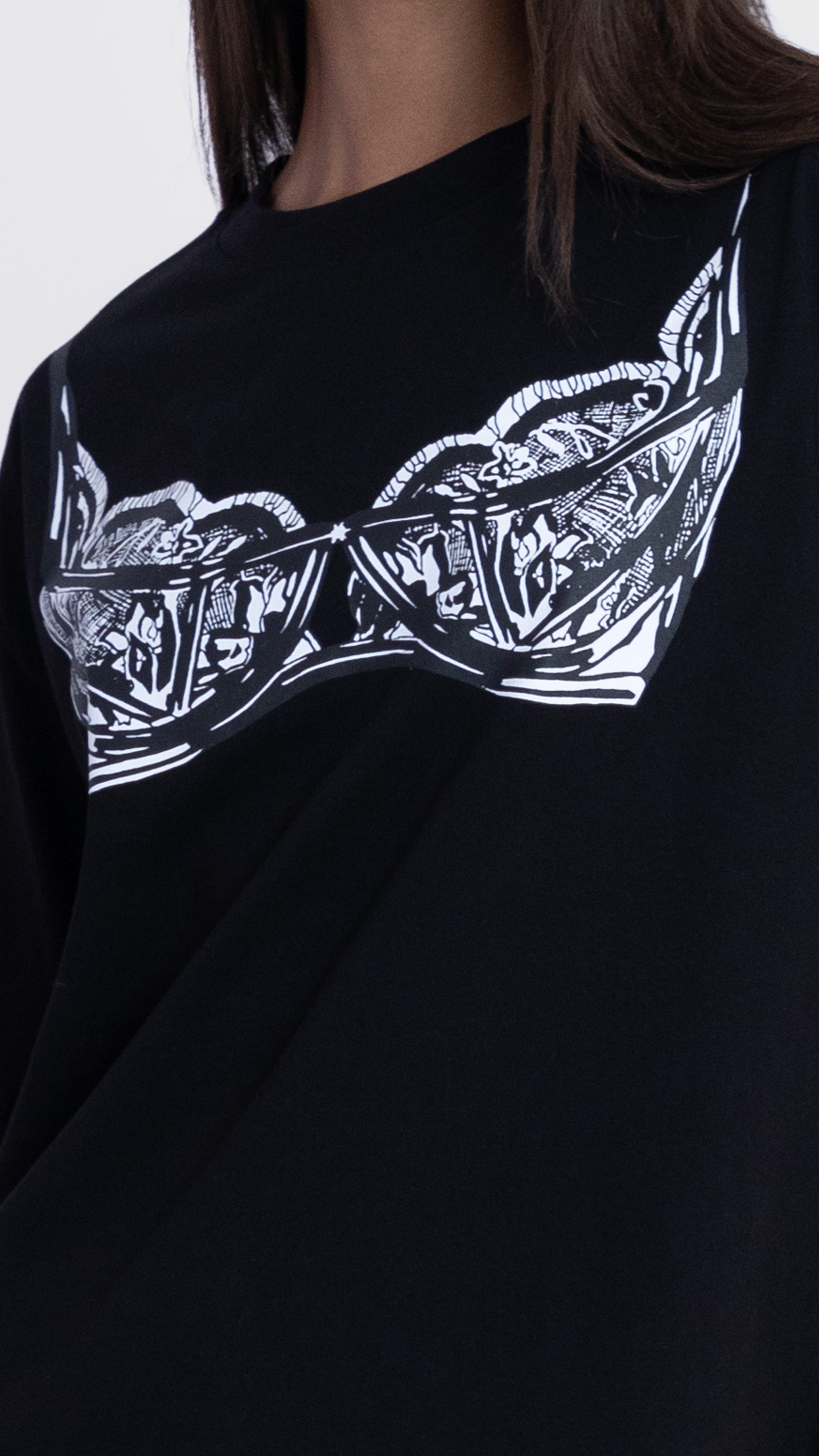 Bold and fashion-forward, this oversized white tee features a playful front print that mimics the outline of a detailed bra. The black graphic creates a trompe-l’œil effect, adding a touch of cheeky attitude to a relaxed, streetwear-inspired silhouette. Made from soft, breathable cotton, this statement piece is perfect for trendsetters who love to stand out with confidence and humor.