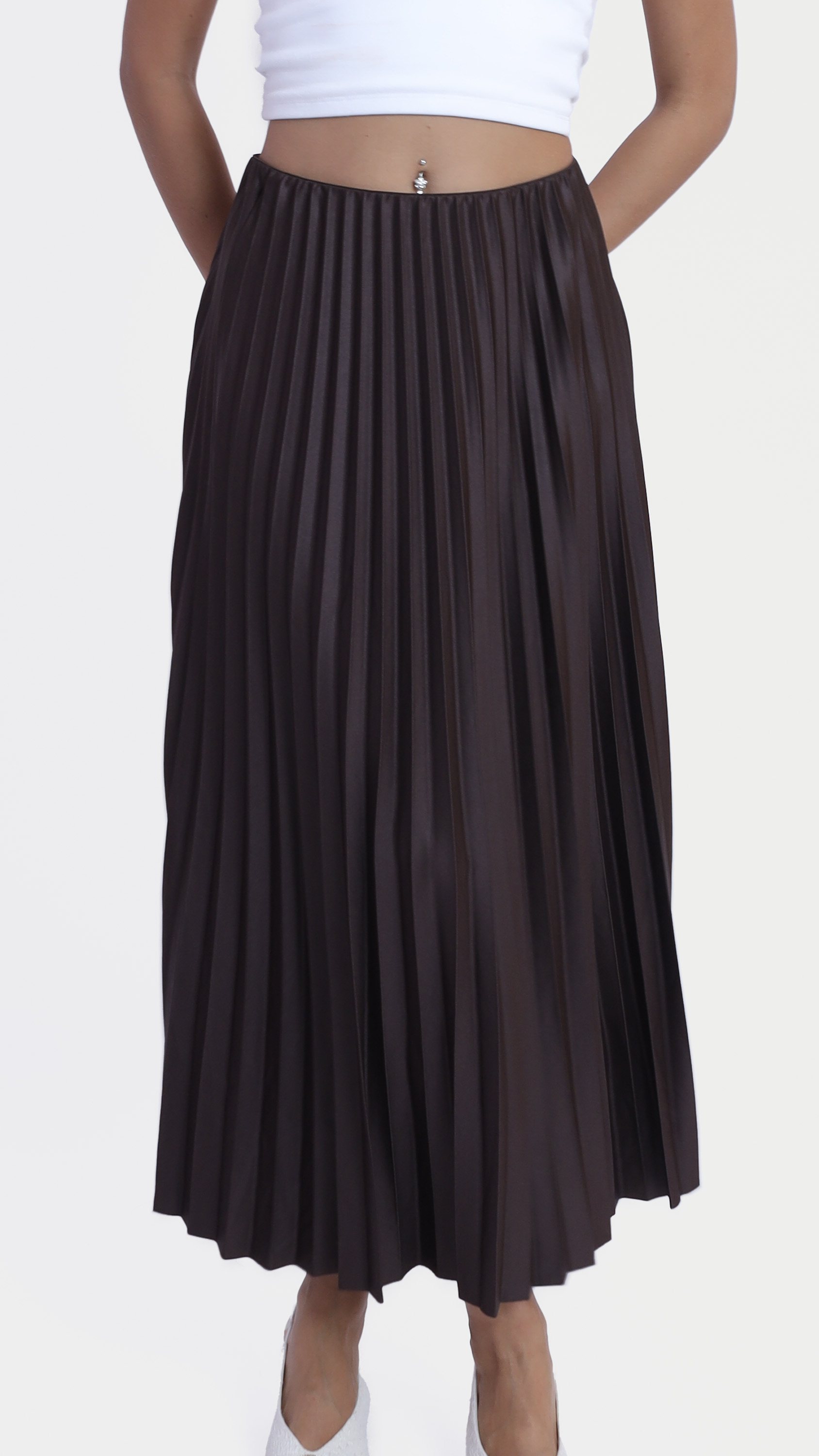 This pleated midi skirt brings a refined touch to any outfit. Featuring narrow all-over knife pleats and a subtle satin-like sheen, it moves gracefully with every step. The elastic waistband ensures all-day comfort, while the lightweight fabric and midi length make it perfect for both casual and elegant occasions.
