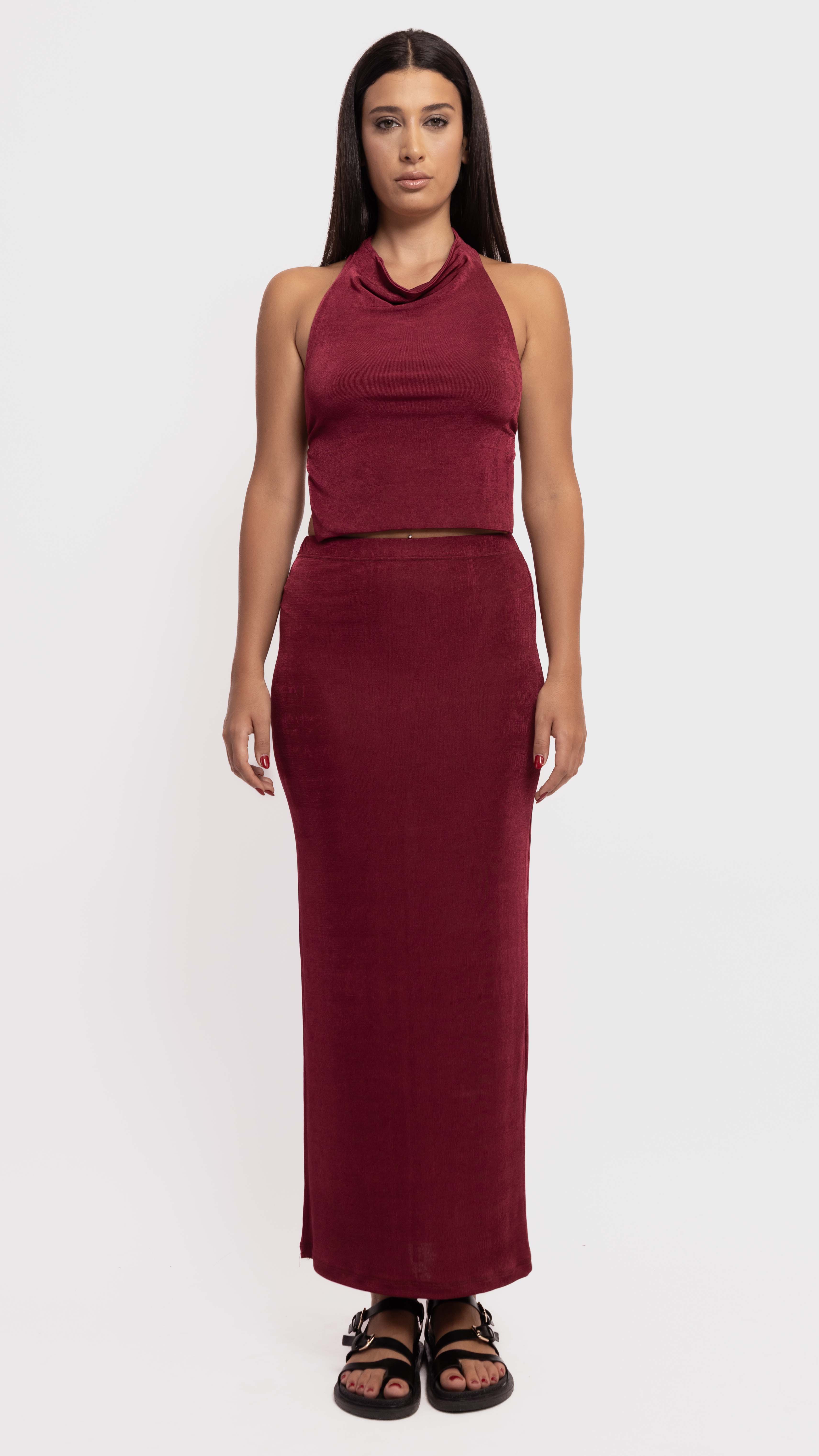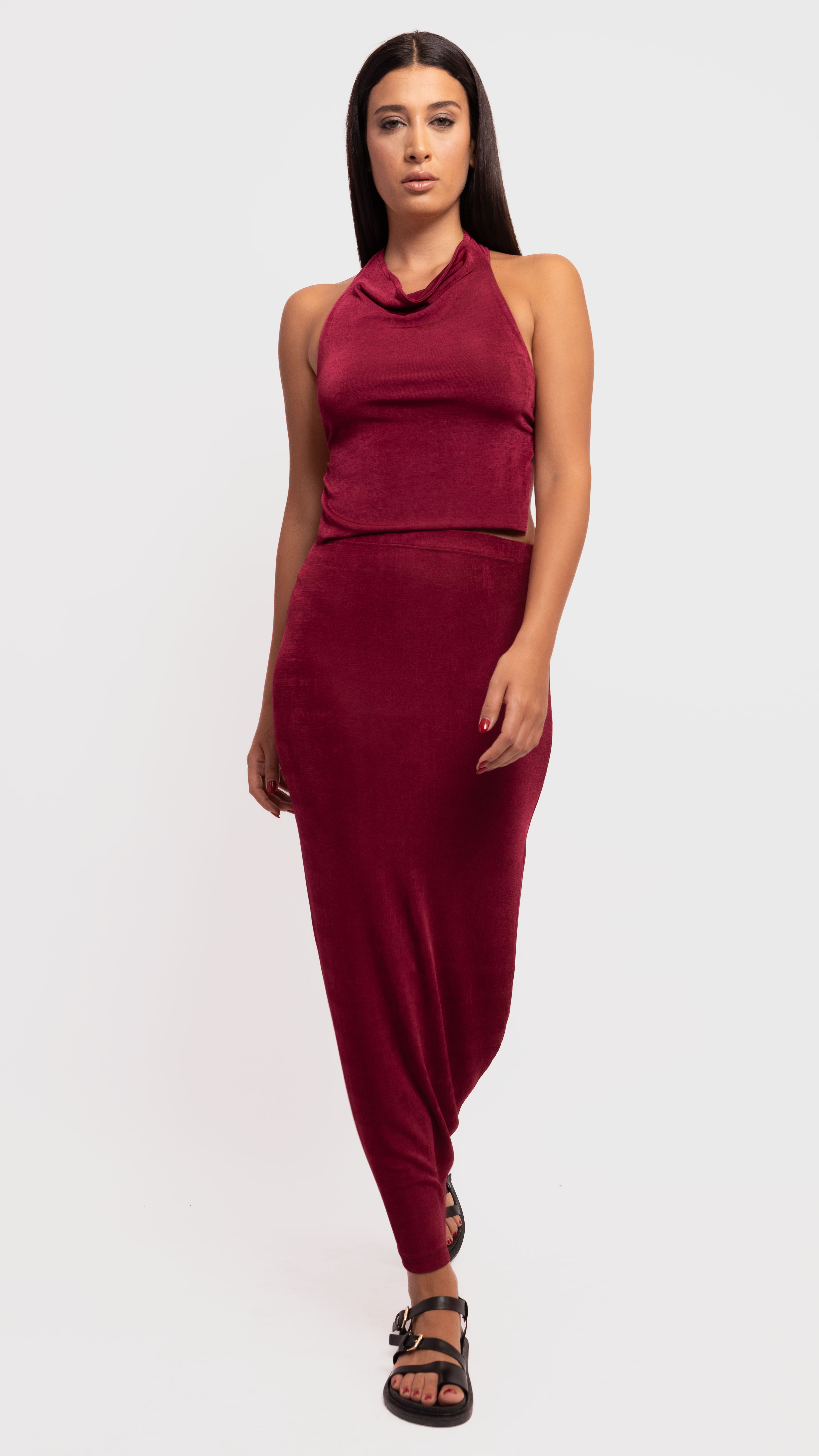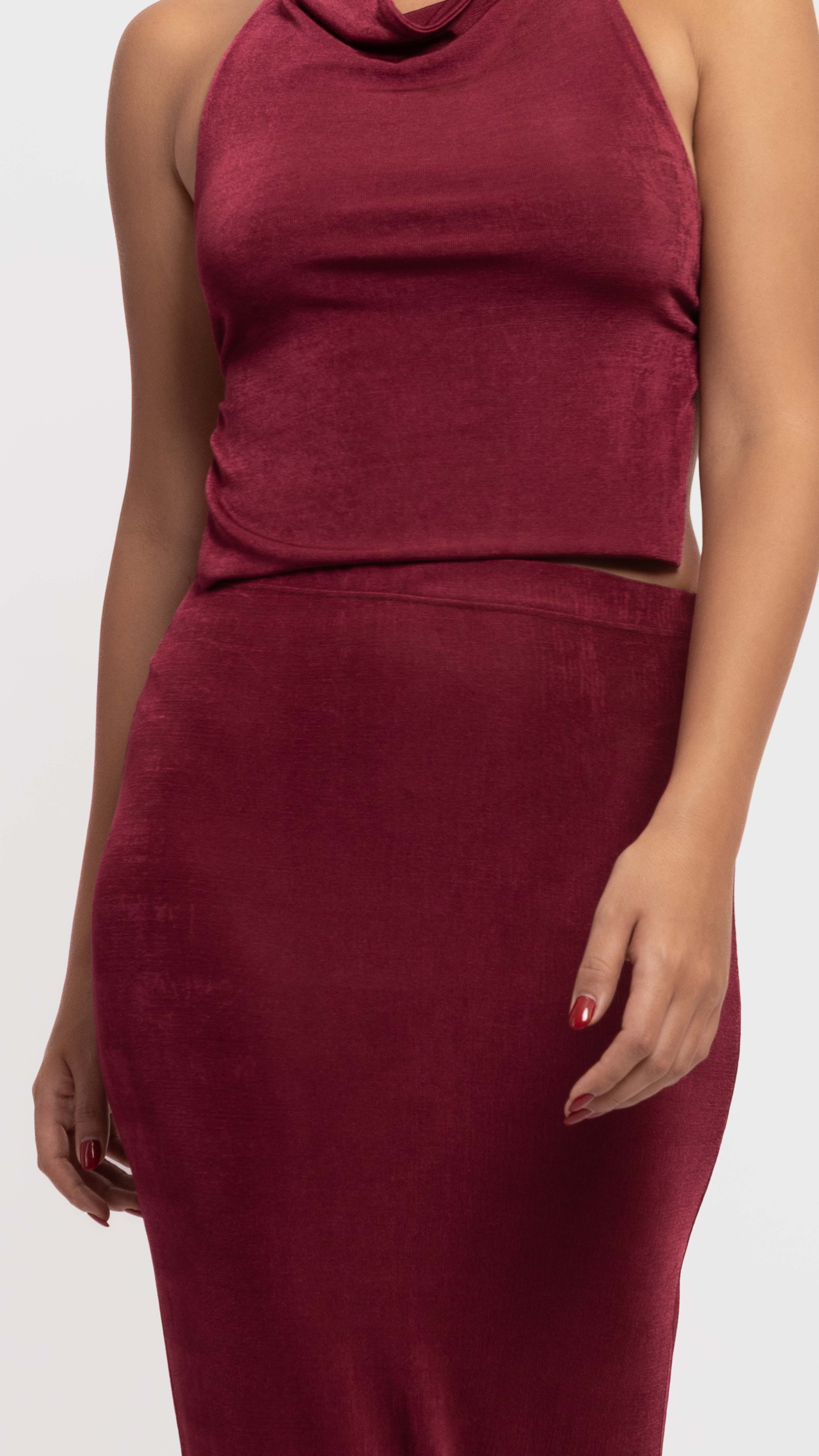 This sultry two-piece set is designed to turn heads with its elegant yet modern silhouette. The top features a draped halter neckline that flows beautifully over the bust, while the matching high-waisted skirt hugs the body with a sleek, bodycon fit. Crafted from a soft, slightly shimmery stretch fabric, the set balances allure and sophistication — perfect for evening outings, date nights, or special events.