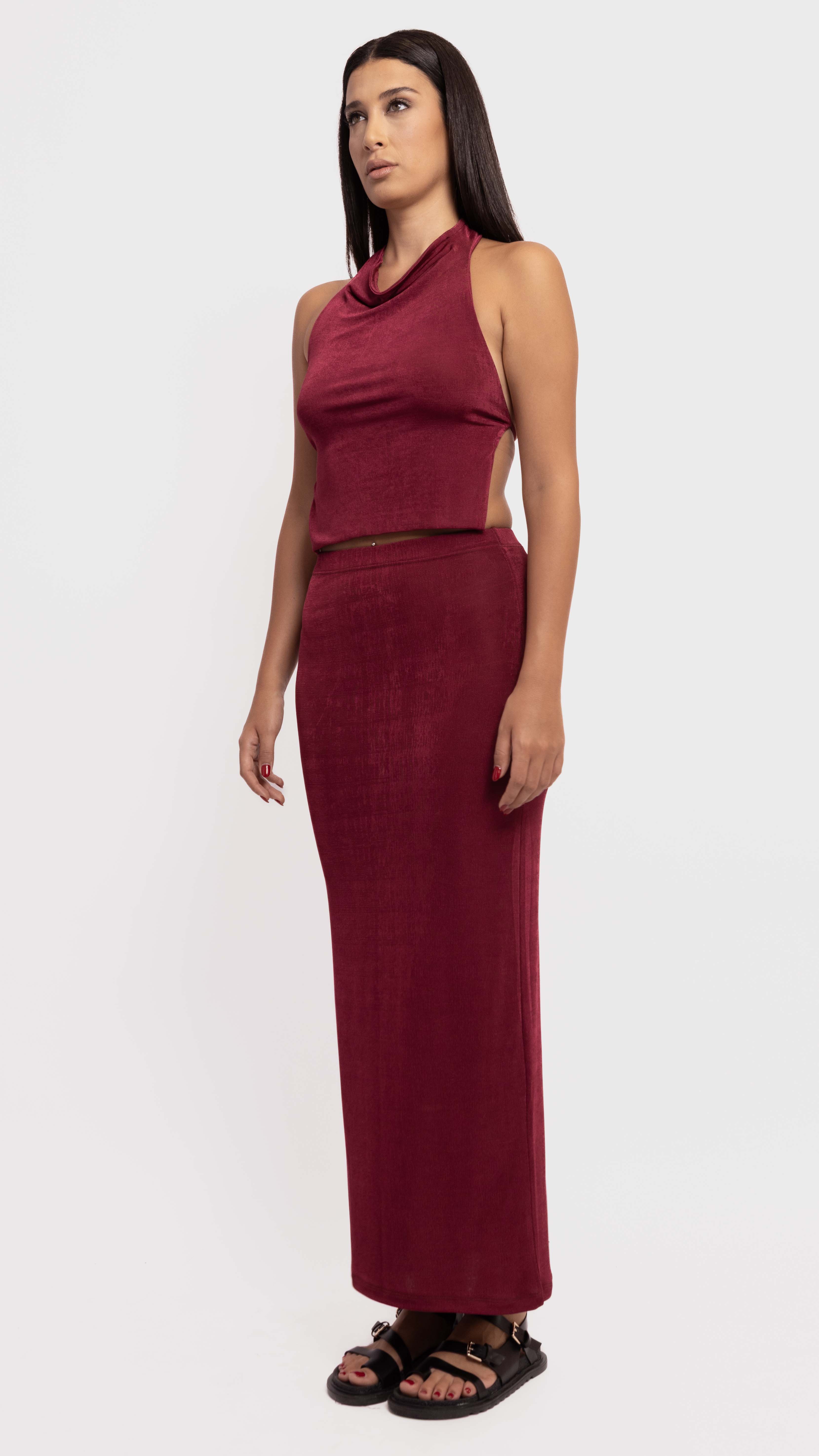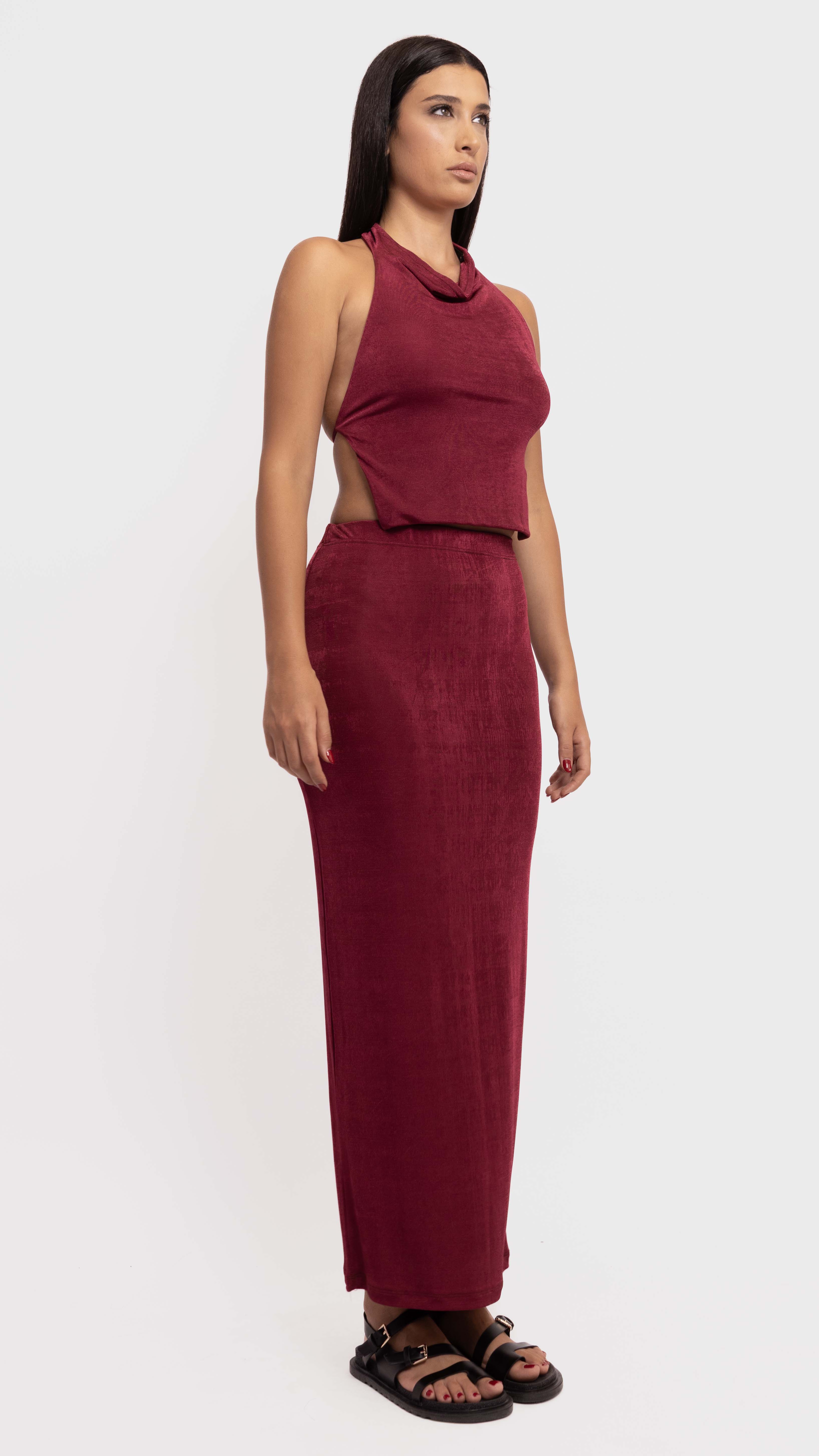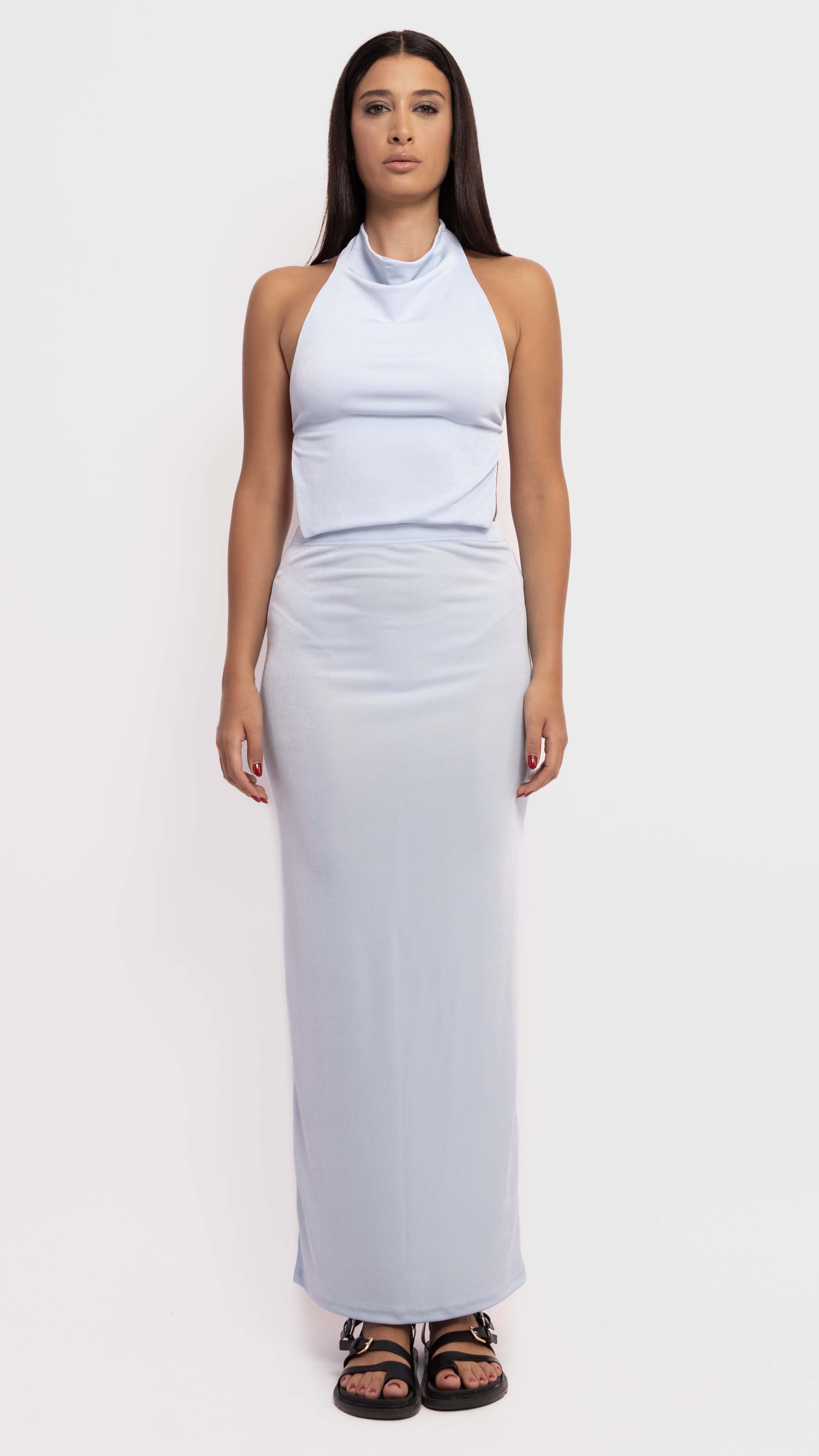 Make an unforgettable entrance in this elegant two-piece set featuring a draped halter top and figure-hugging skirt — the ultimate choice for evening elegance.