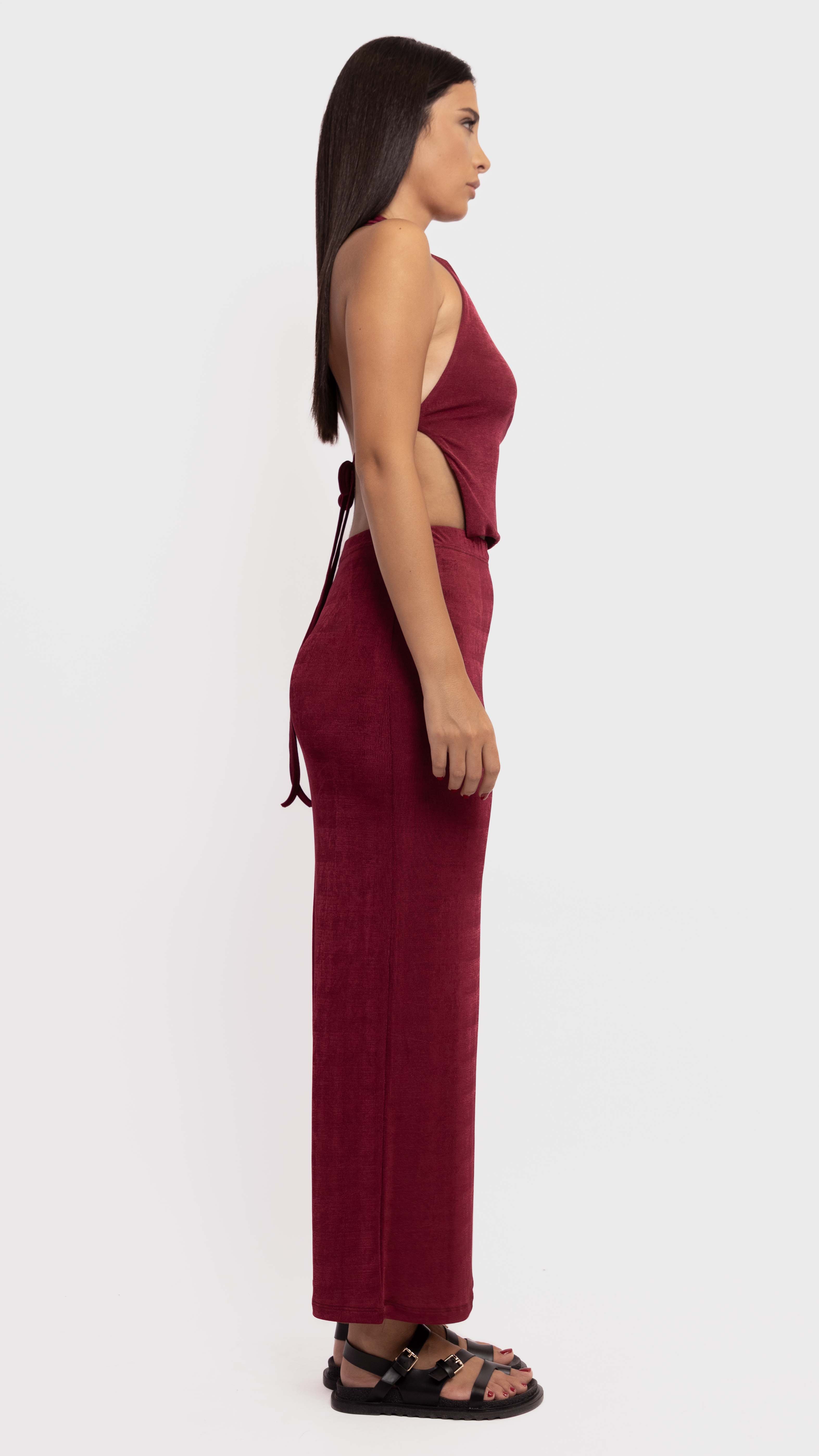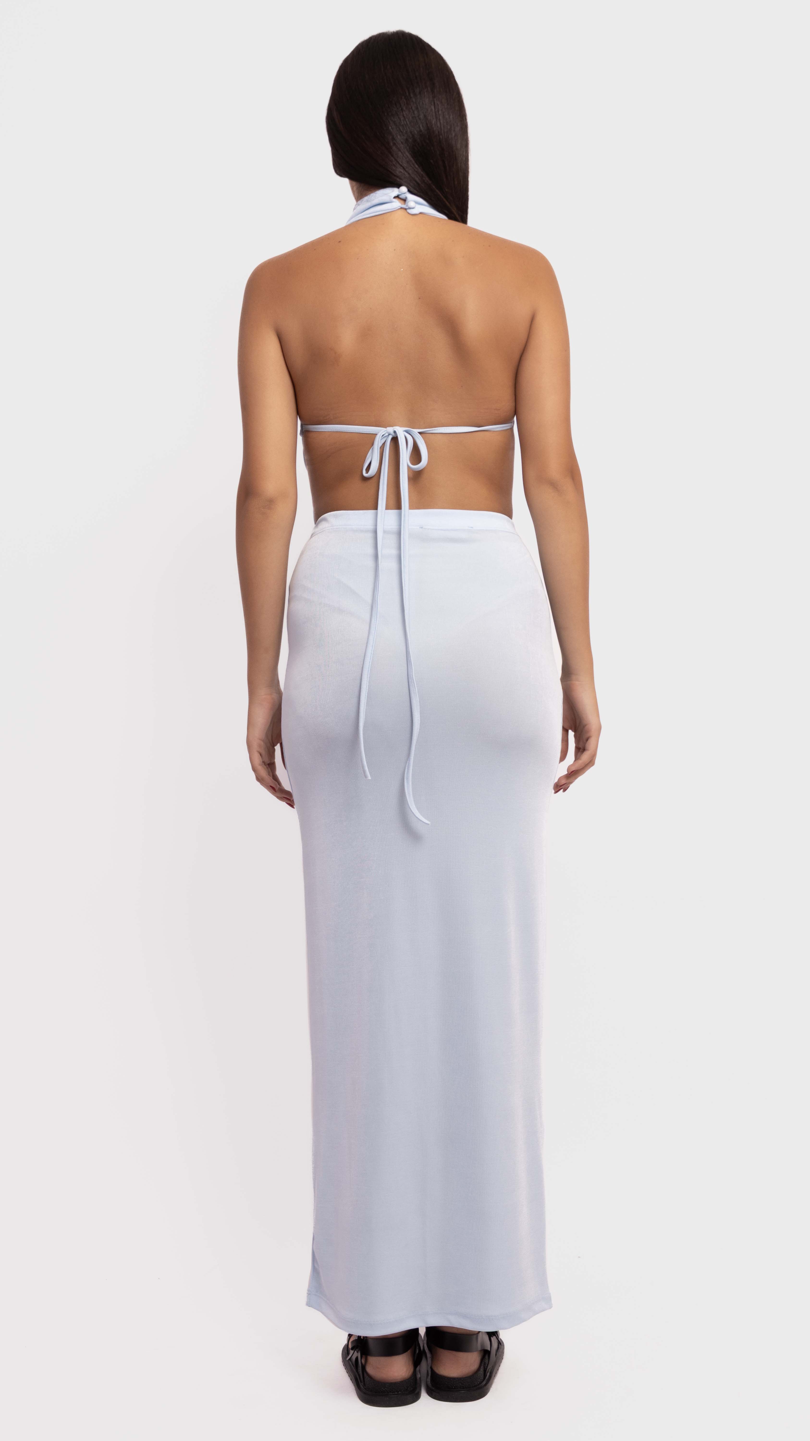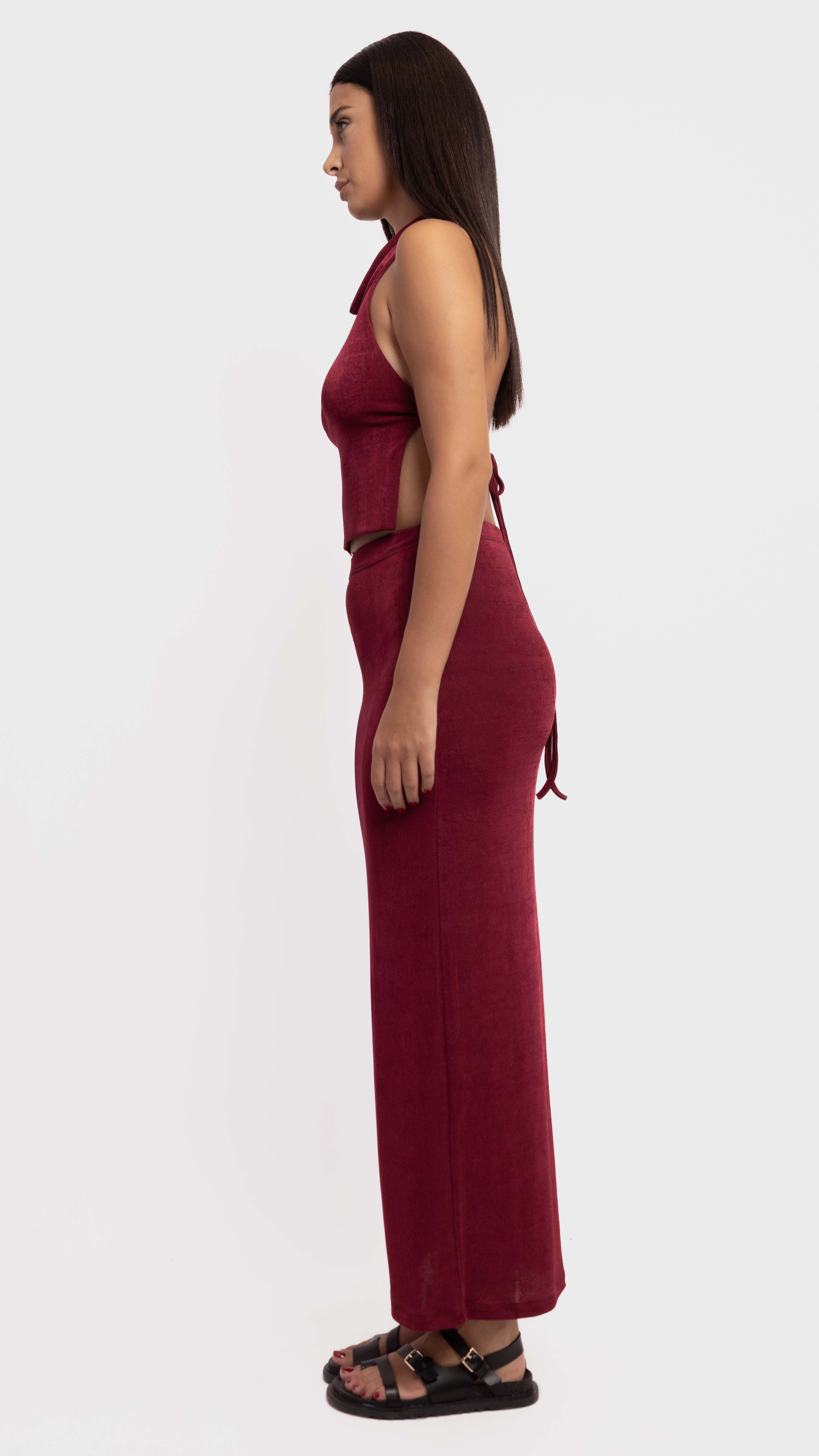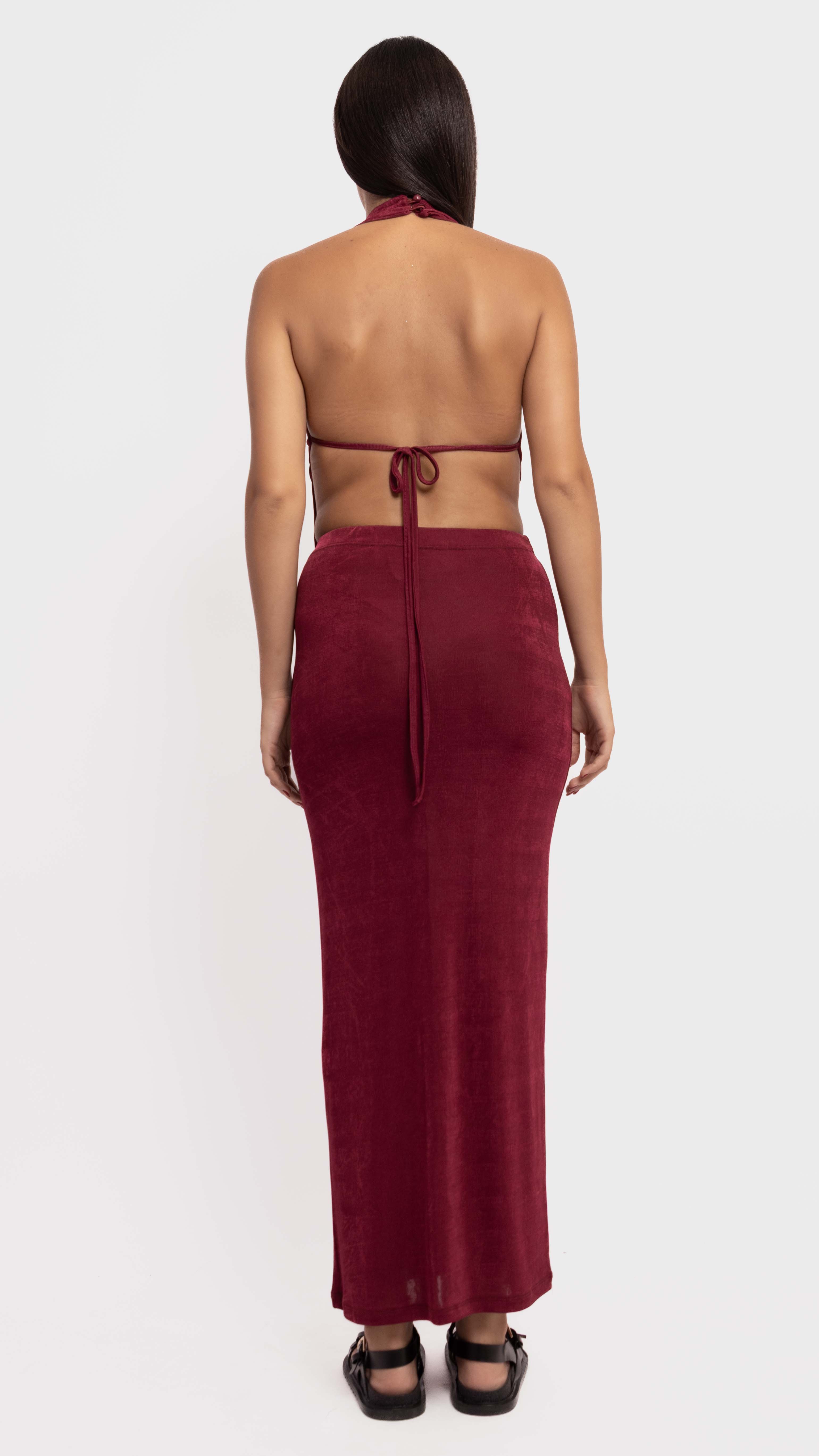 Make an unforgettable entrance in this elegant two-piece set featuring a draped halter top and figure-hugging skirt — the ultimate choice for evening elegance.