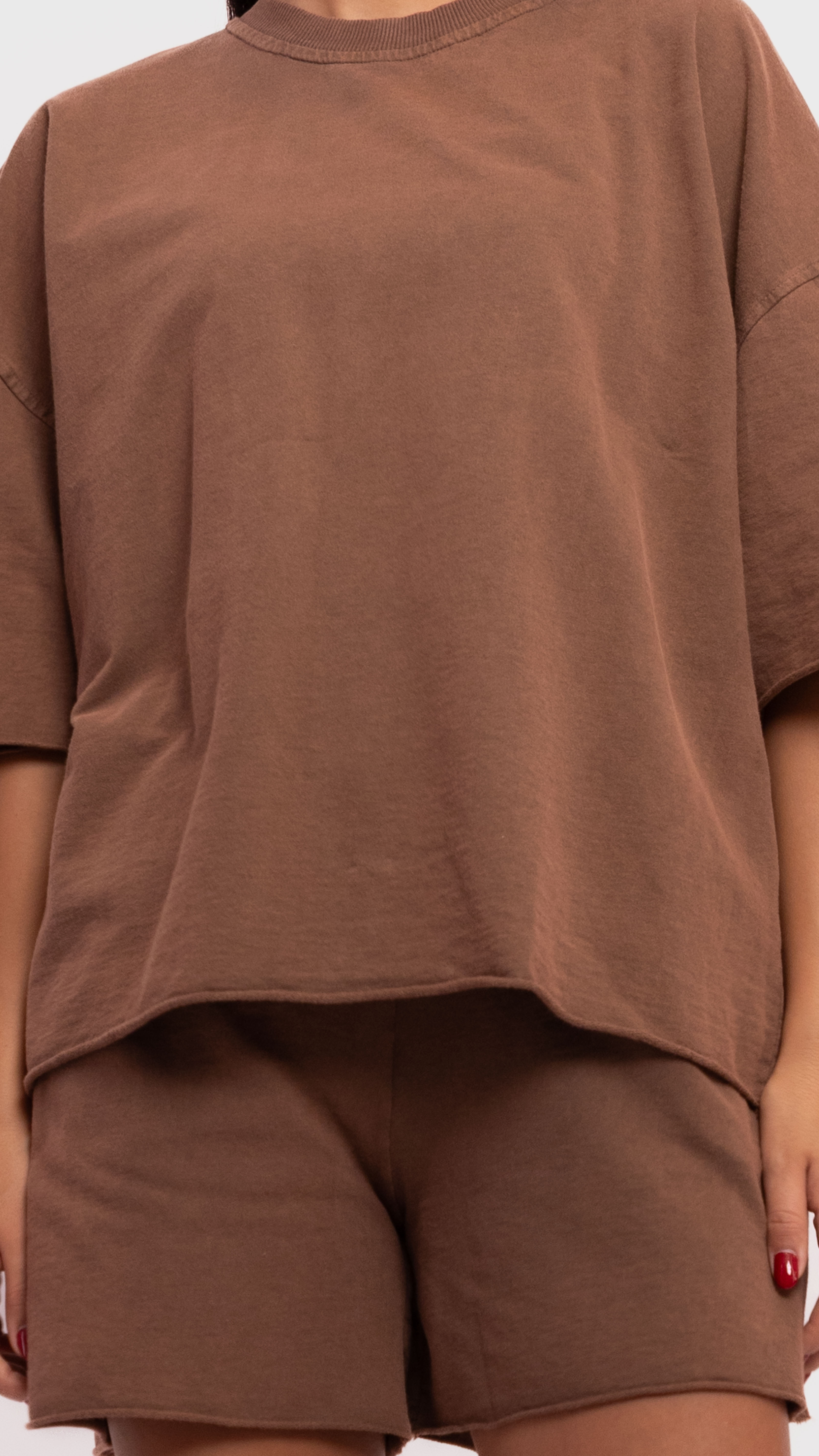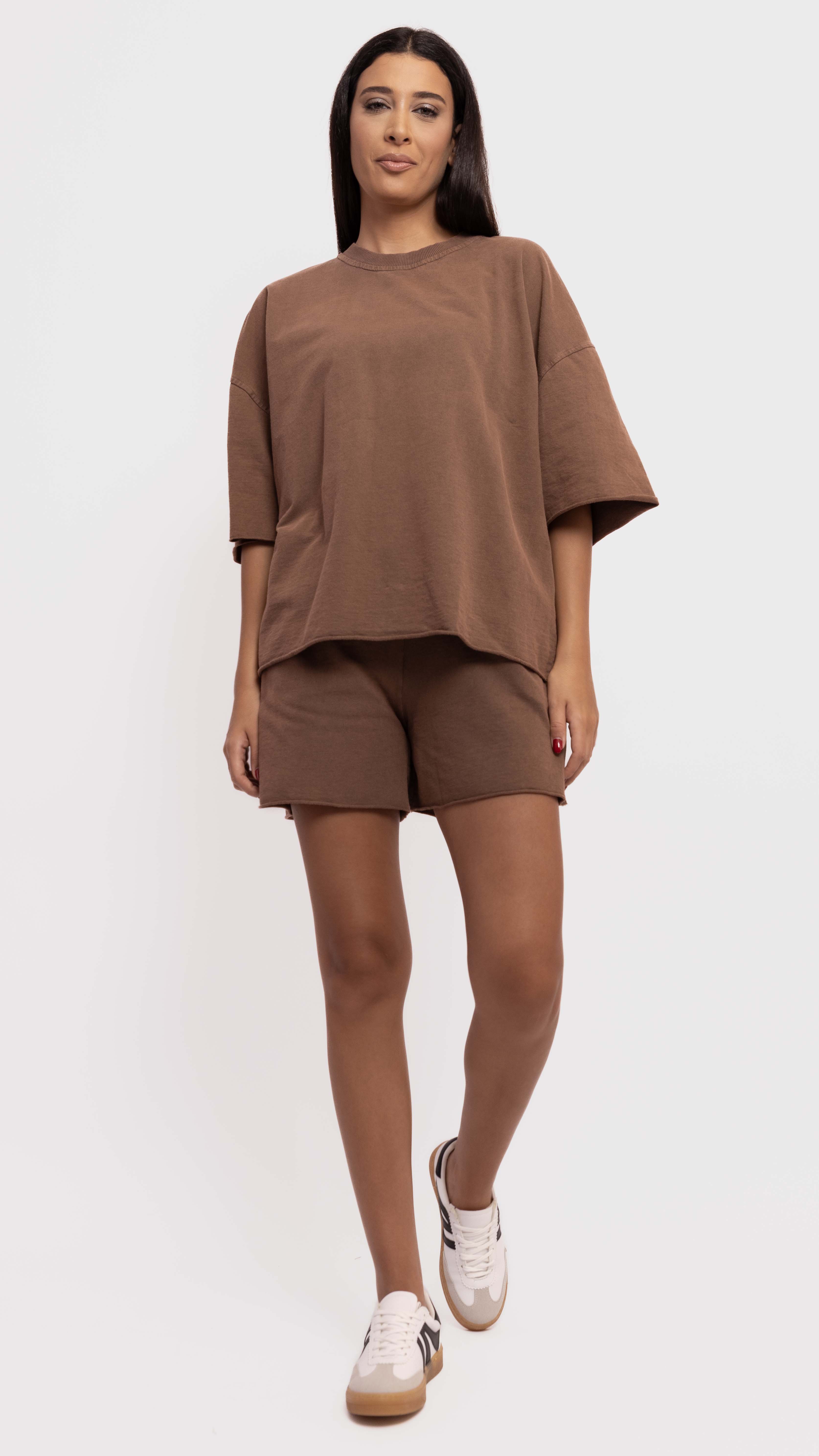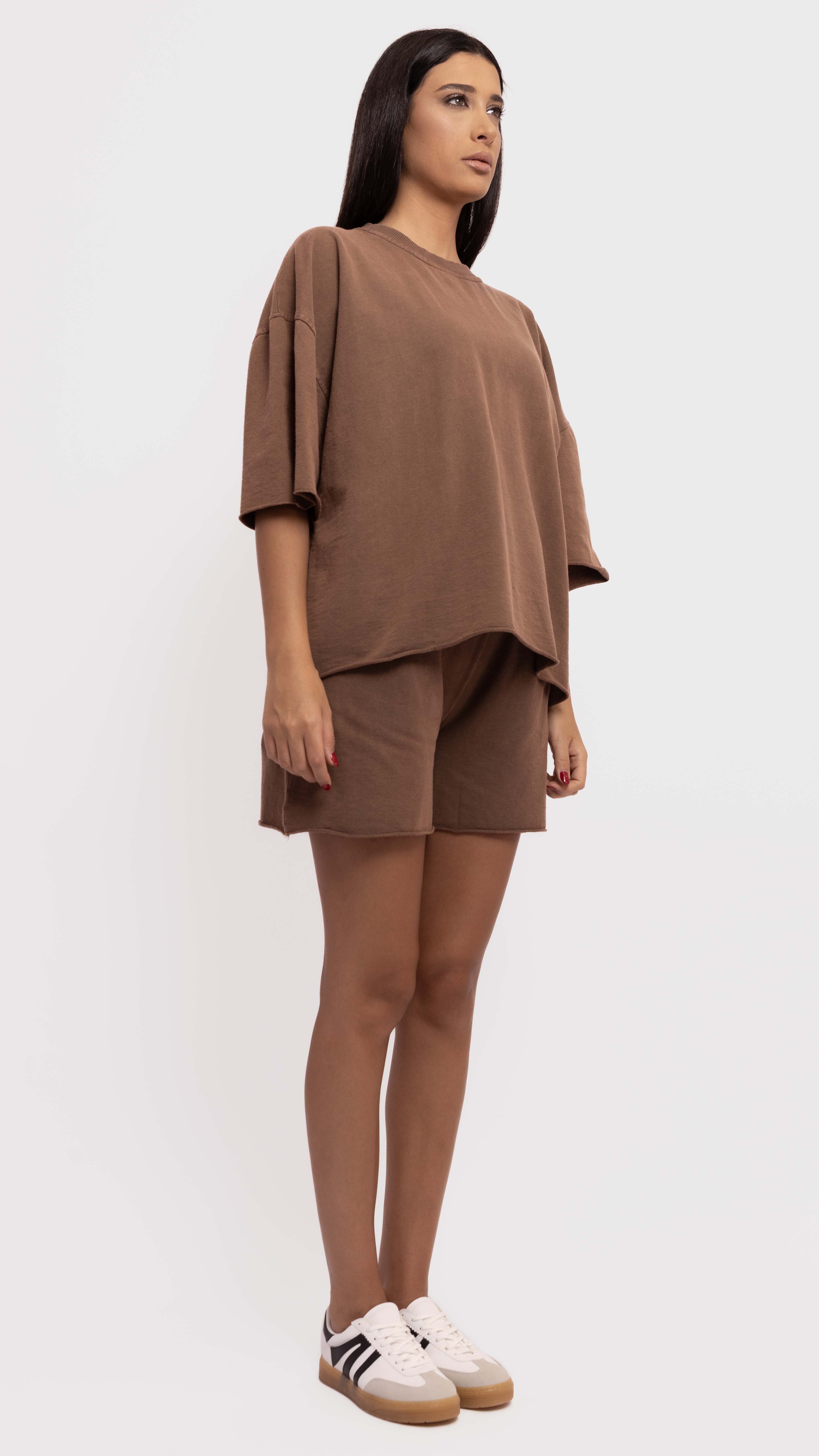 This minimal two-piece loungewear set offers the perfect blend of comfort and cool. Featuring an oversized short-sleeve t-shirt with a relaxed fit and a pair of matching high-rise shorts with an elastic drawstring waistband, this look is made for effortless lounging. The soft knit fabric adds extra comfort, making it ideal for home, errands, or laid-back days out.