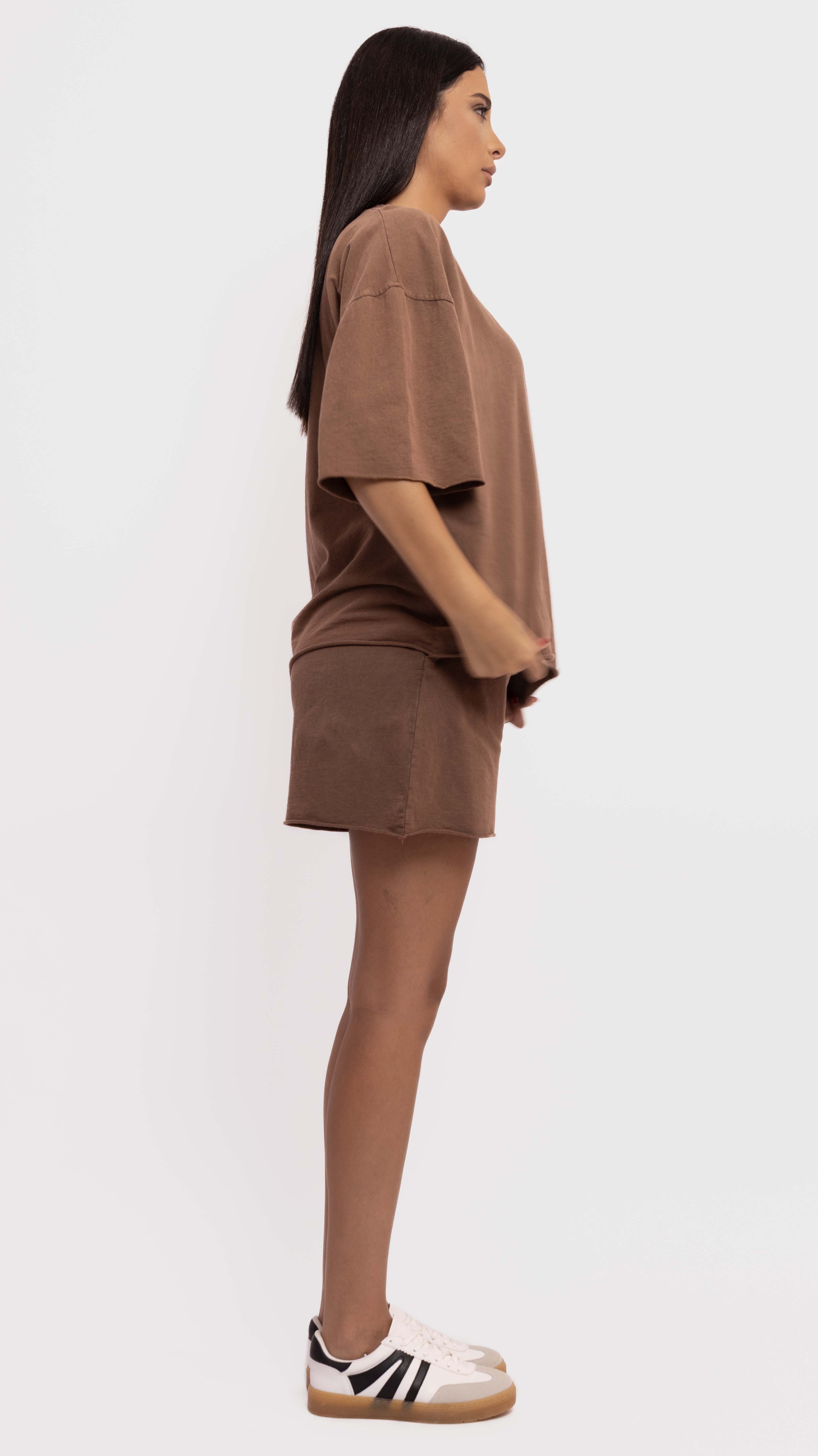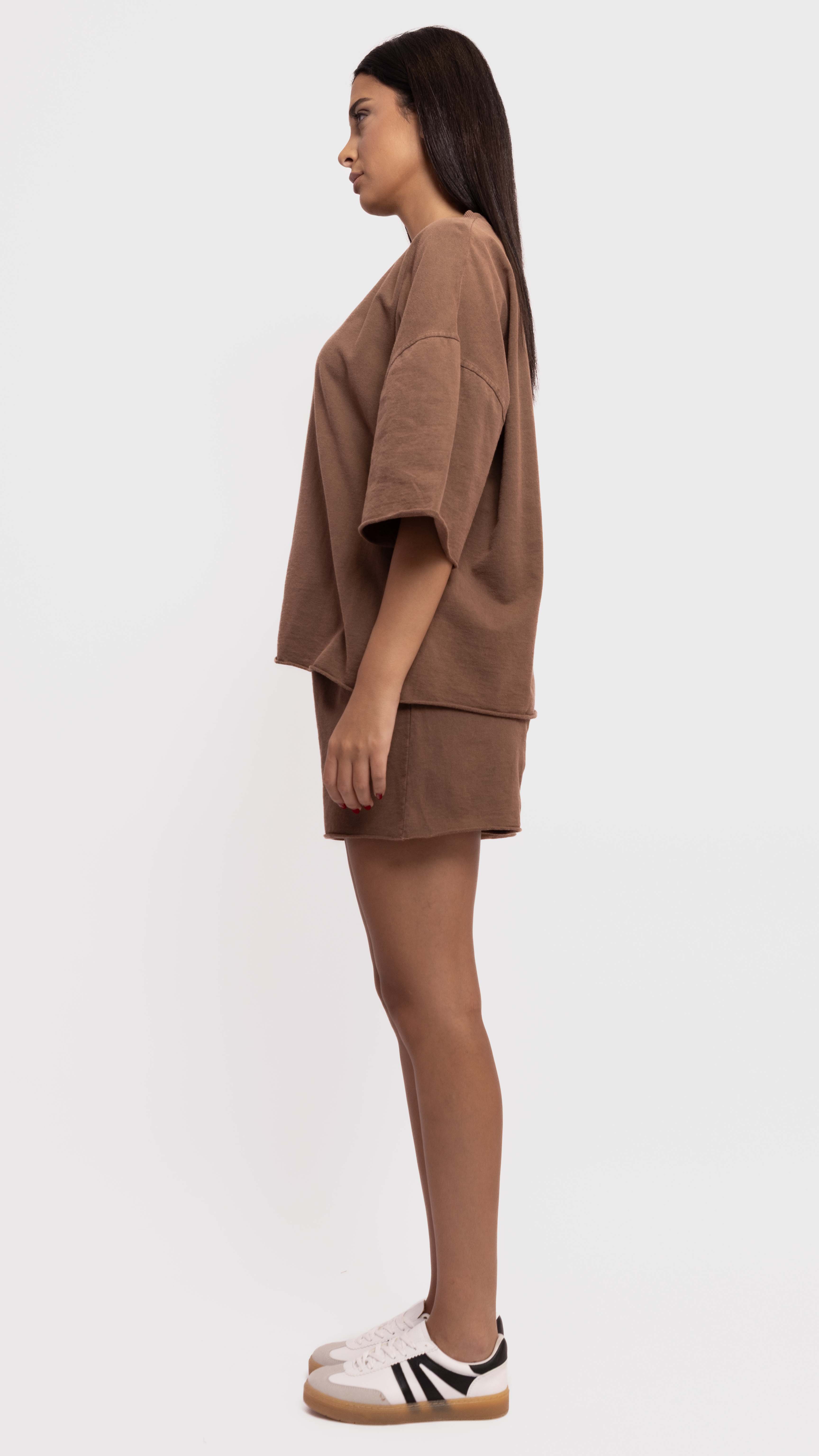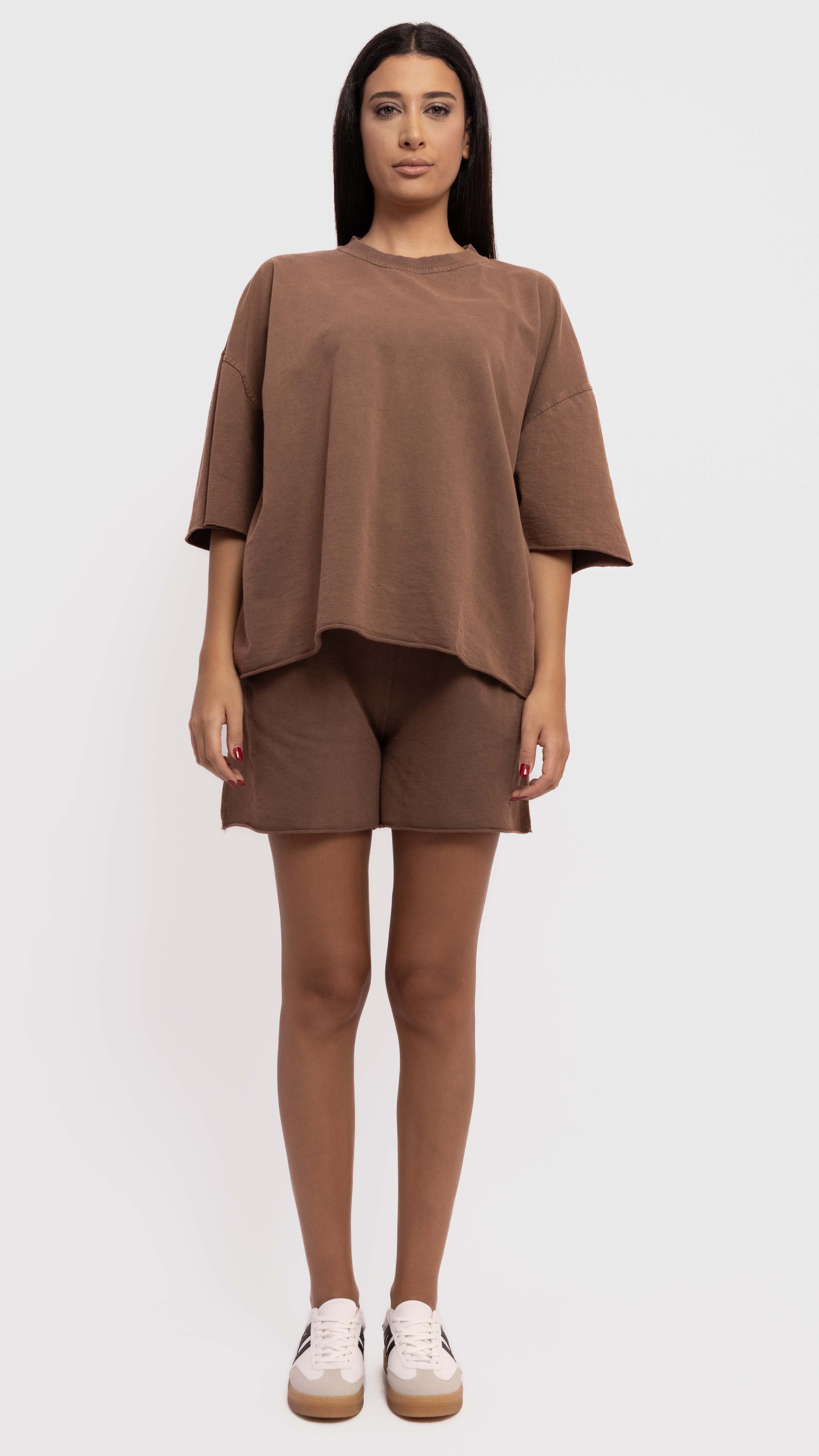 This minimal two-piece loungewear set offers the perfect blend of comfort and cool. Featuring an oversized short-sleeve t-shirt with a relaxed fit and a pair of matching high-rise shorts with an elastic drawstring waistband, this look is made for effortless lounging. The soft knit fabric adds extra comfort, making it ideal for home, errands, or laid-back days out.
