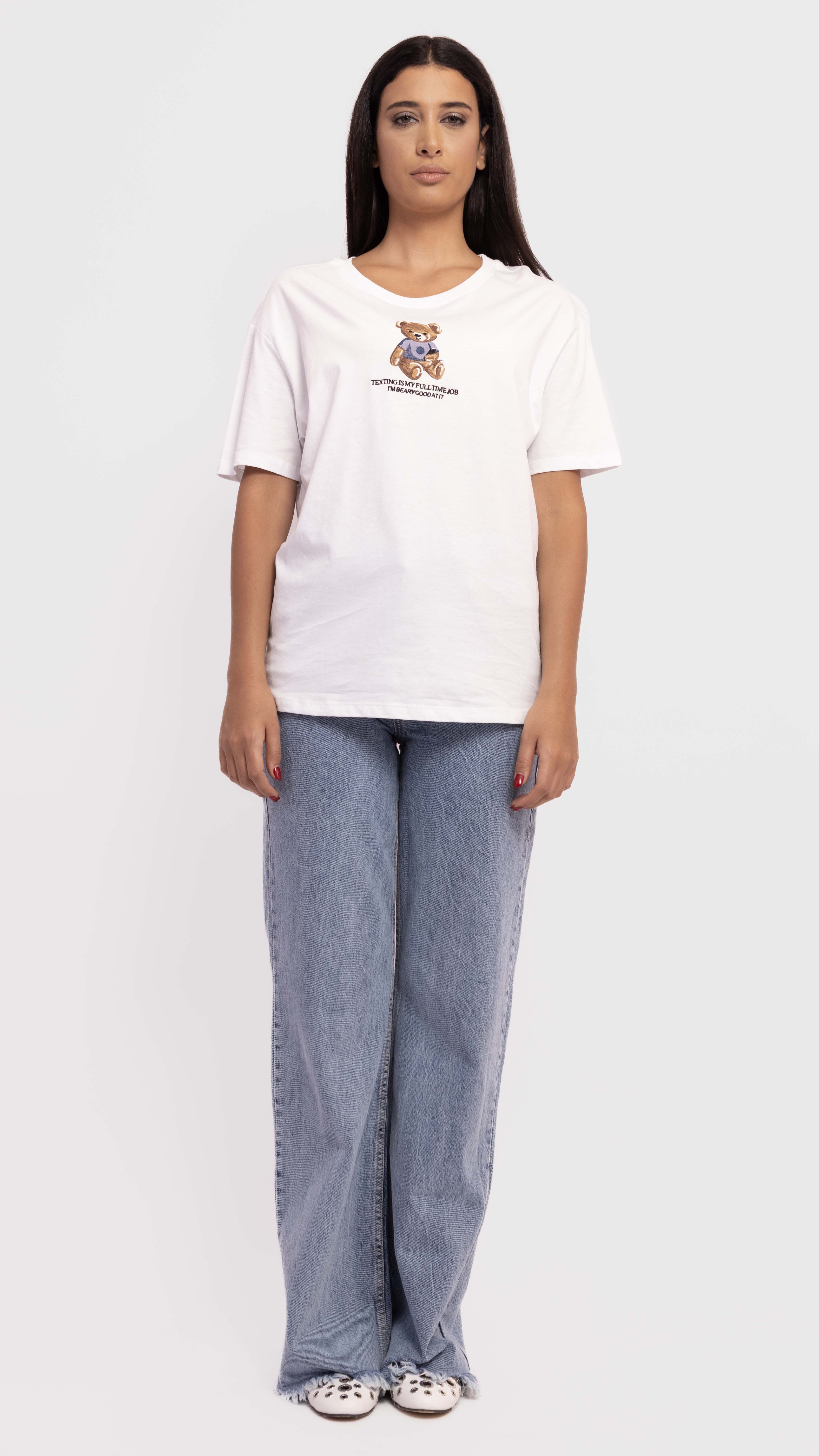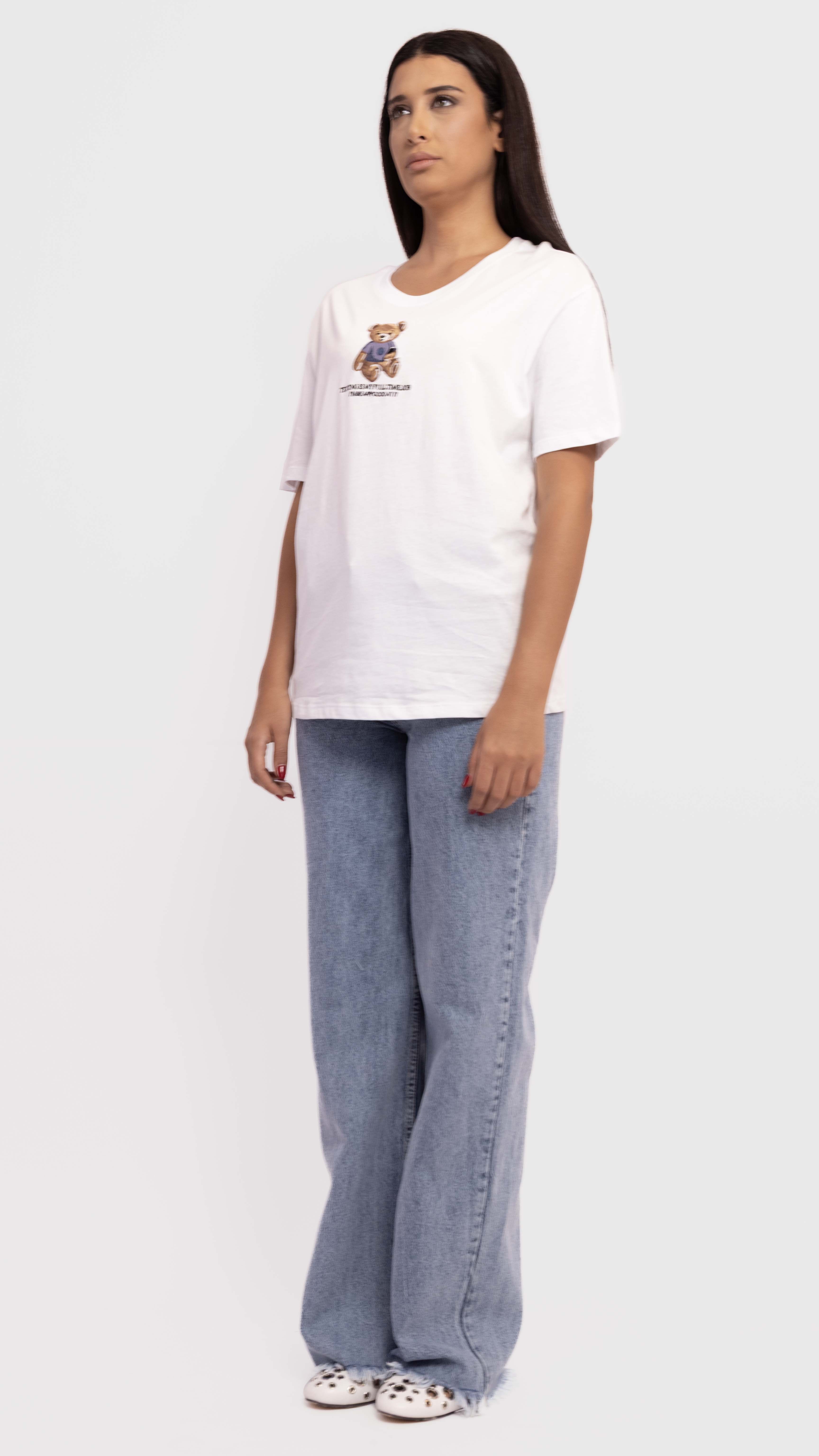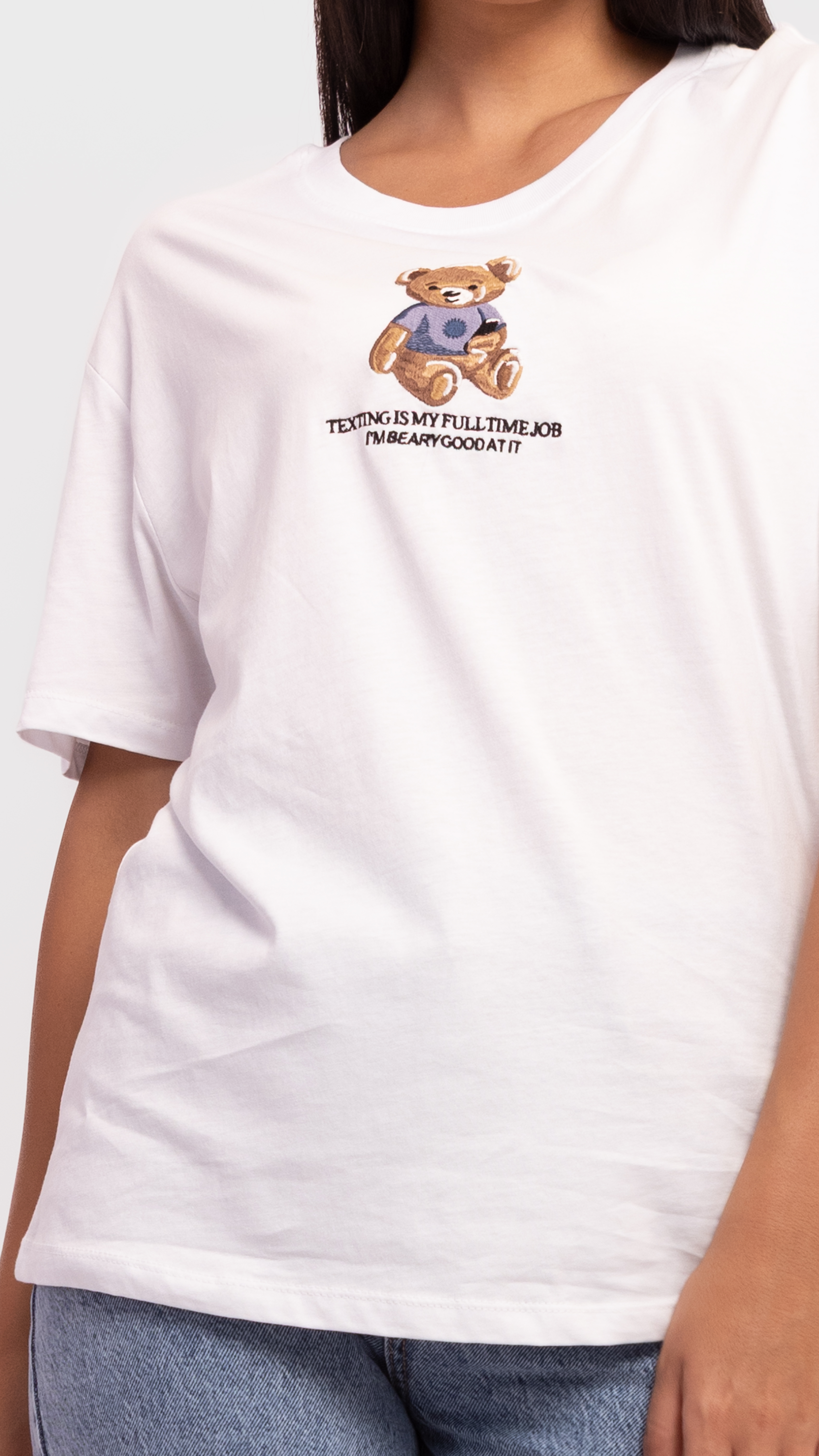 Add a dose of fun to your casual wardrobe with this embroidered tee. Featuring a playful teddy bear design and a witty slogan, this soft white T-shirt combines comfort with charm. Perfect for relaxed outings, lounging, or gifting.