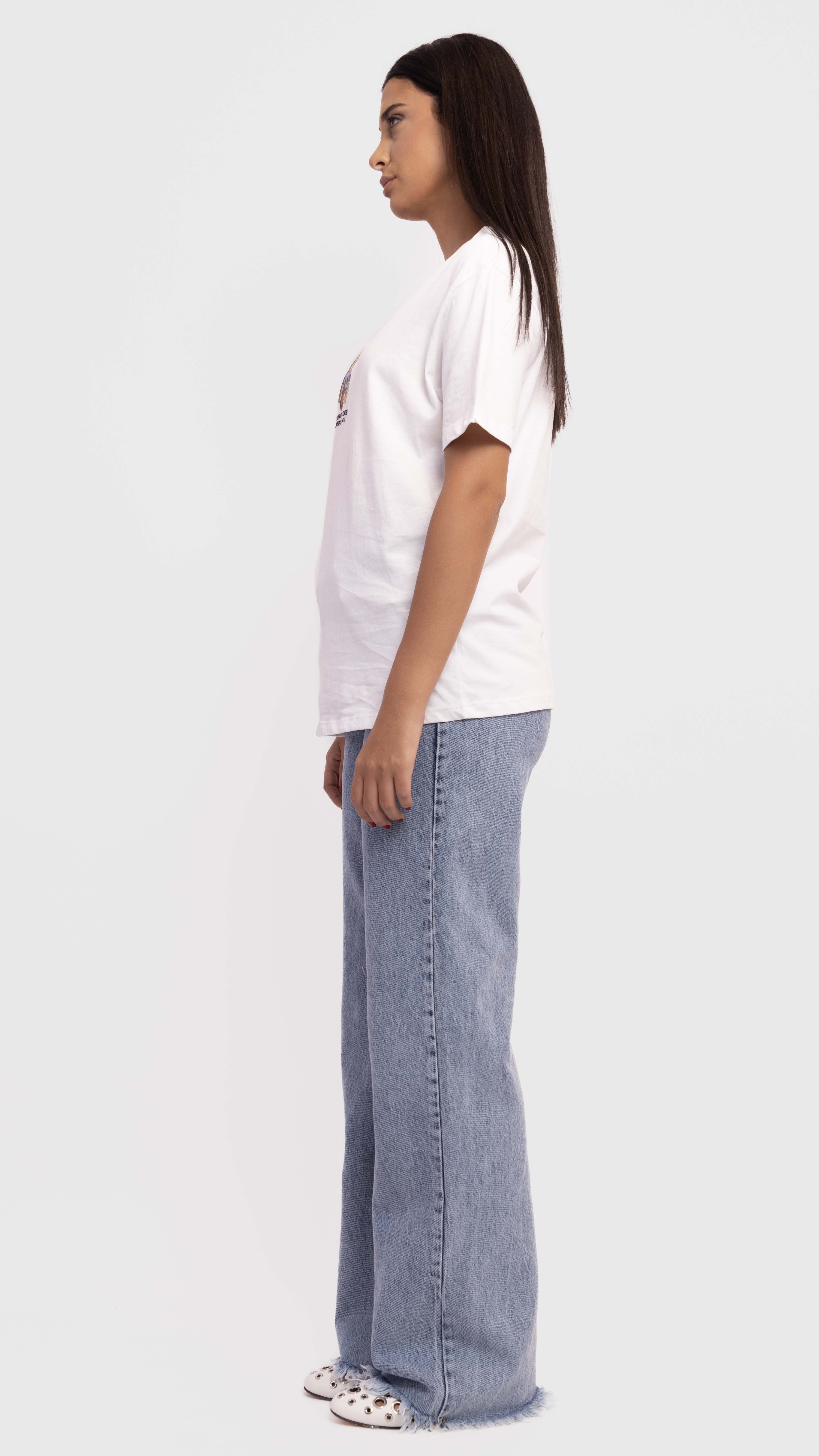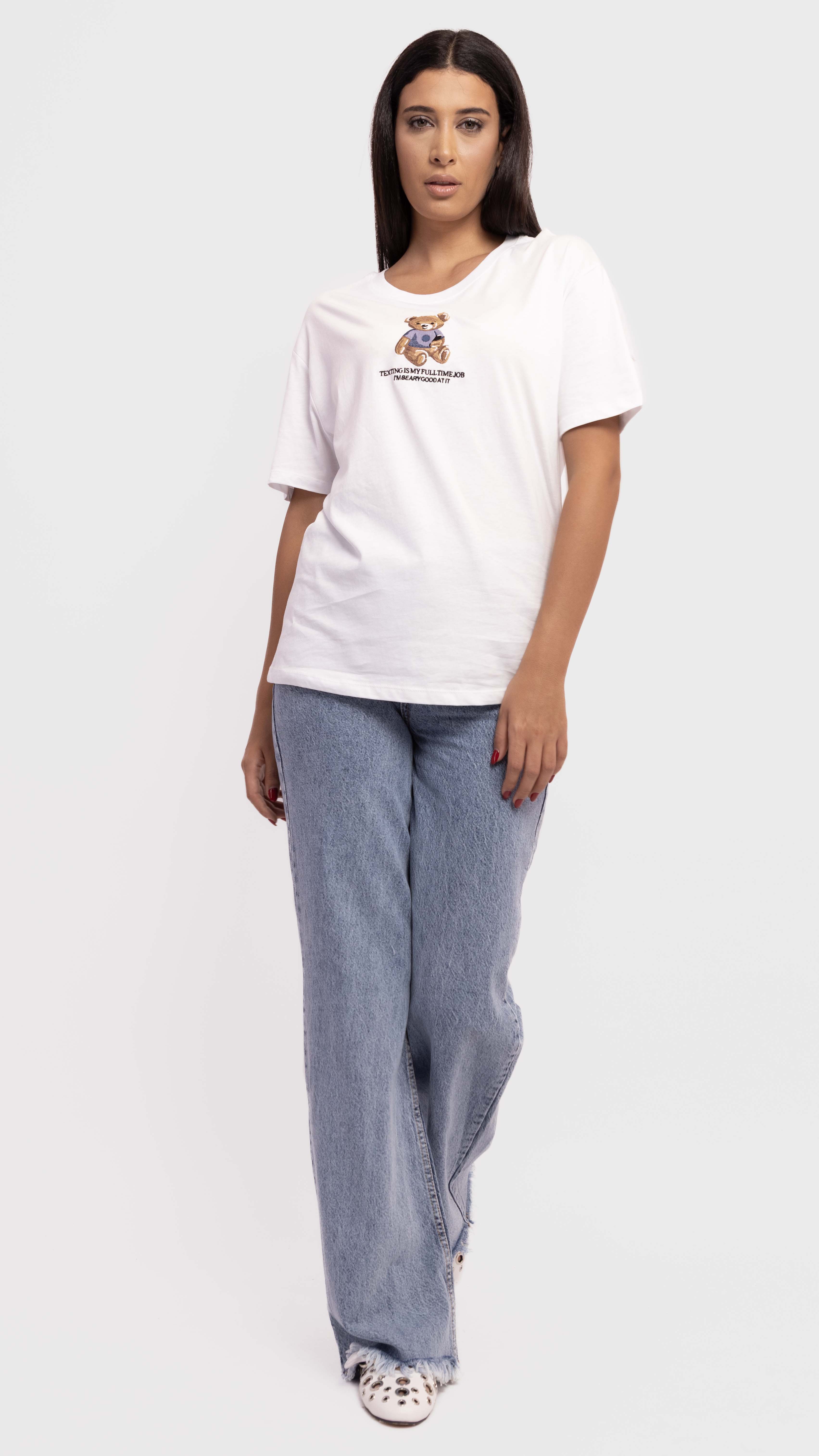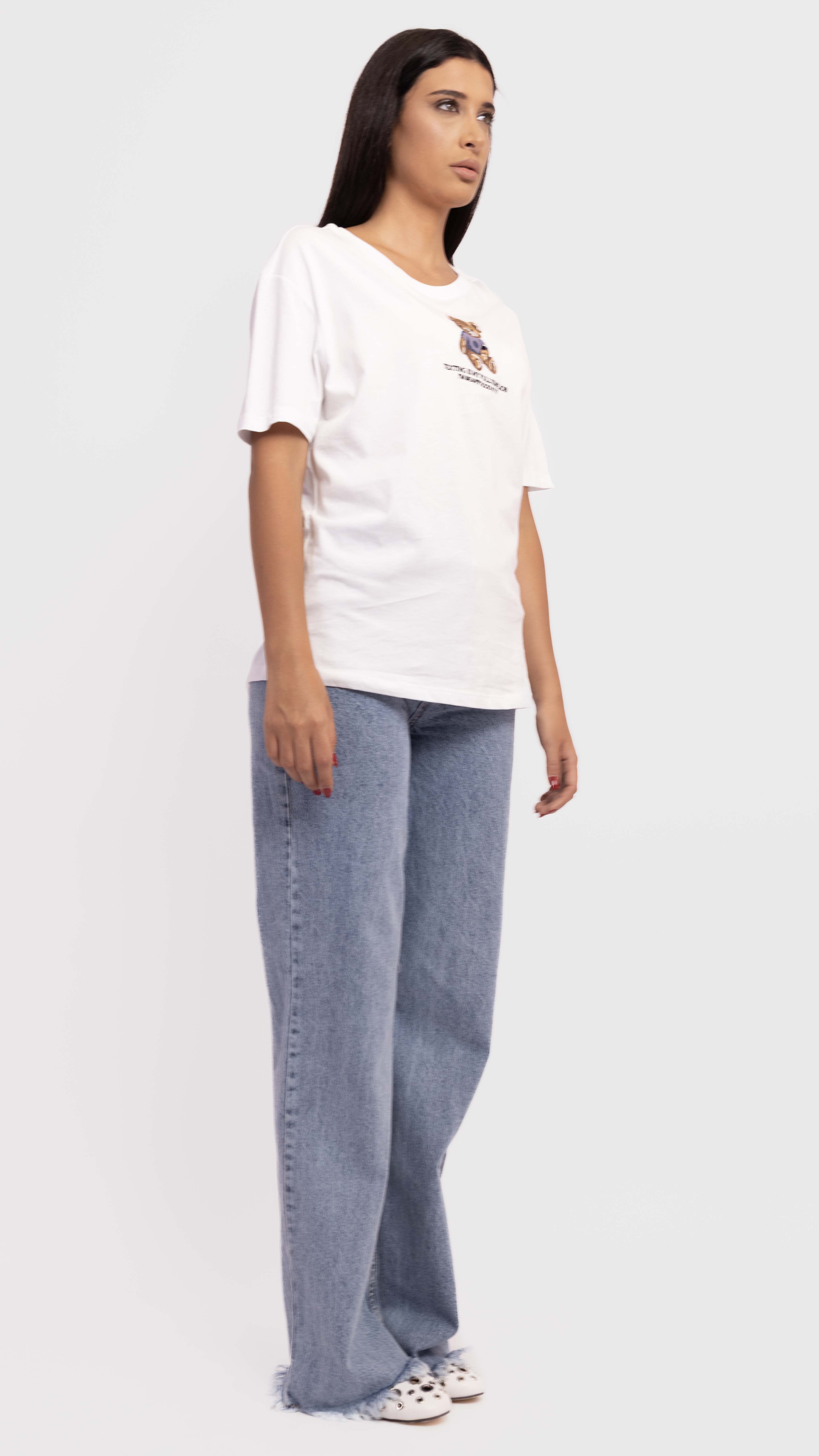 Add a dose of fun to your casual wardrobe with this embroidered tee. Featuring a playful teddy bear design and a witty slogan, this soft white T-shirt combines comfort with charm. Perfect for relaxed outings, lounging, or gifting.