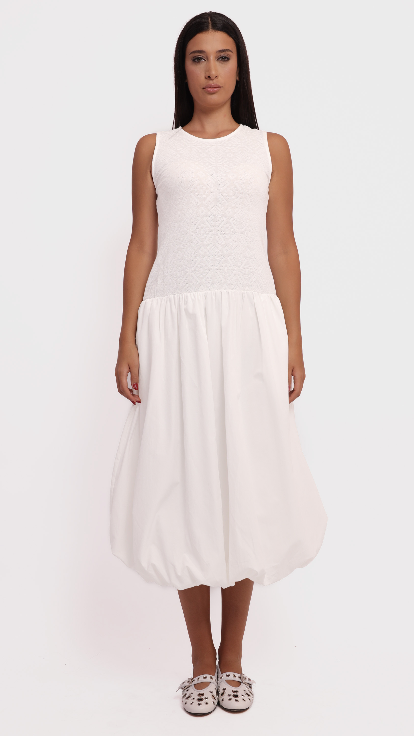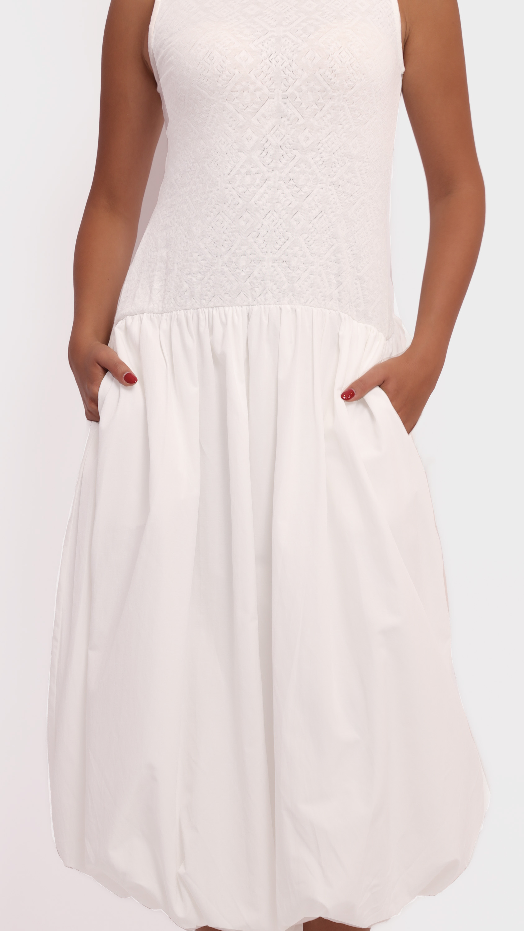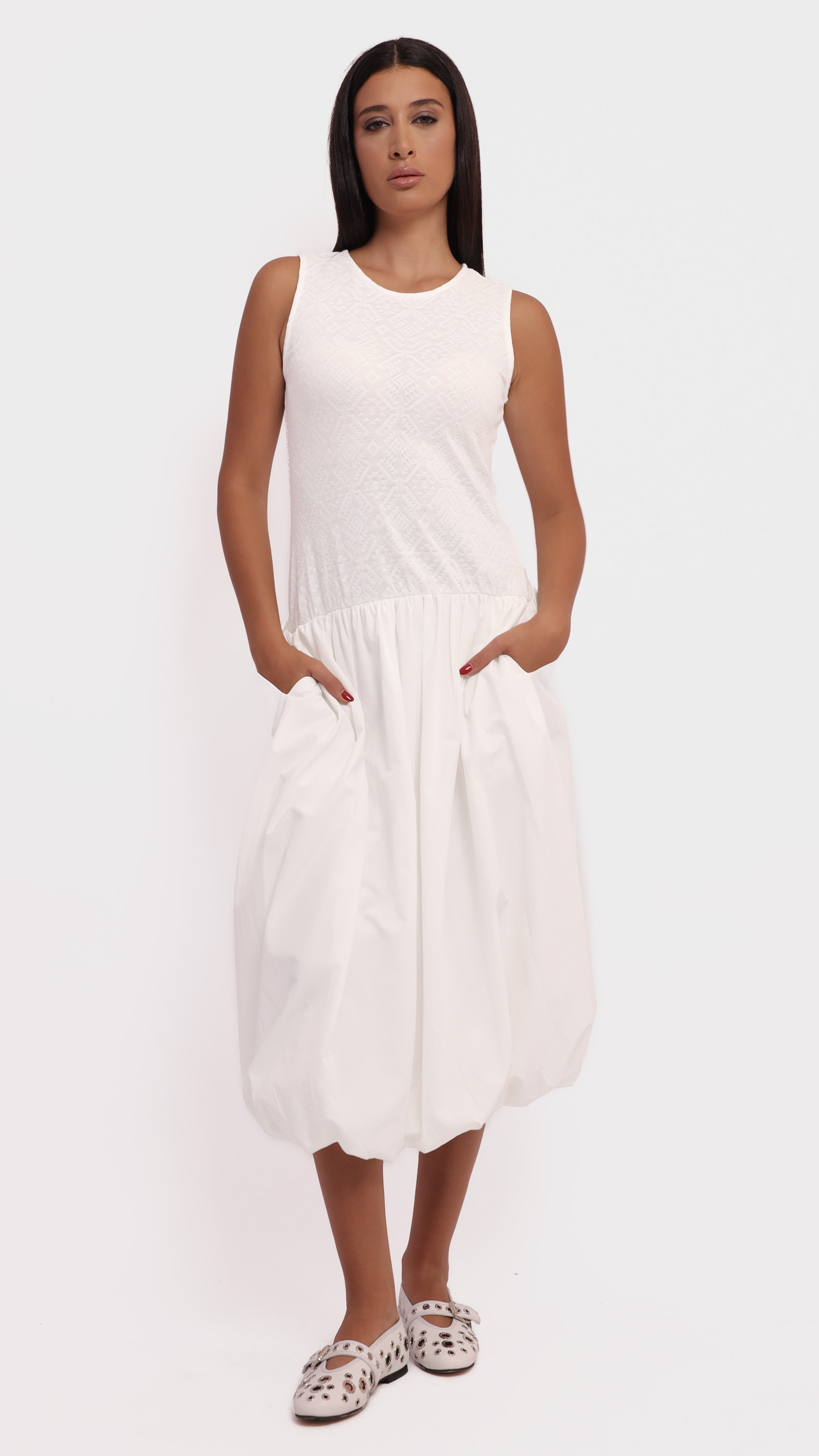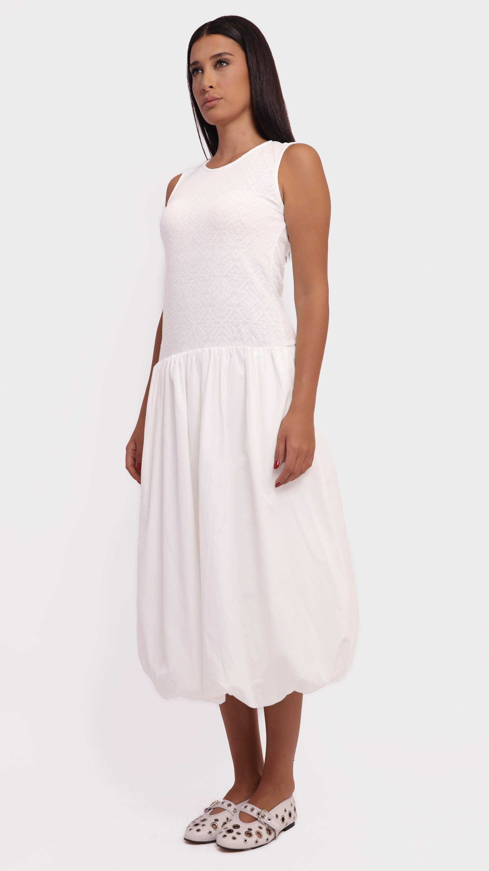 This elegant sleeveless white dress features a textured bodice and a drop-waist silhouette that flows into a voluminous balloon-style skirt. A perfect mix of classic and trendy, ideal for summer outings, brunches, or even casual events with a touch of style.