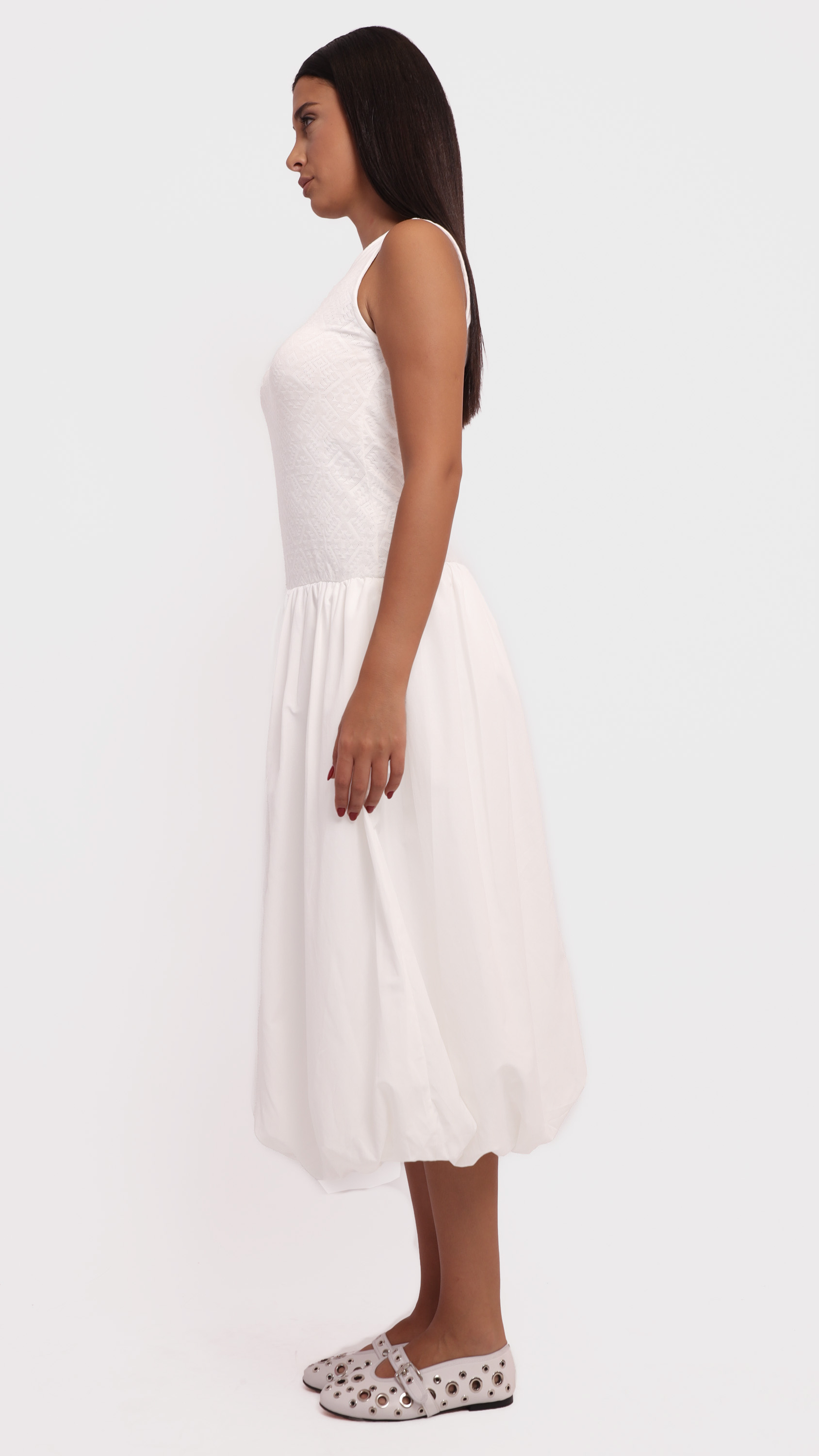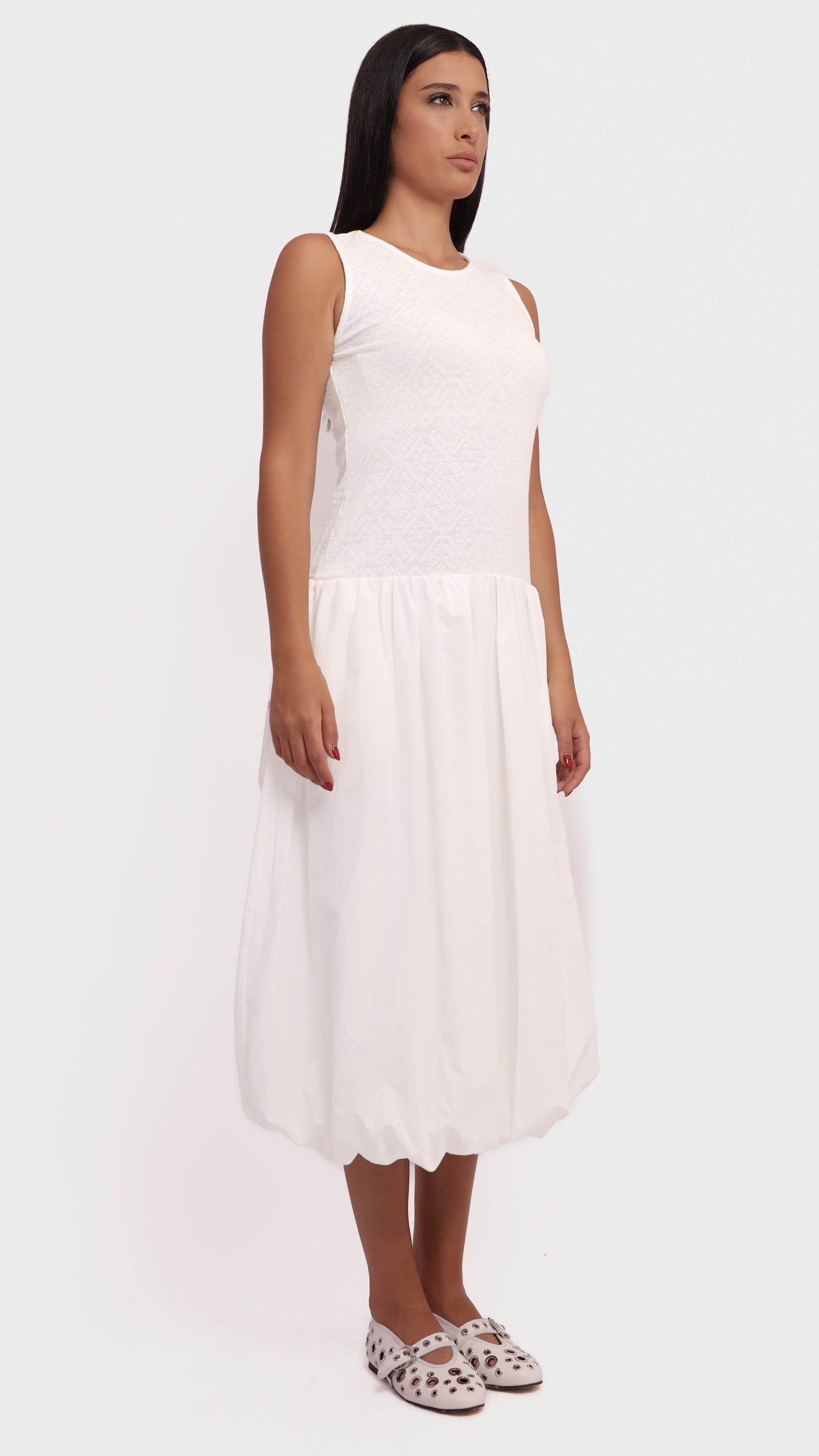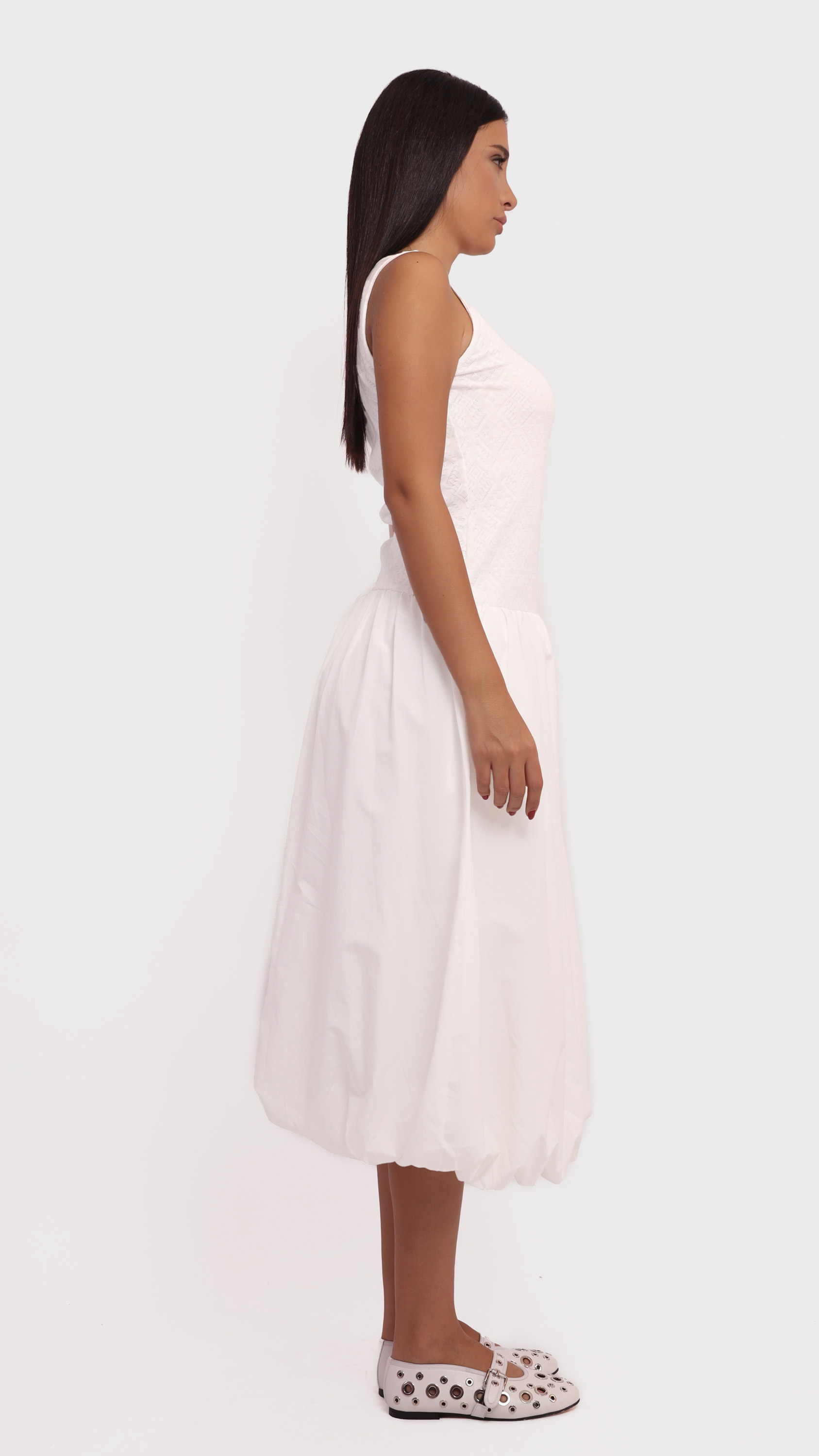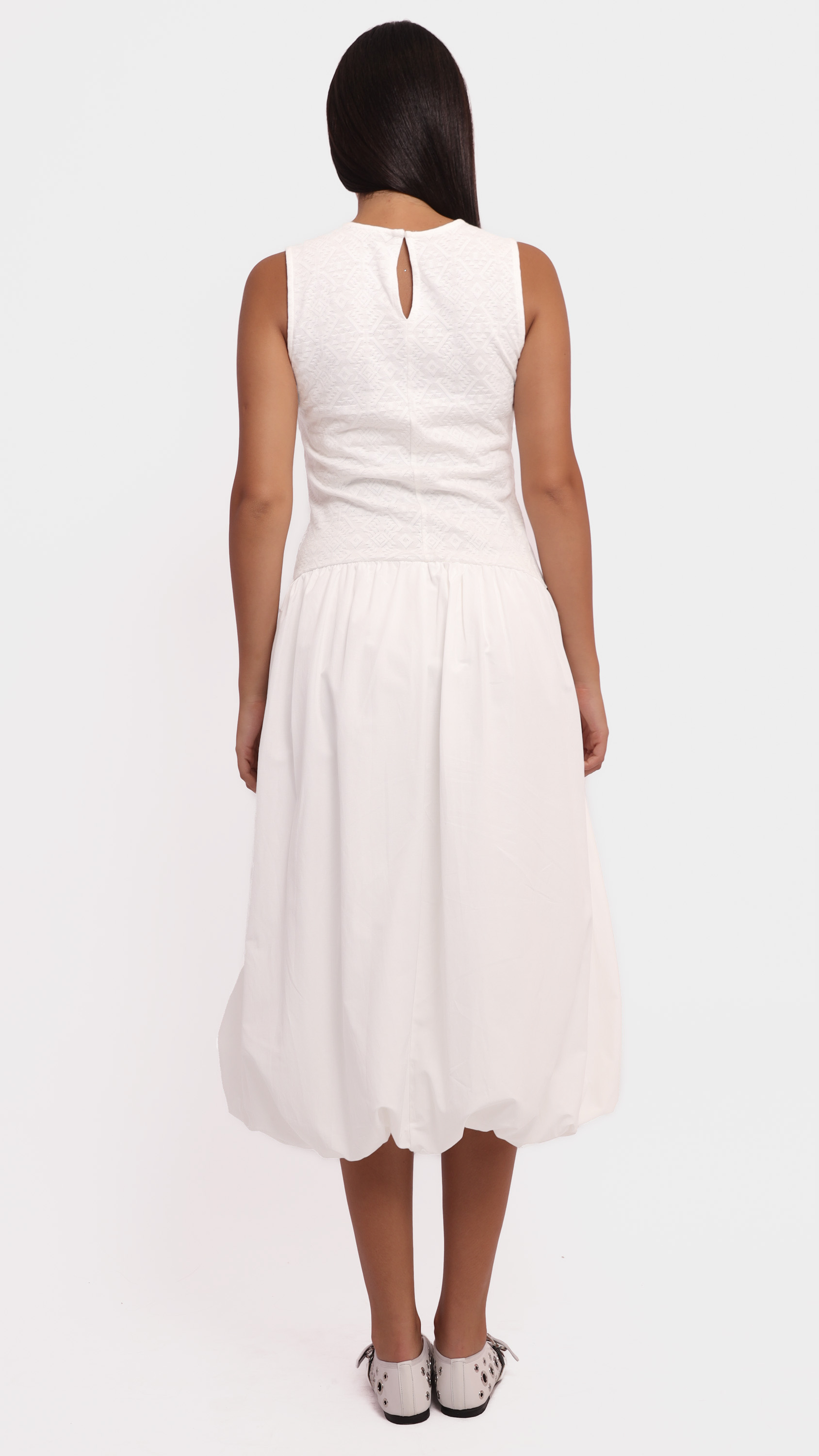This elegant sleeveless white dress features a textured bodice and a drop-waist silhouette that flows into a voluminous balloon-style skirt. A perfect mix of classic and trendy, ideal for summer outings, brunches, or even casual events with a touch of style.