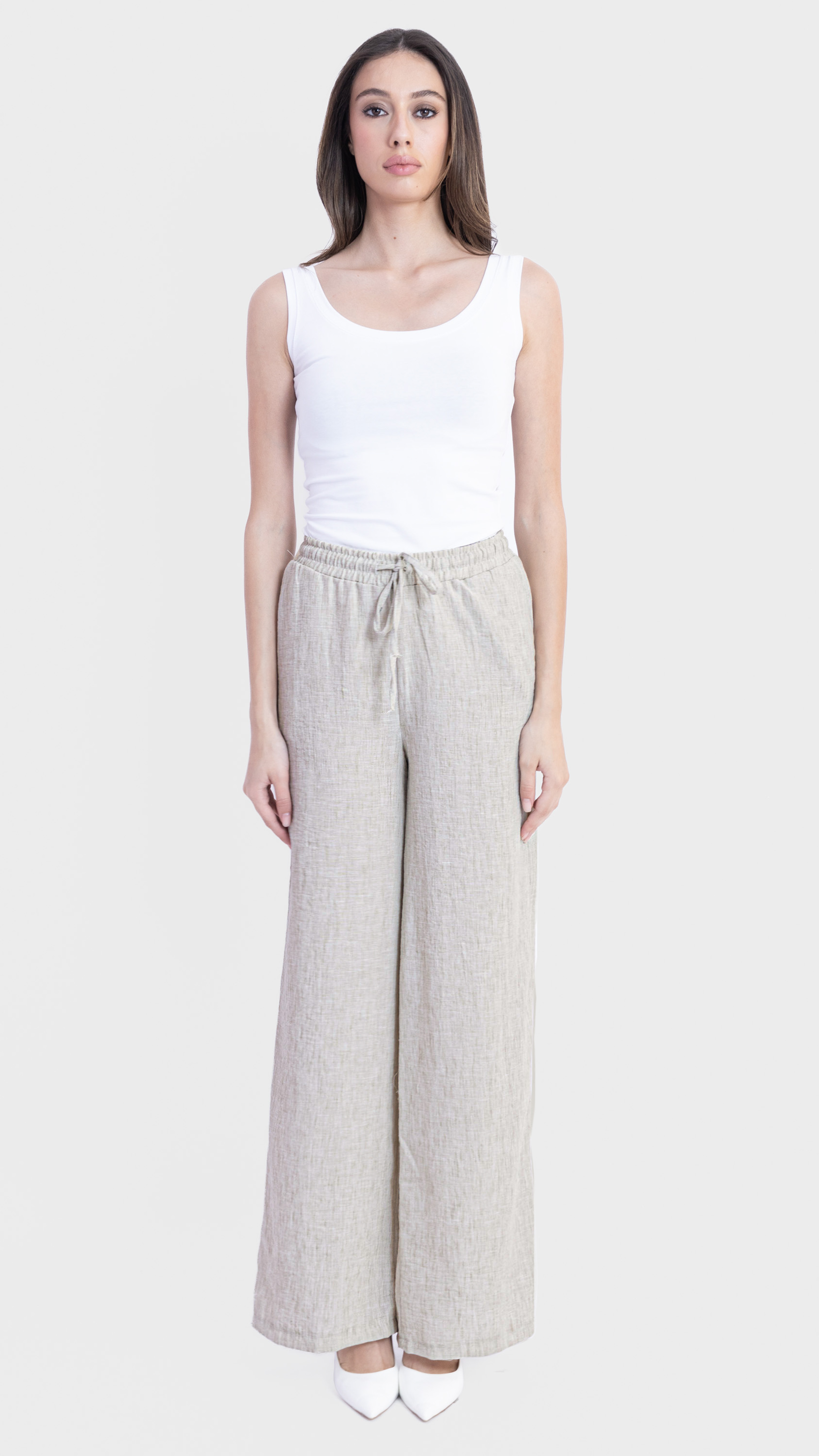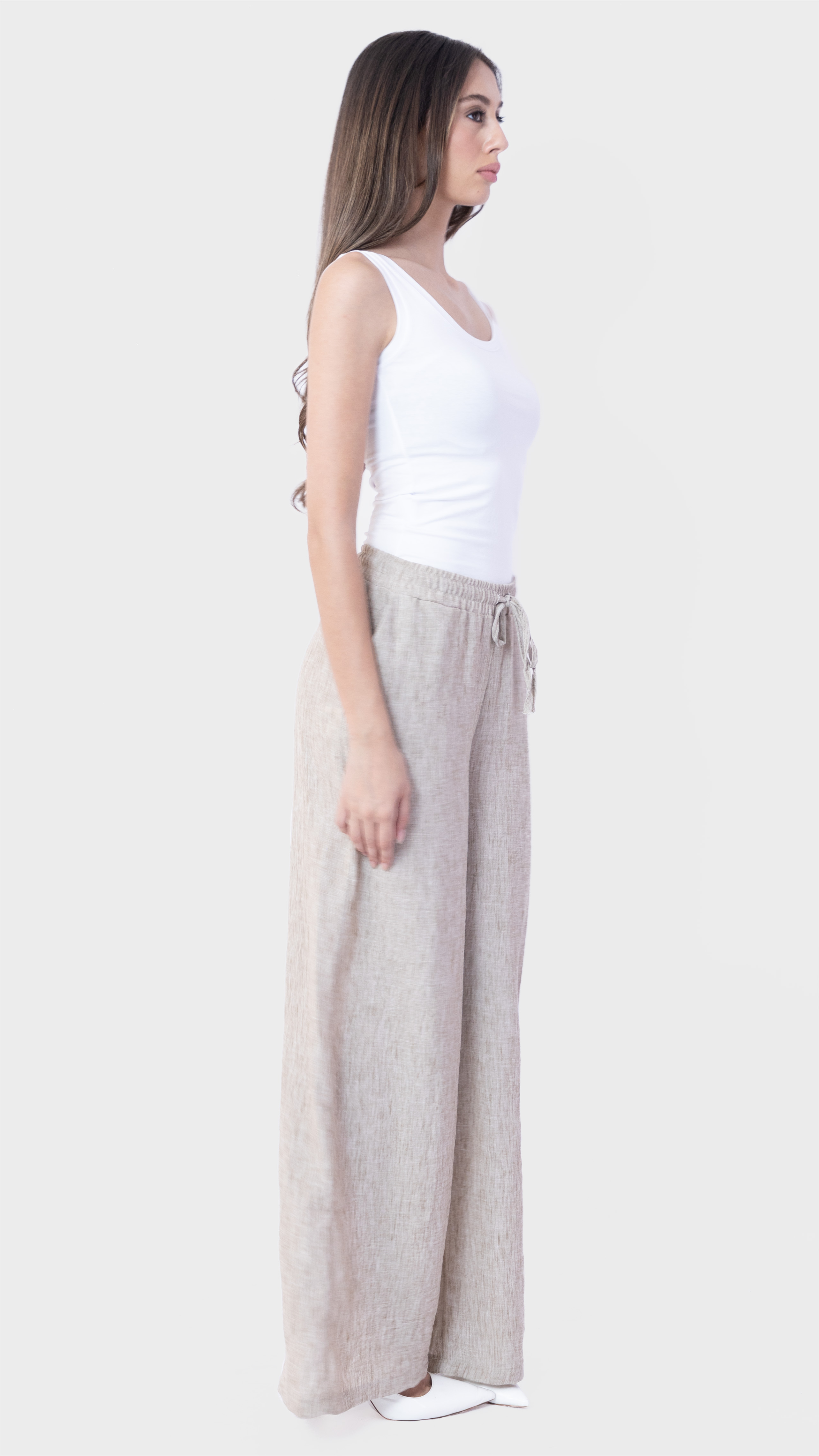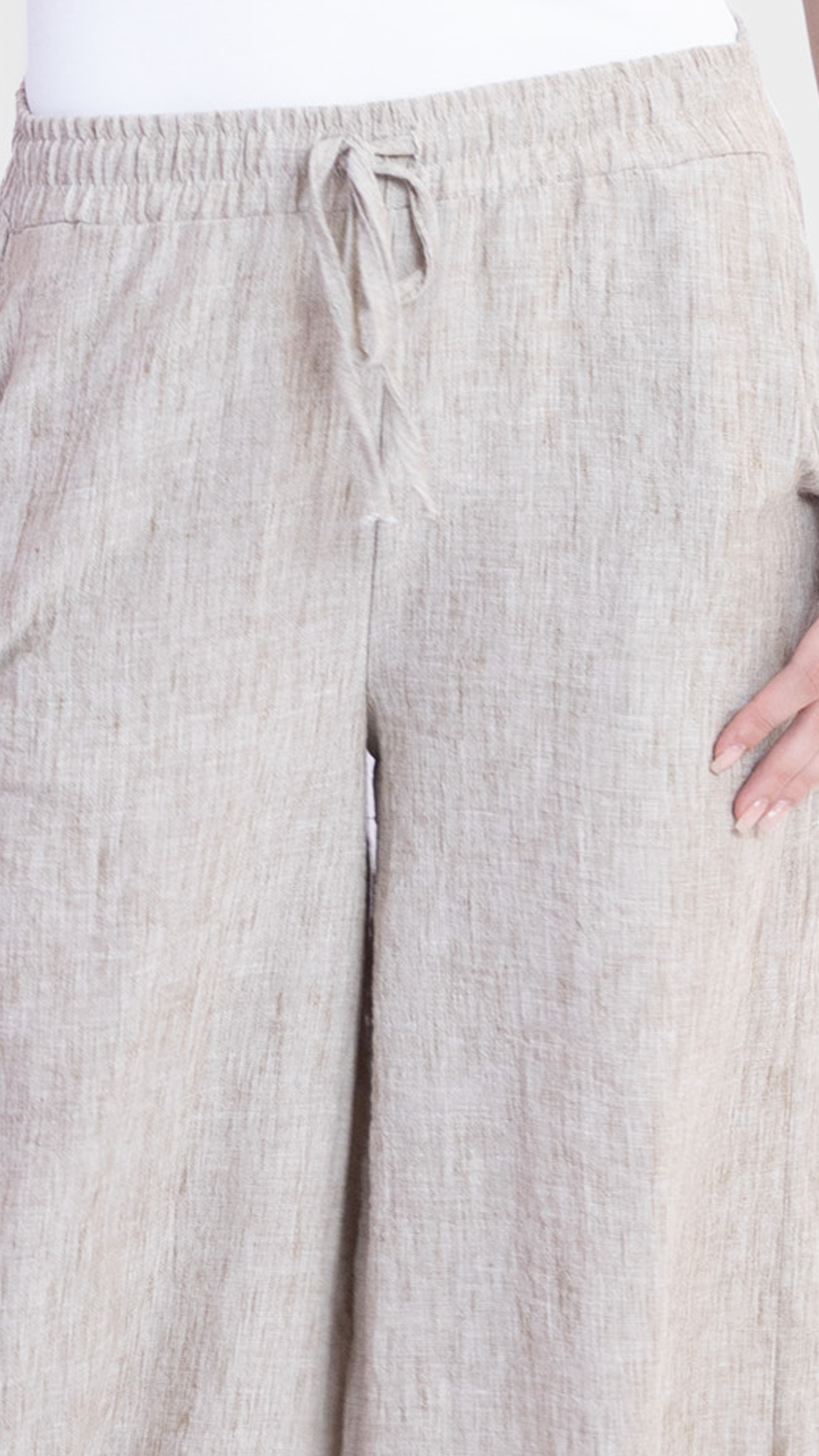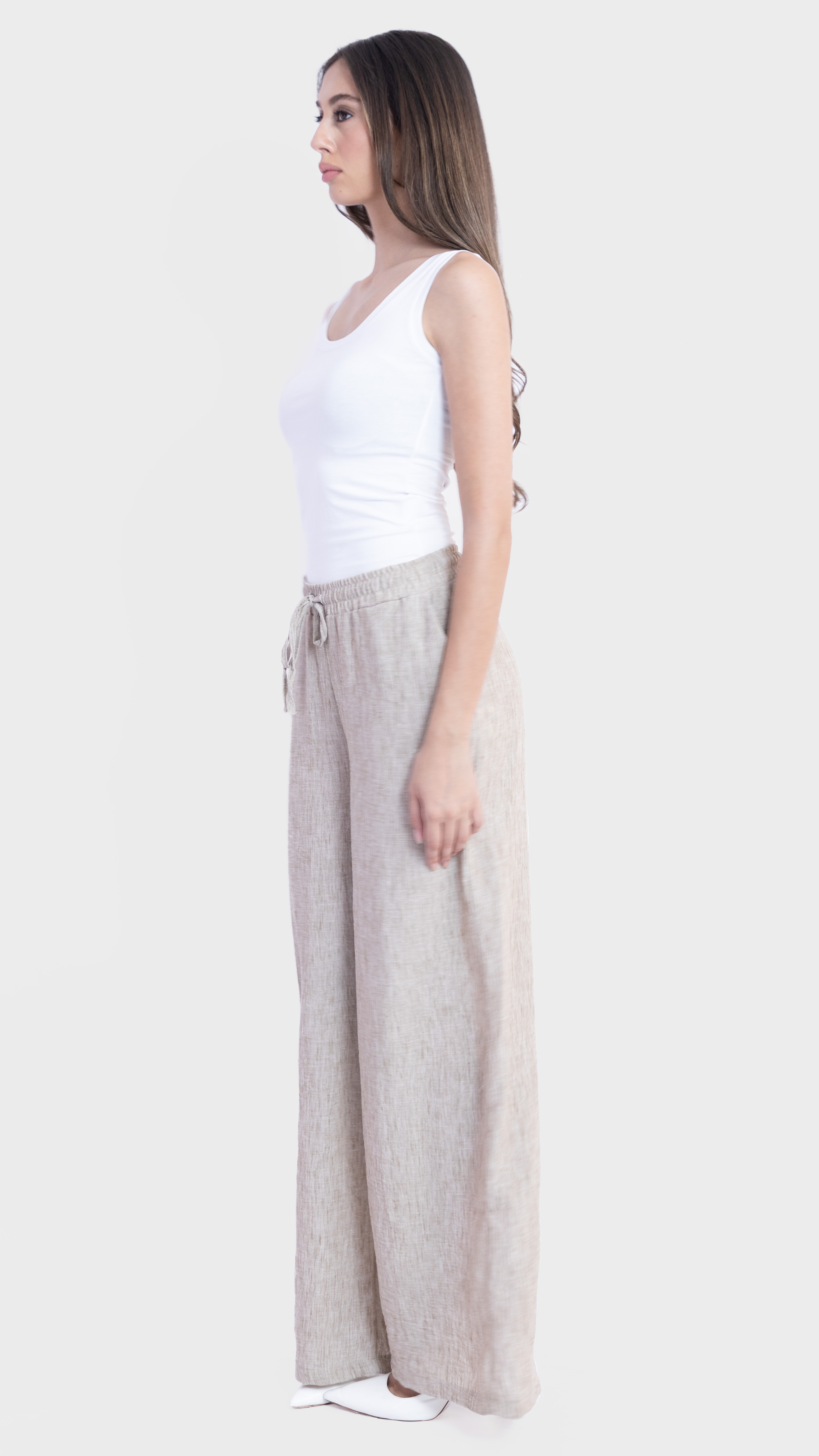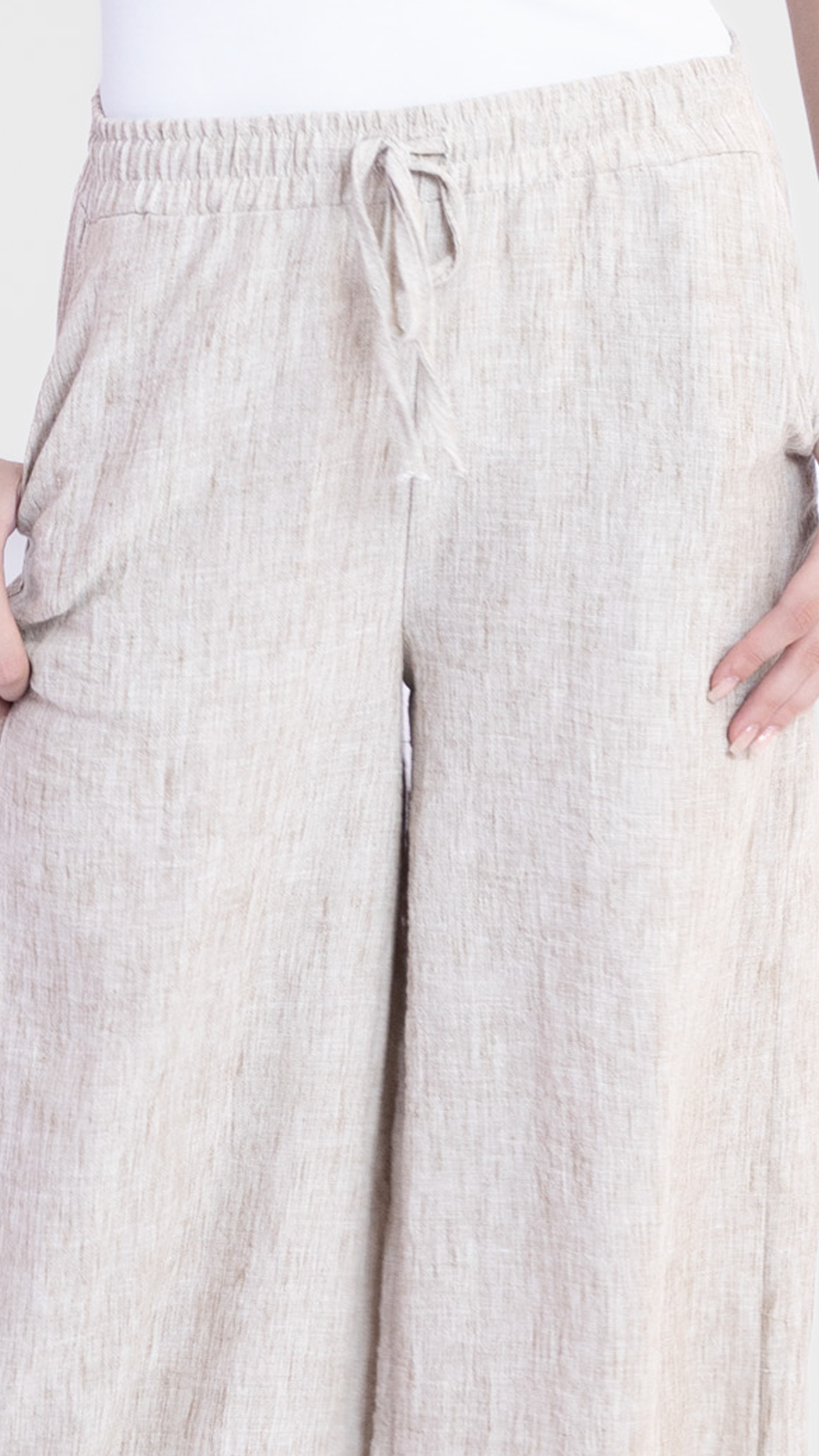 These wide-leg linen-blend pants are designed for effortless comfort and casual style. Featuring an elasticated waistband with a drawstring tie, they offer a relaxed fit that is perfect for warm weather. The lightweight, breathable fabric ensures comfort all day long, while the minimalist design makes them easy to style for various occasions.