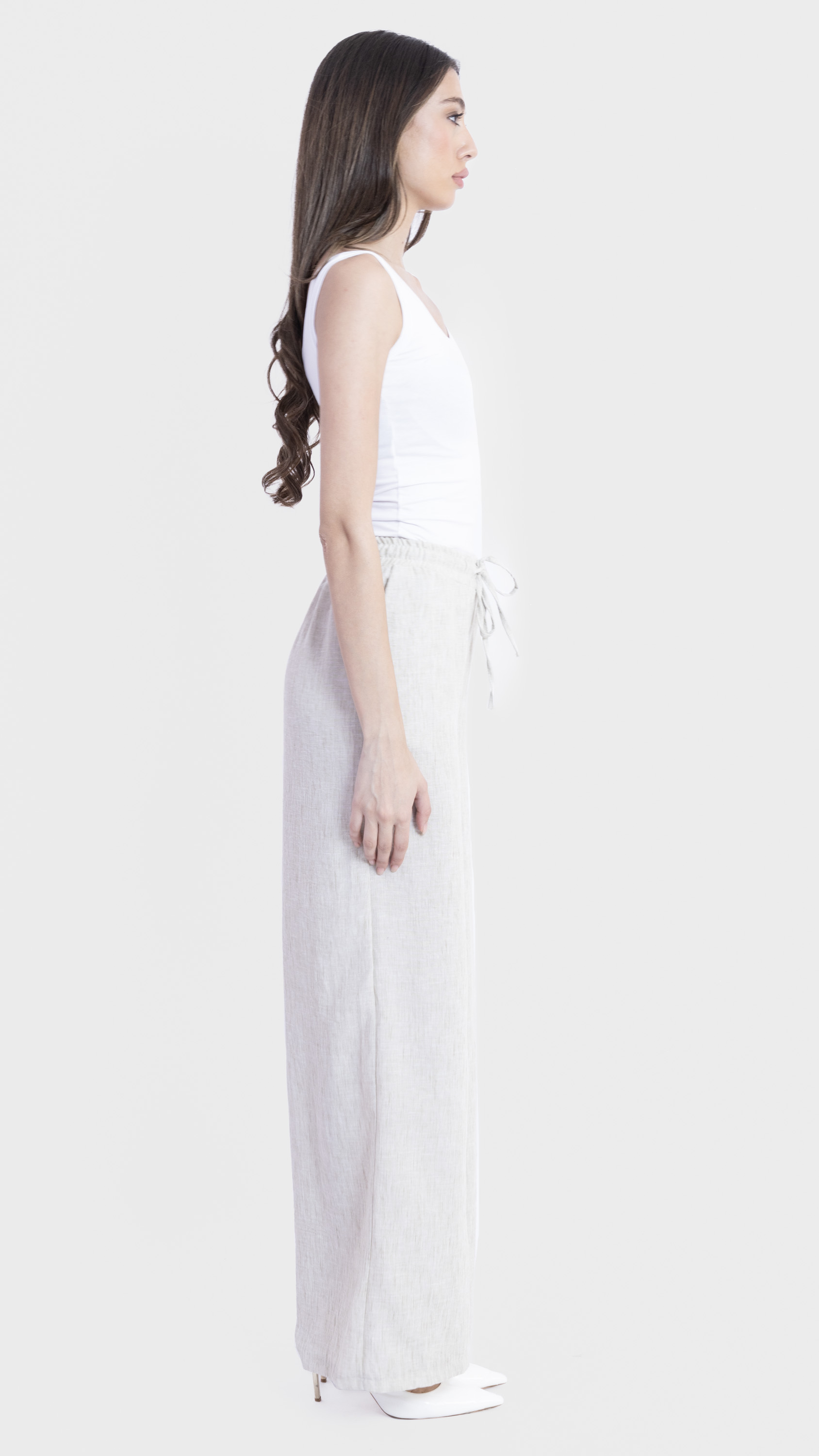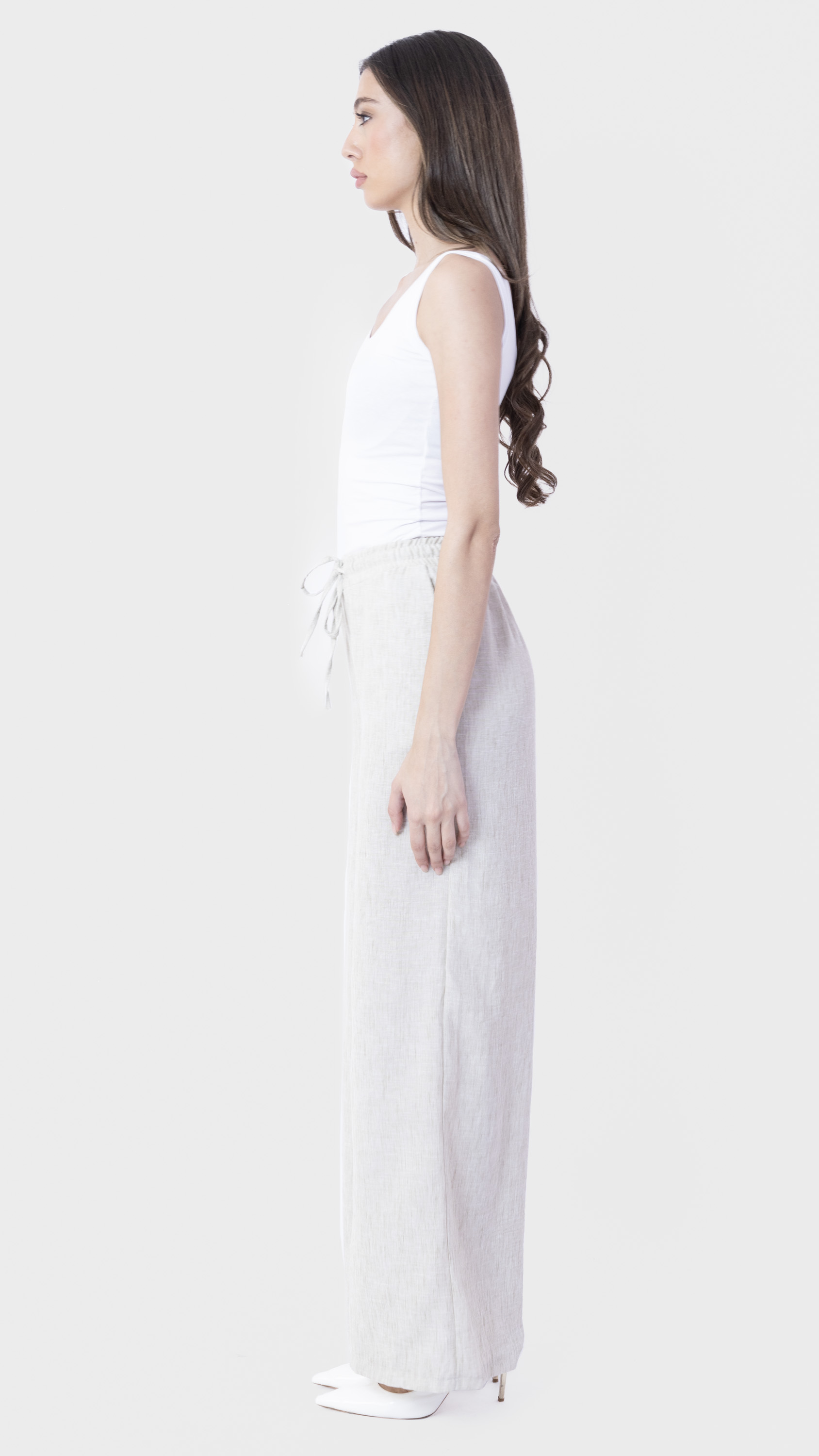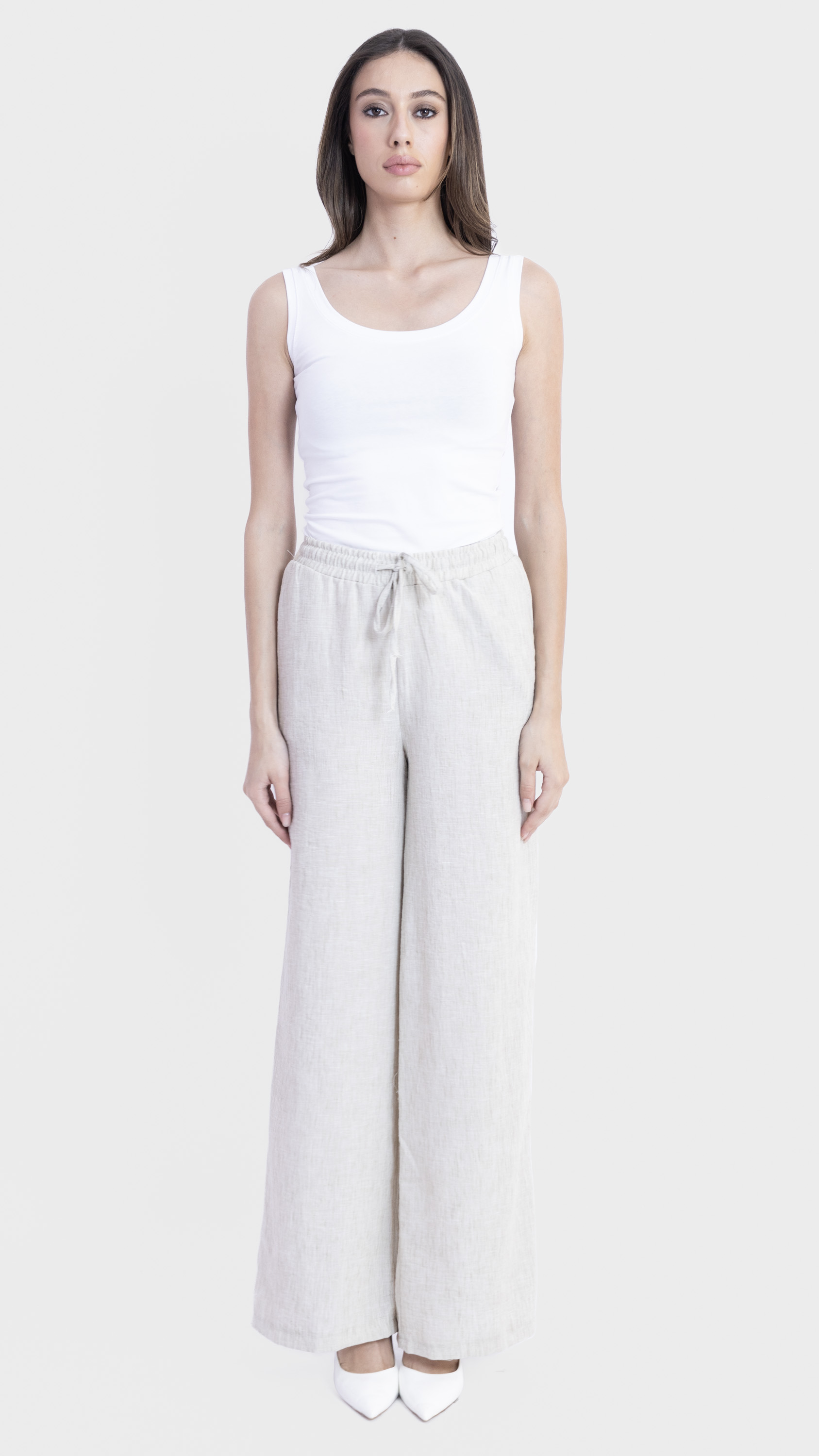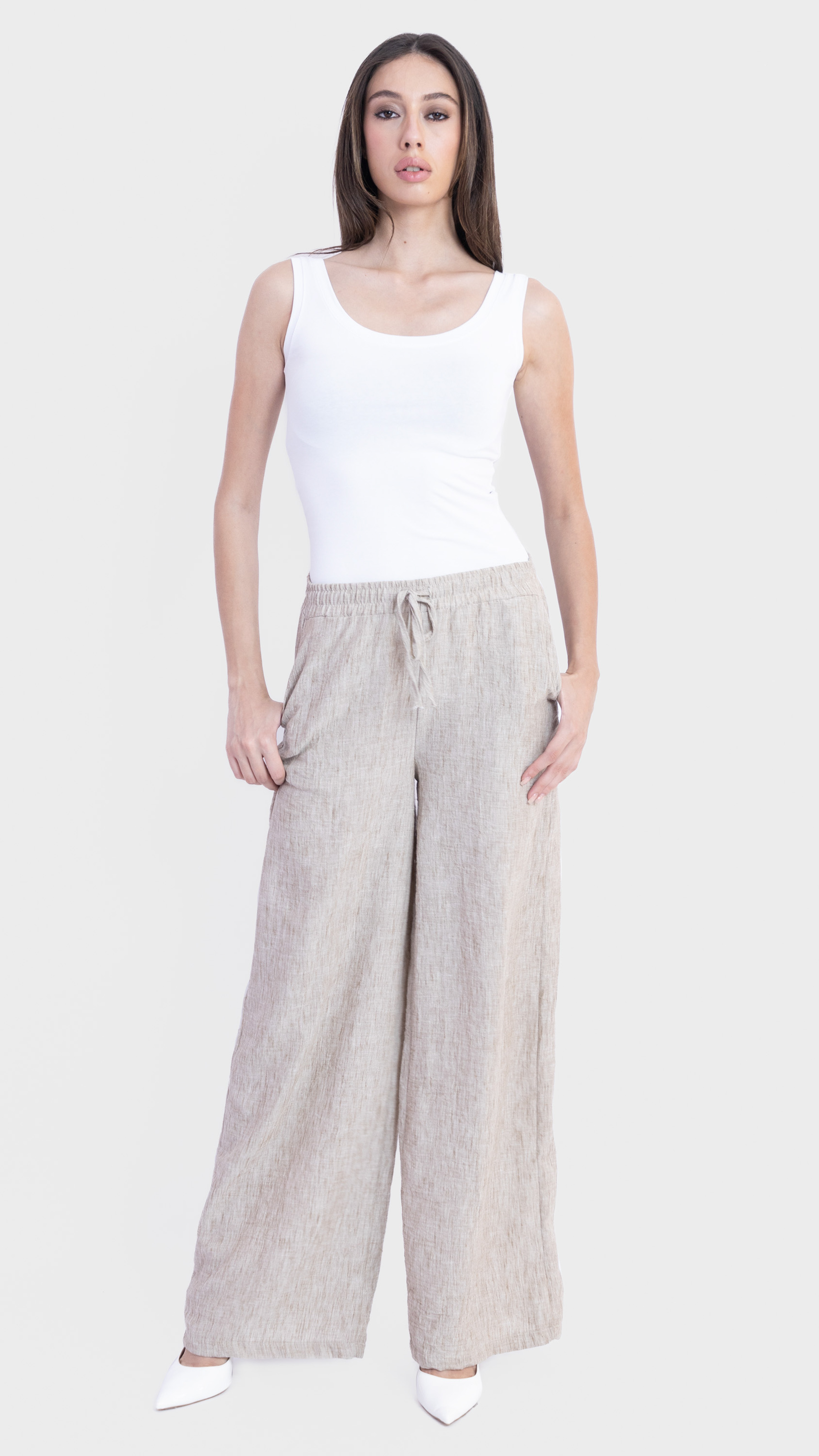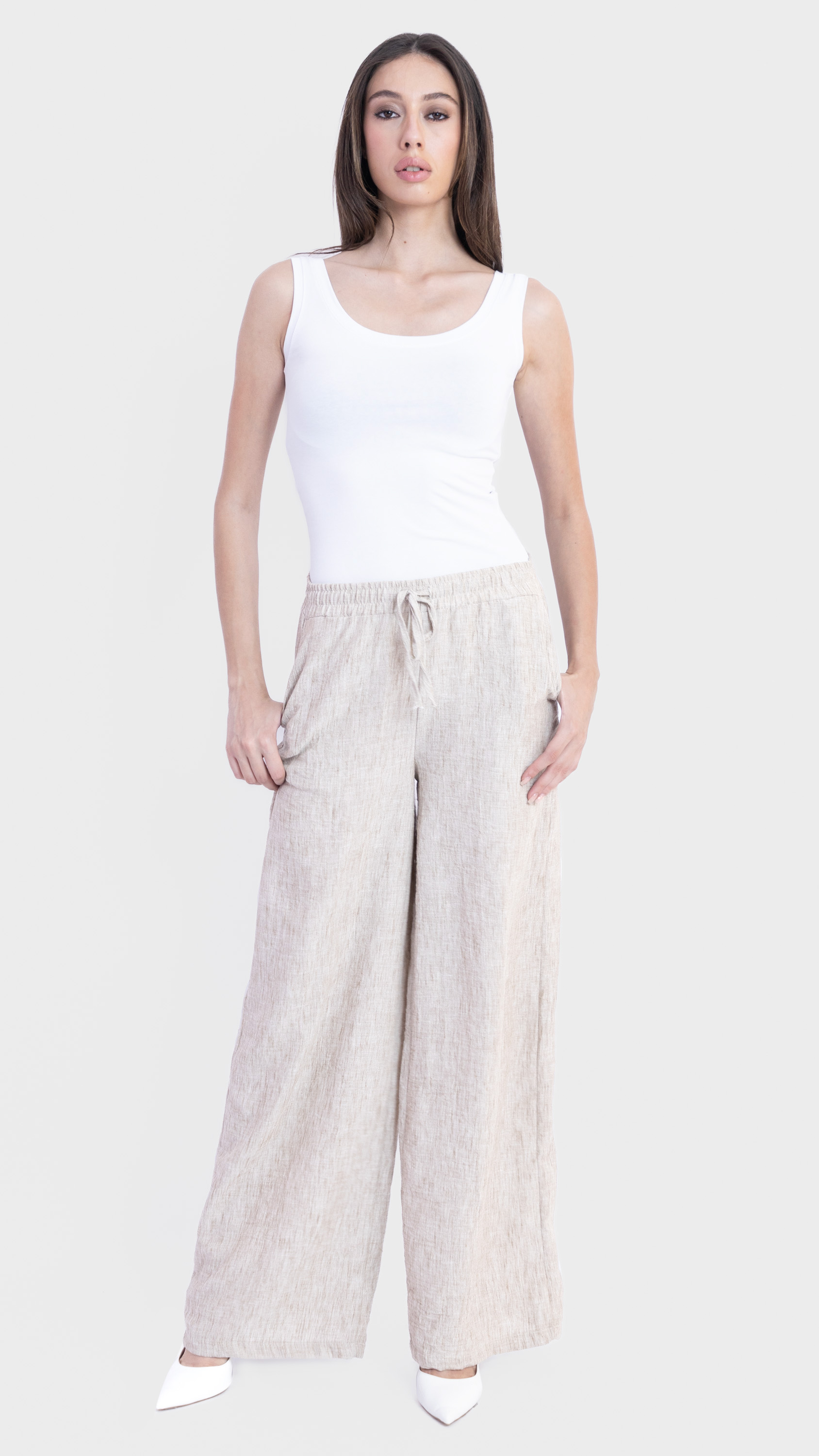These wide-leg linen-blend pants are designed for effortless comfort and casual style. Featuring an elasticated waistband with a drawstring tie, they offer a relaxed fit that is perfect for warm weather. The lightweight, breathable fabric ensures comfort all day long, while the minimalist design makes them easy to style for various occasions.