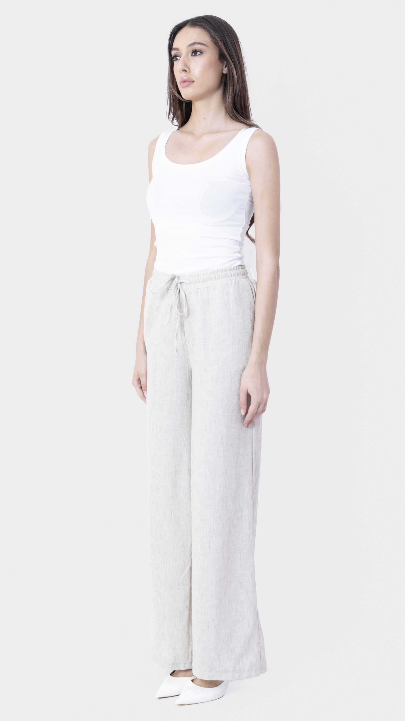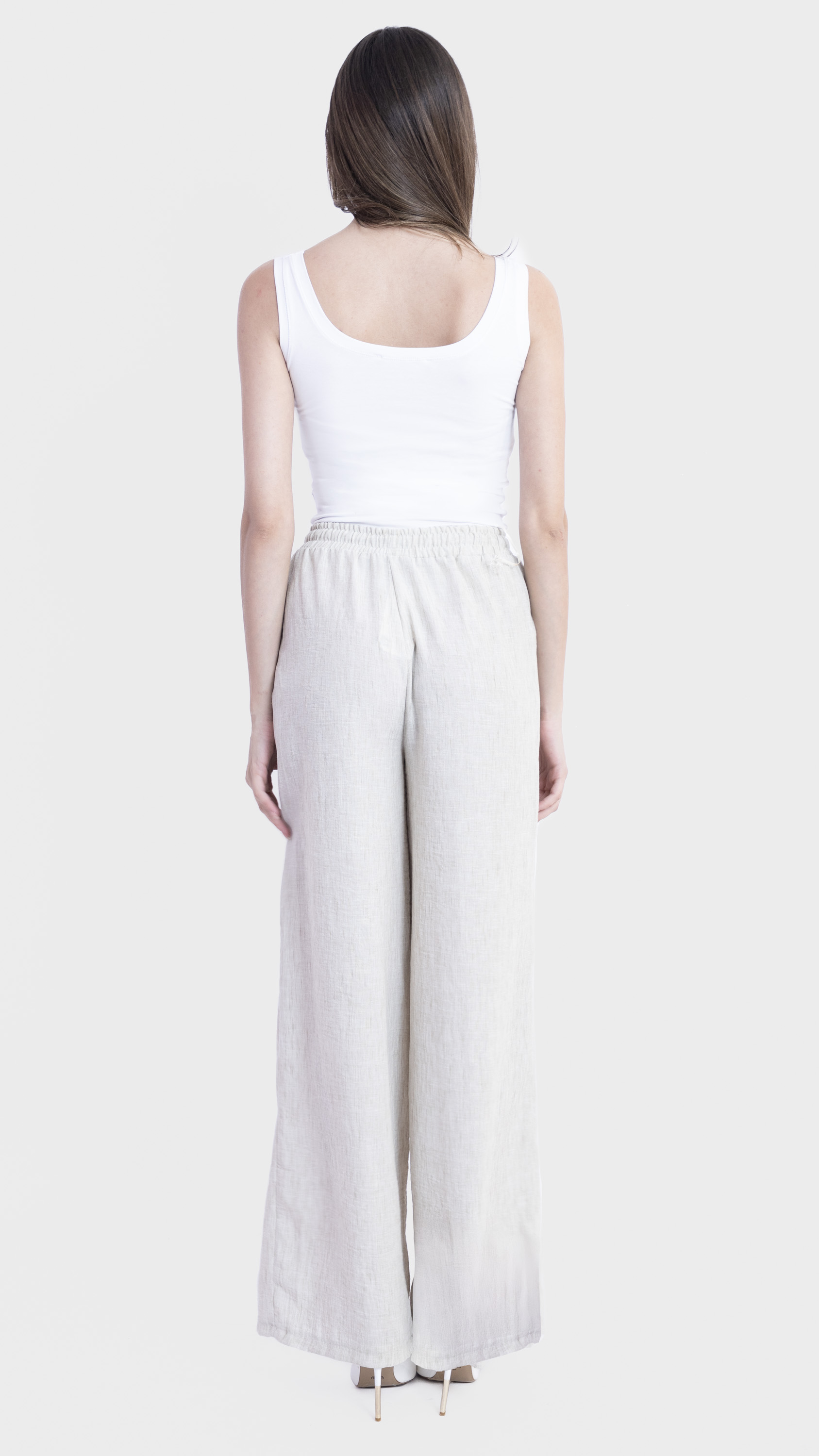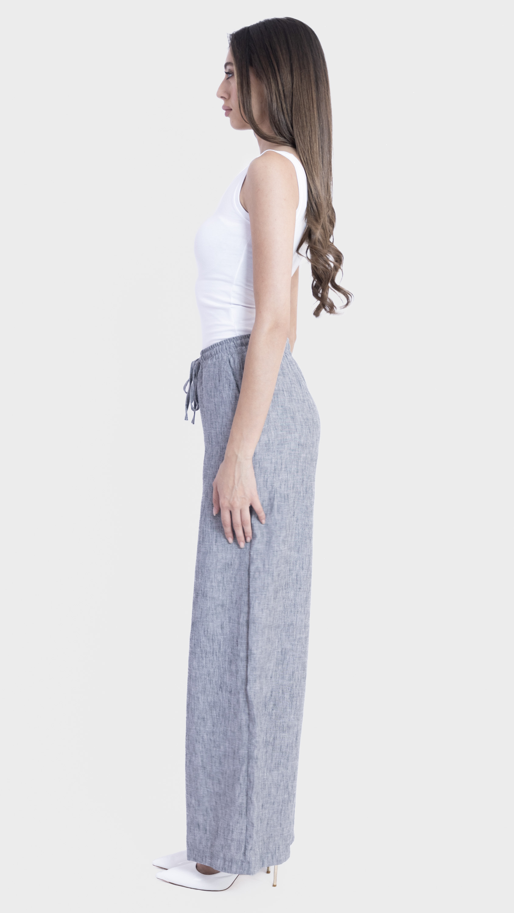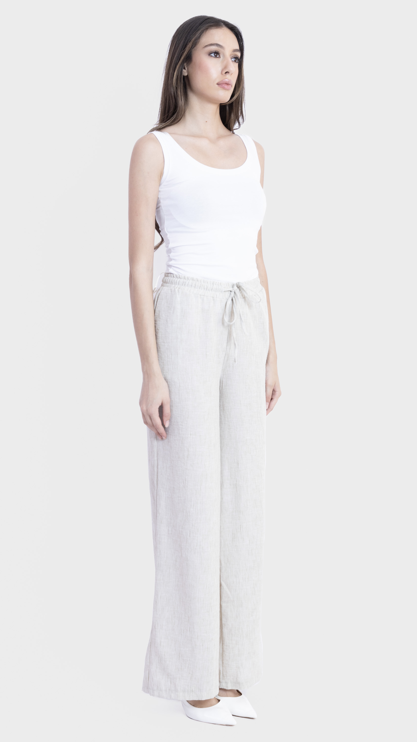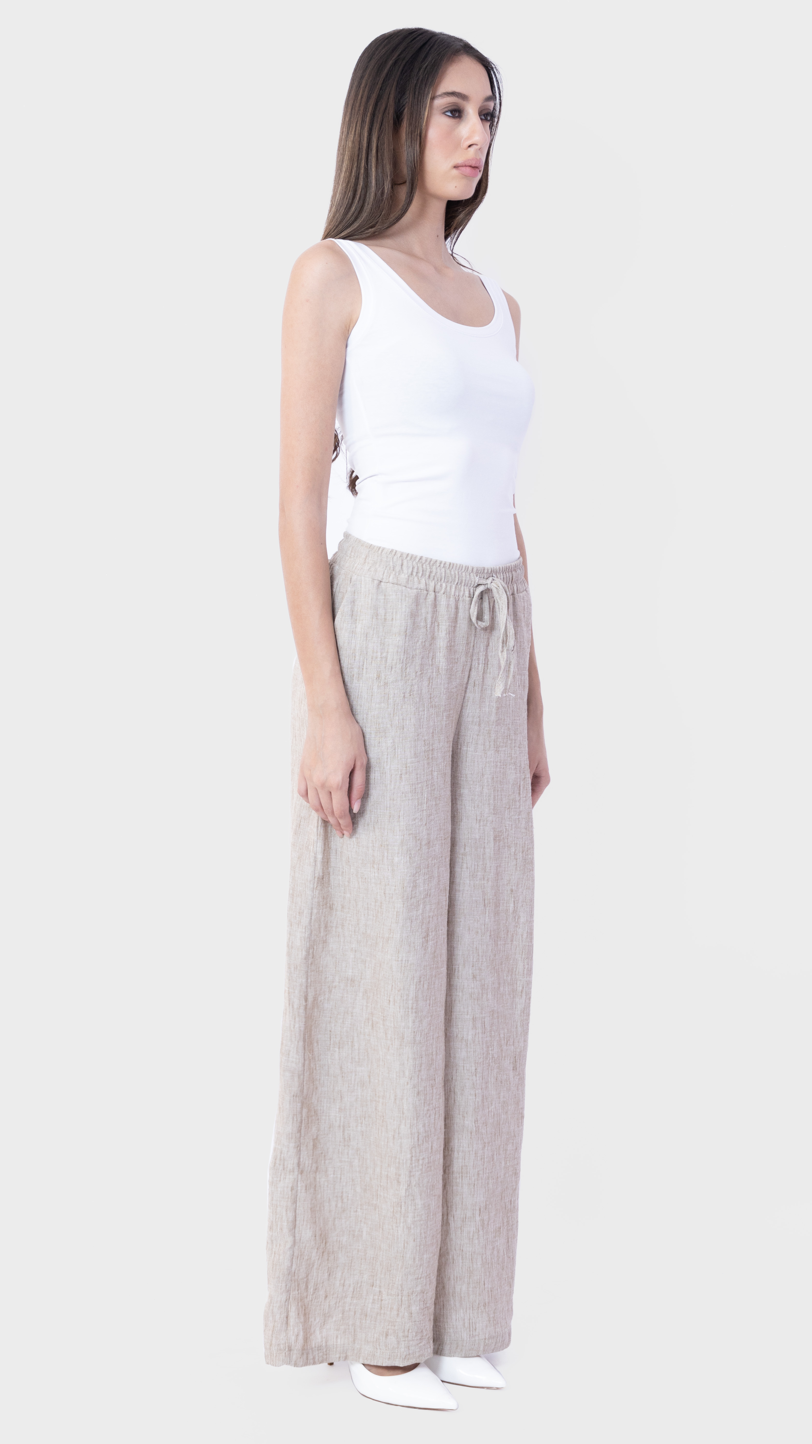 These wide-leg linen-blend pants are designed for effortless comfort and casual style. Featuring an elasticated waistband with a drawstring tie, they offer a relaxed fit that is perfect for warm weather. The lightweight, breathable fabric ensures comfort all day long, while the minimalist design makes them easy to style for various occasions.