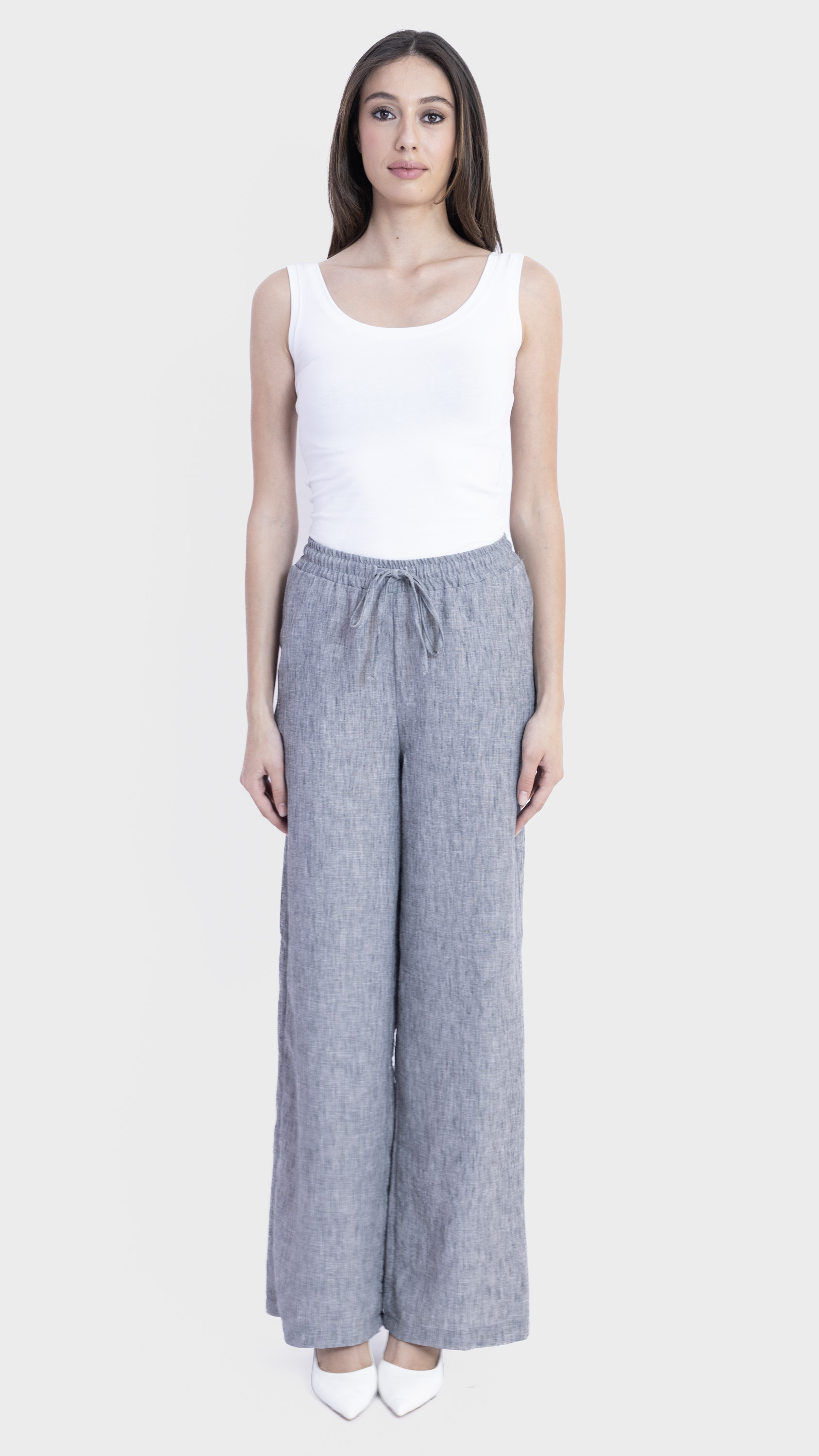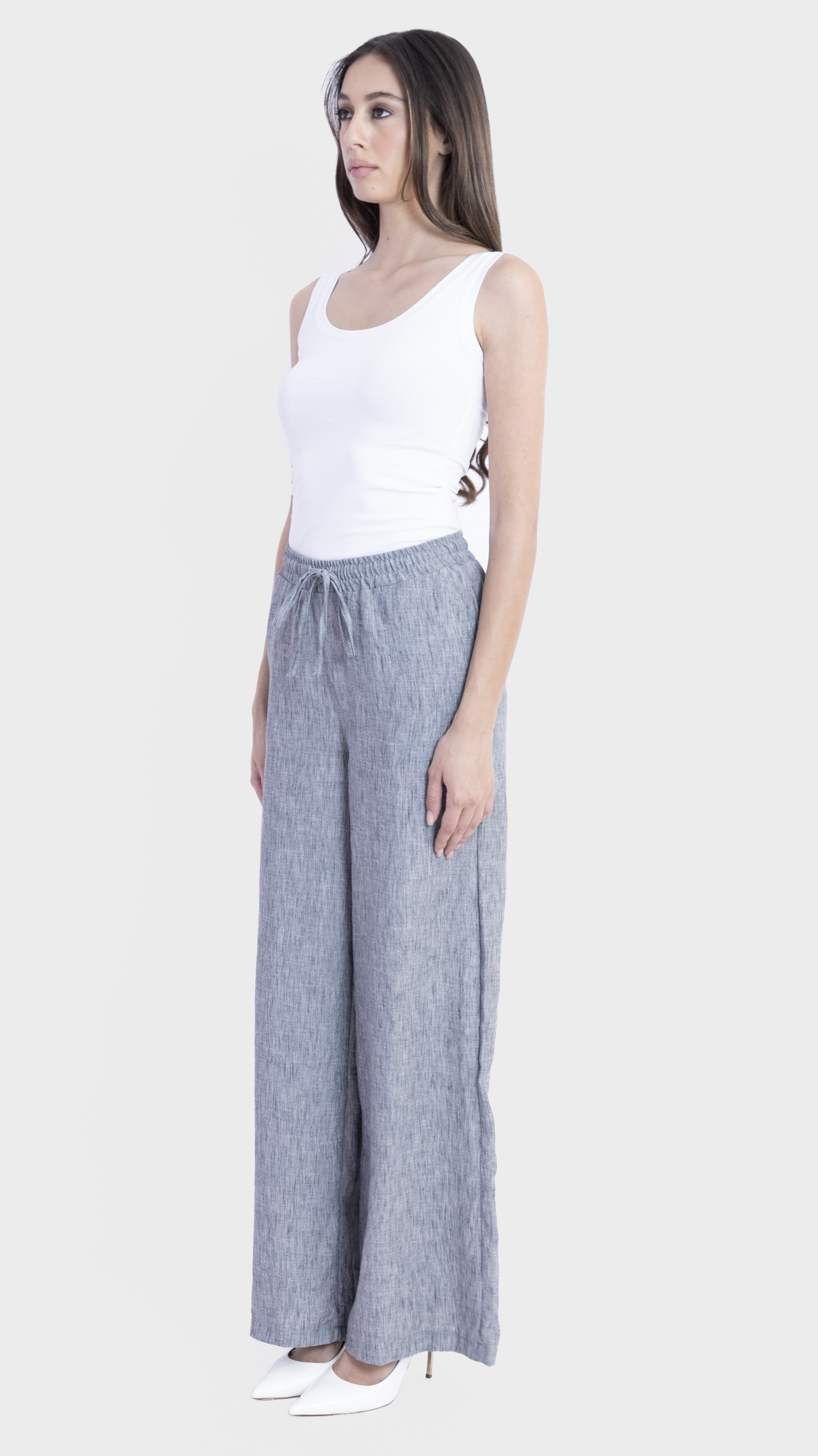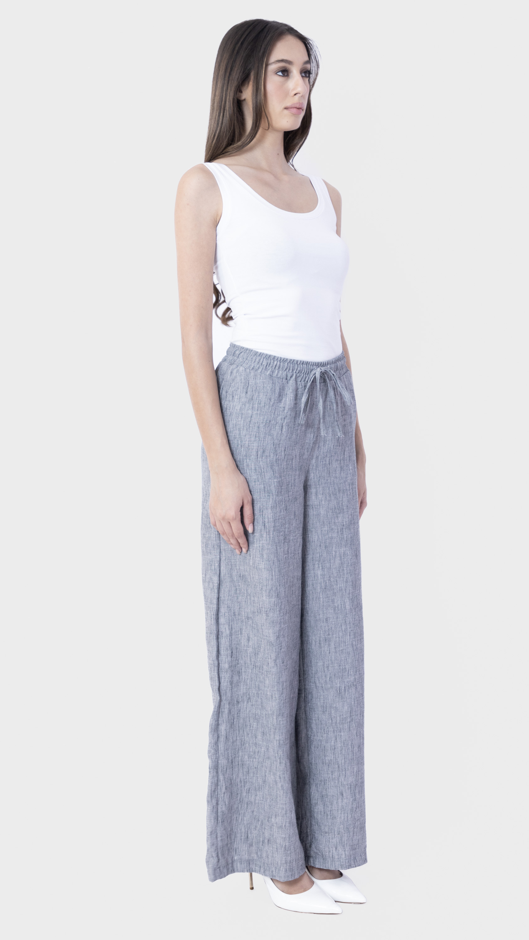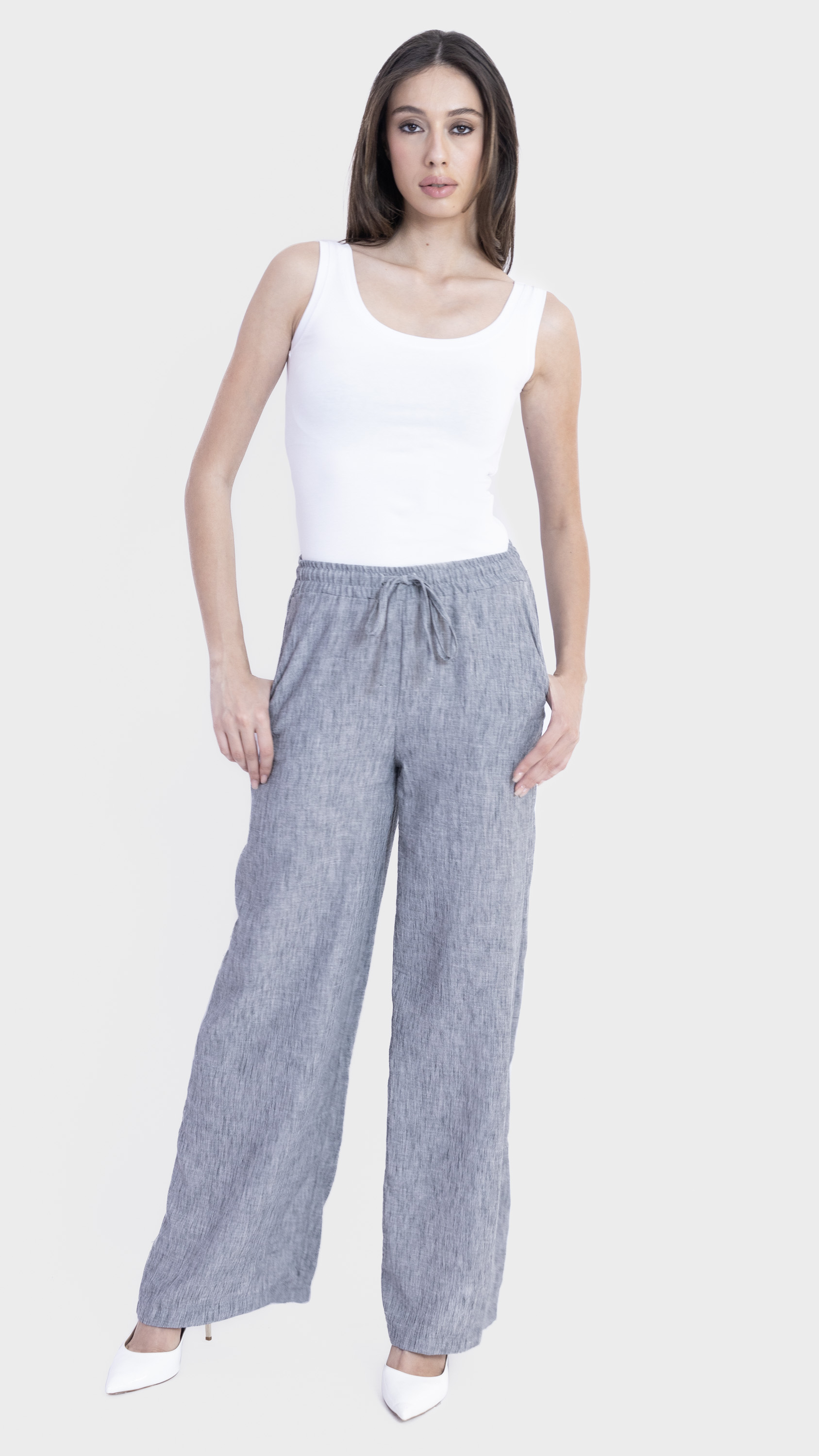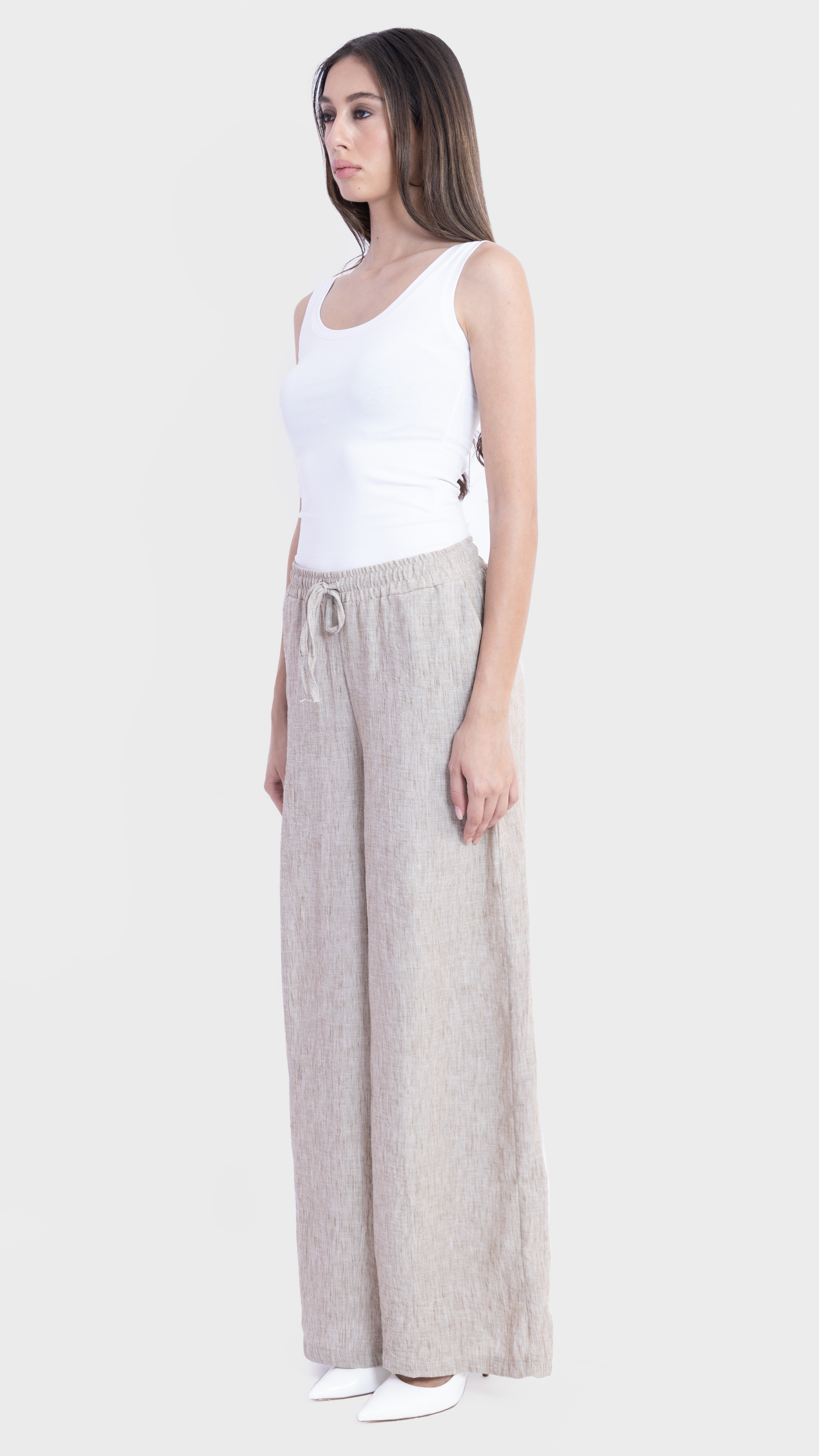 These wide-leg linen-blend pants are designed for effortless comfort and casual style. Featuring an elasticated waistband with a drawstring tie, they offer a relaxed fit that is perfect for warm weather. The lightweight, breathable fabric ensures comfort all day long, while the minimalist design makes them easy to style for various occasions.