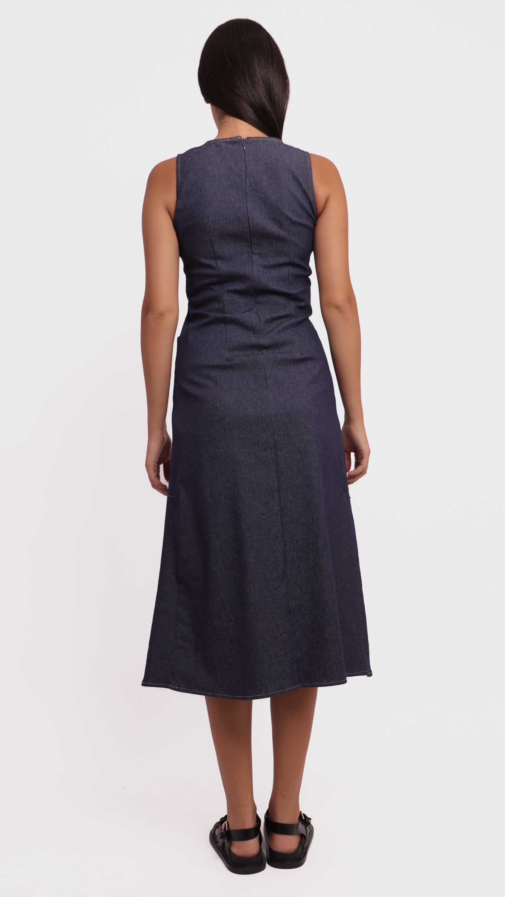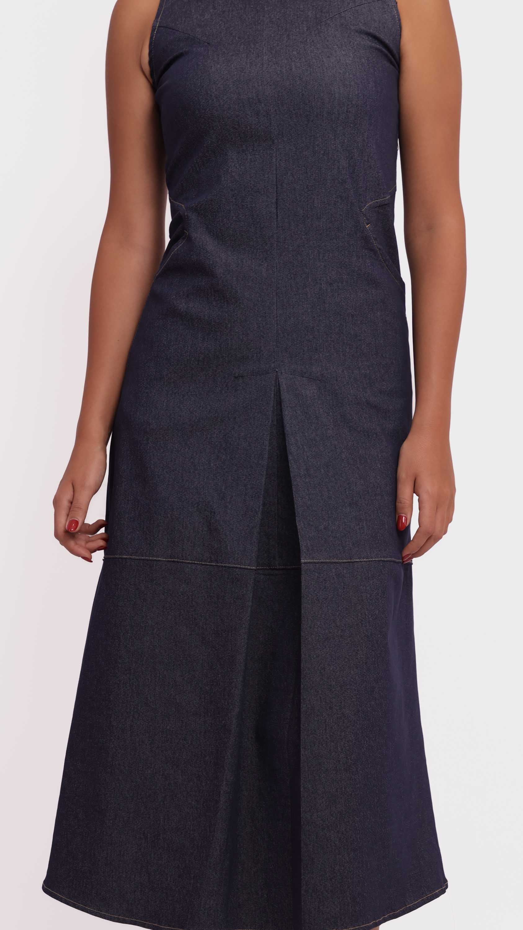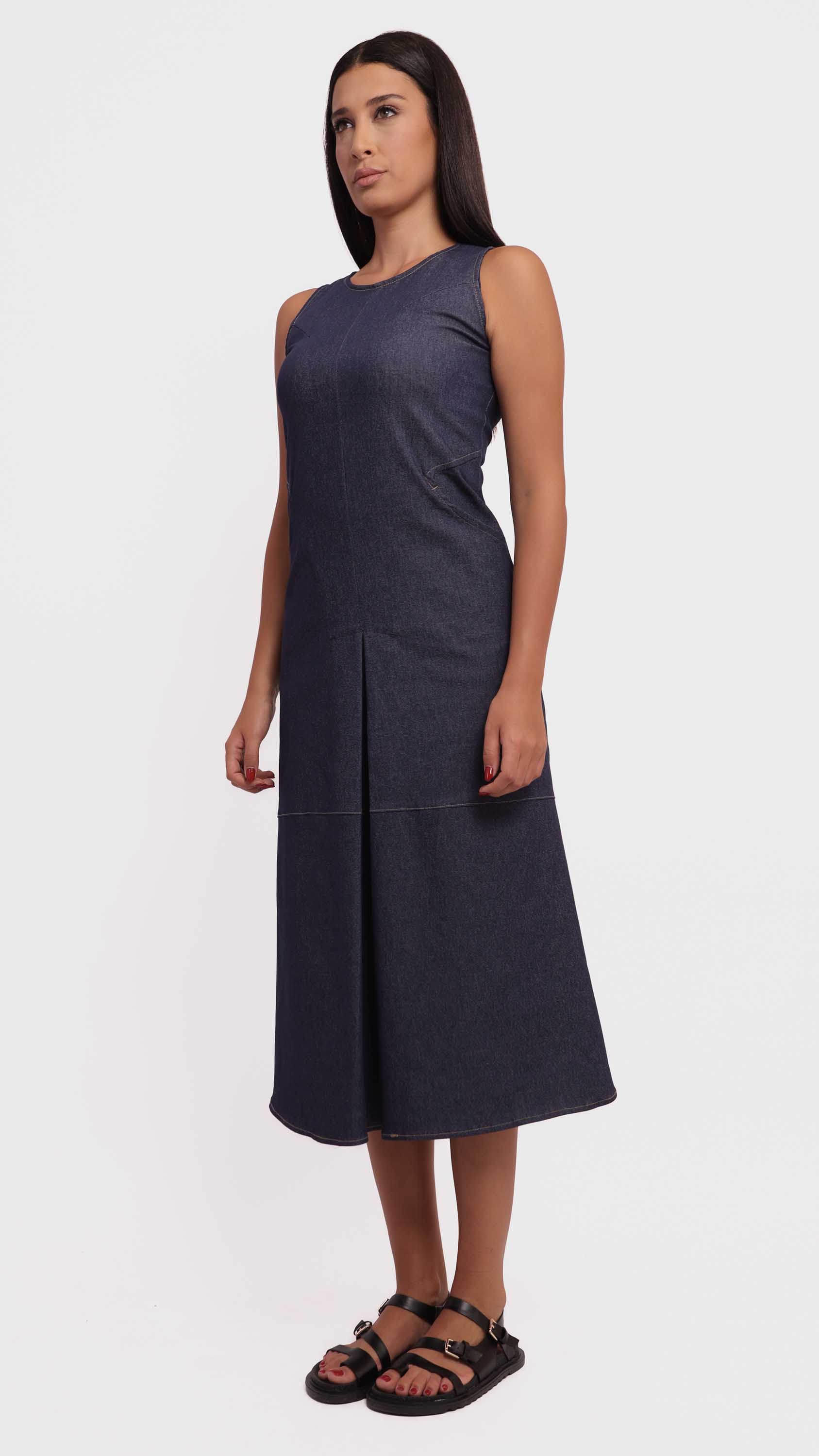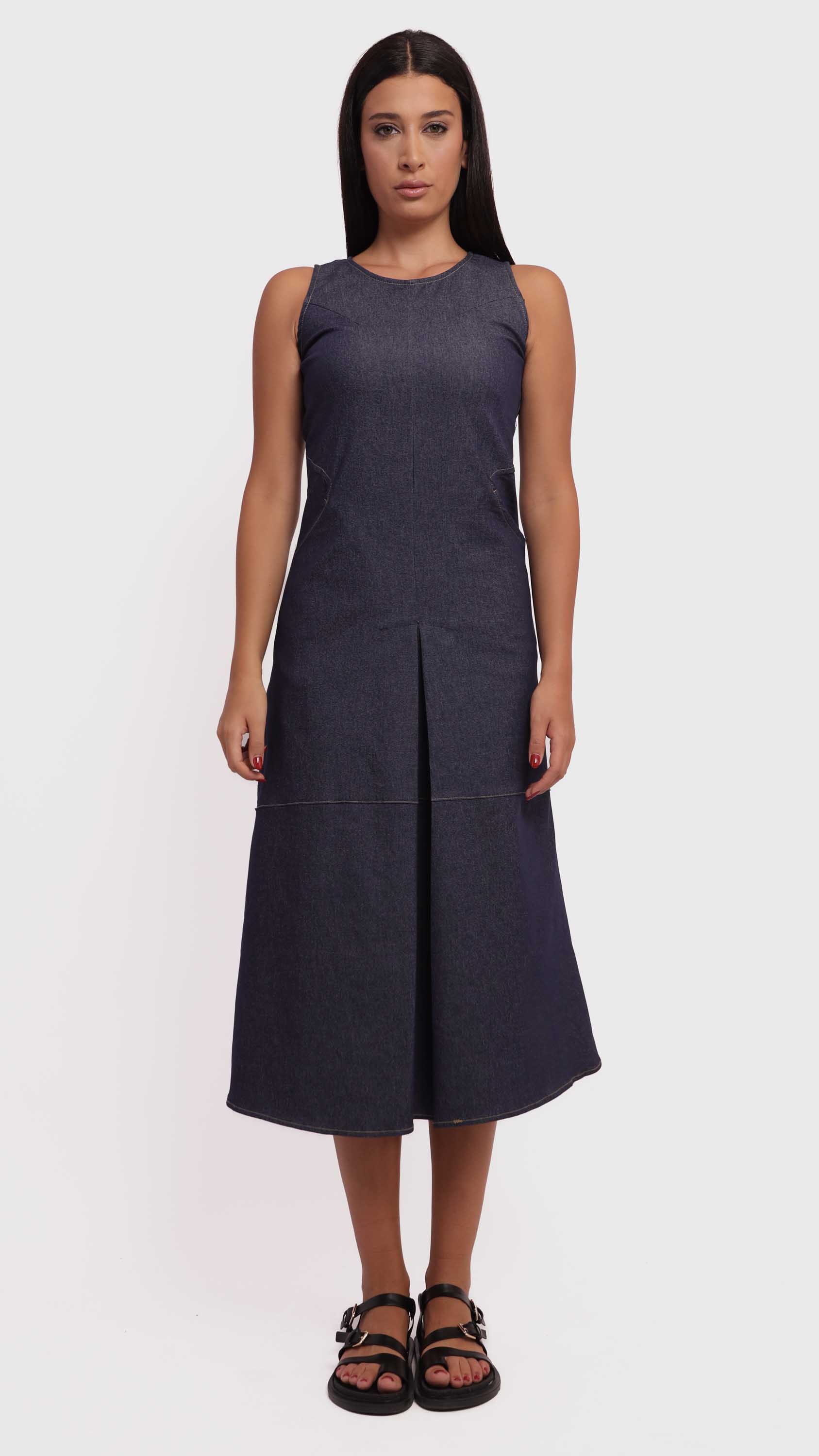 A chic and versatile sleeveless denim dress, featuring a round neckline and a flared bottom with front pleat detailing. Perfect for casual outings or layering with your favorite jackets and accessories for a trendy everyday look.