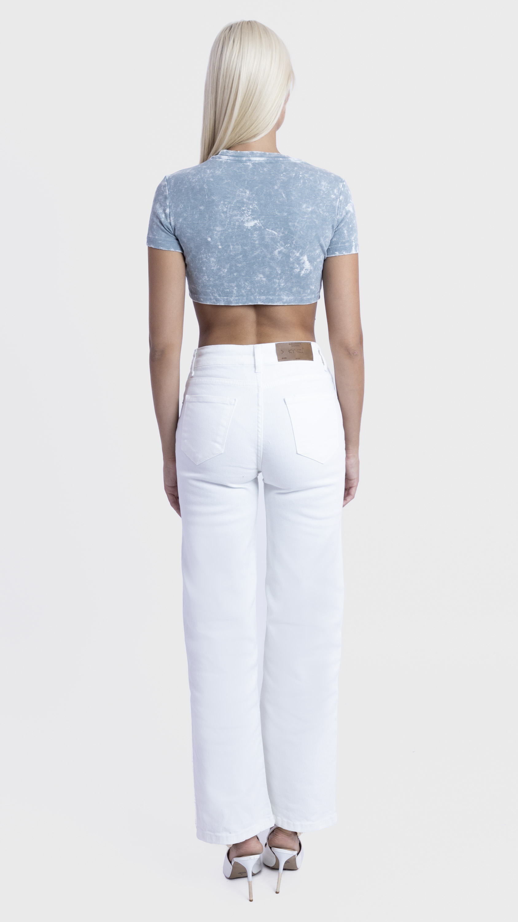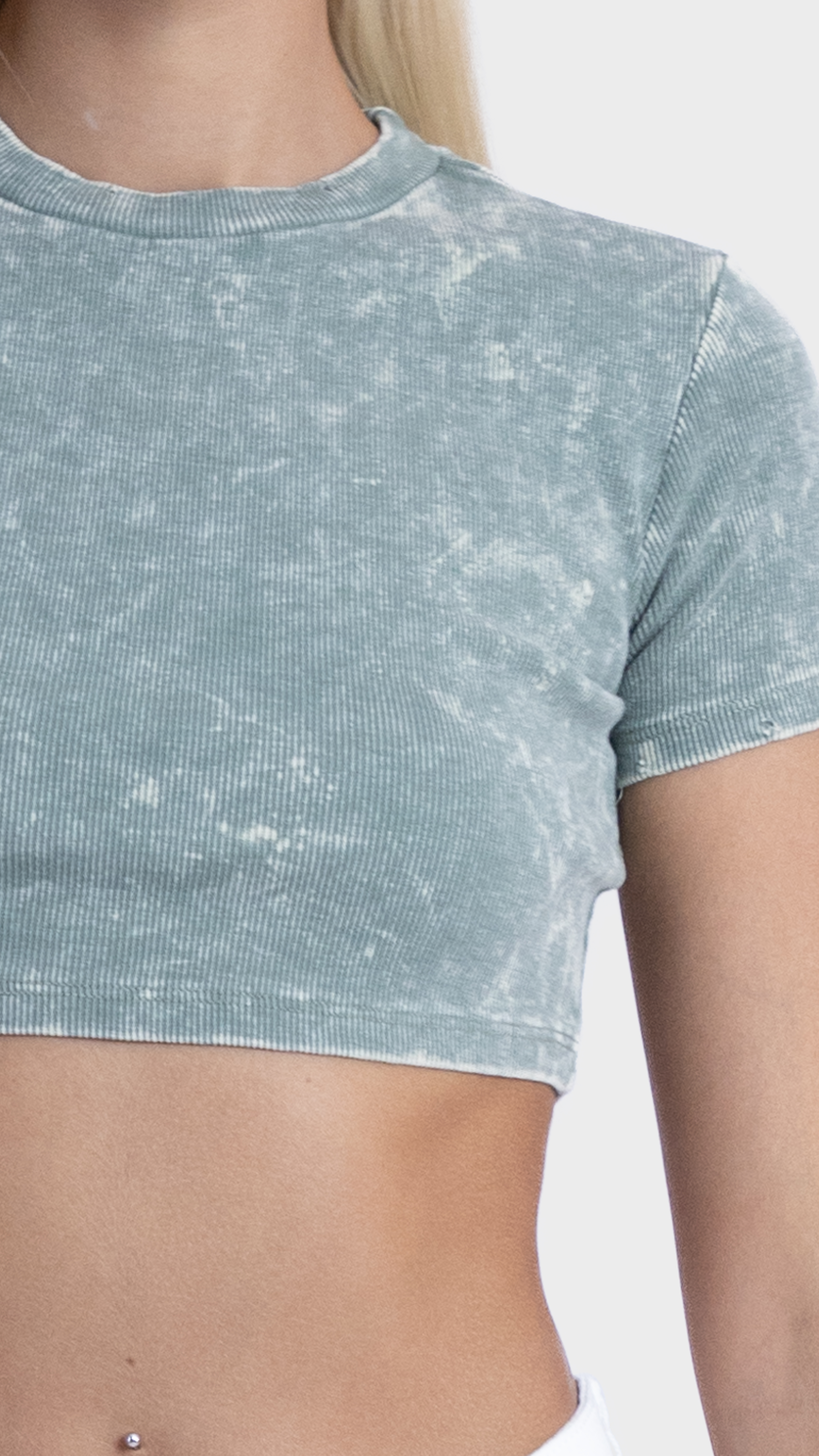 Give your casual wardrobe a fresh update with this acid-wash ribbed cropped T-shirt. Made from a soft and stretchy cotton-blend fabric, it features a light grey/blue acid-wash finish that brings an edgy, lived-in vibe. Designed with a crew neckline, short sleeves, and a fitted, cropped silhouette, this piece is perfect for pairing with high-waisted jeans, joggers, or skirts for a cool and effortless look.